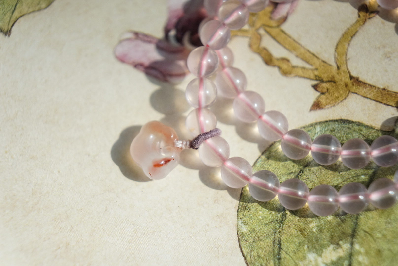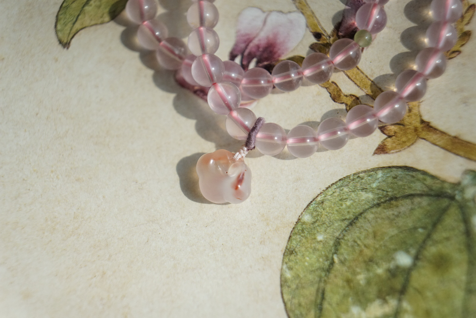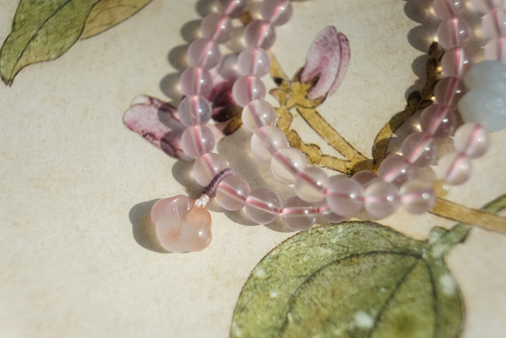 搭配的烟紫和田玉并蒂莲,我们蜜桃很甜十年一线卖和田玉,品控优秀,所以每个搭配的细节,都很考究。不做批量批发,一款只有一条,也不能复制。吊坠也是方方面面品控ok,冰飘花的南红玛瑙如意,每个细节,都尽量做好。