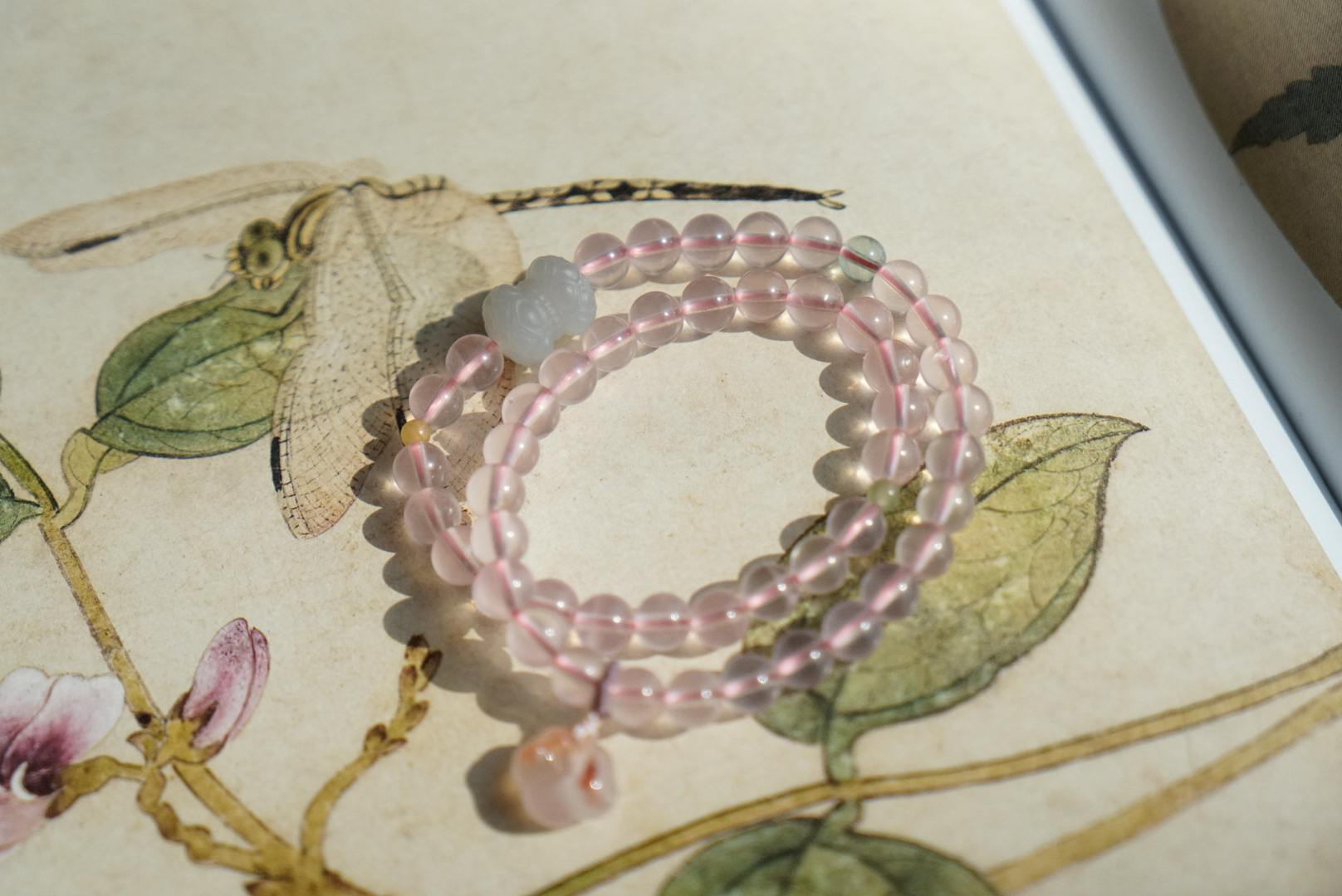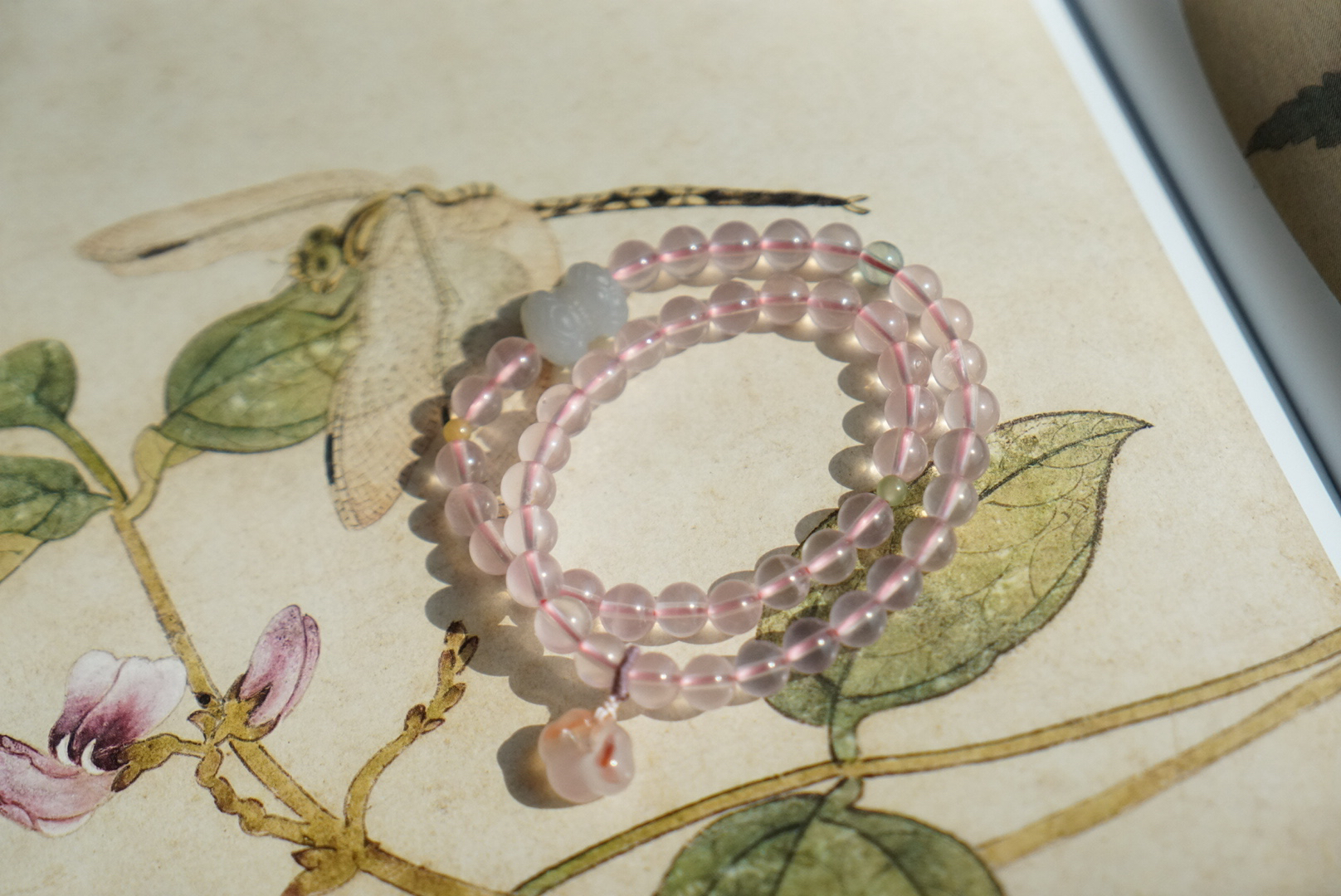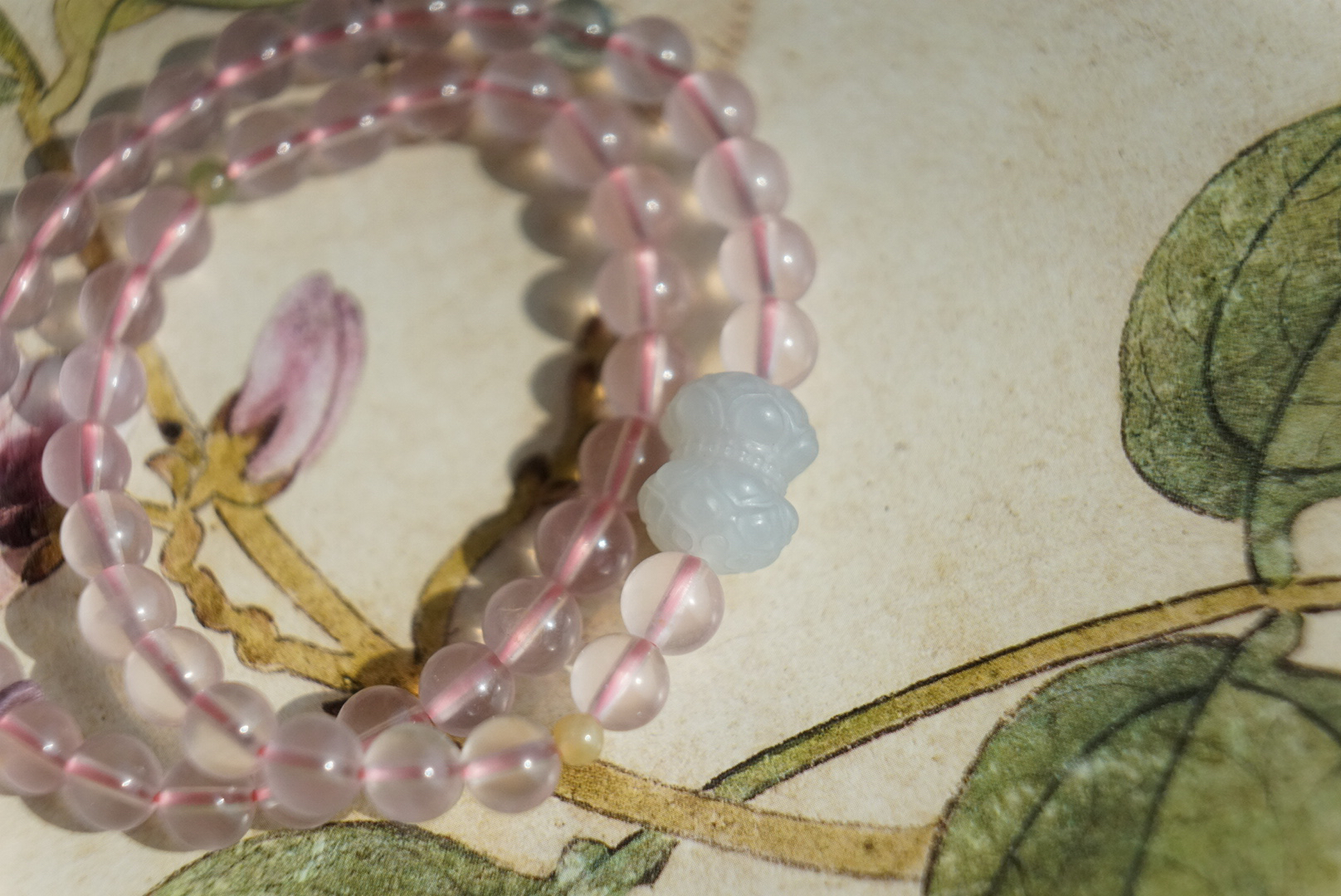 搭配的烟紫和田玉并蒂莲,我们蜜桃很甜十年一线卖和田玉,品控优秀,所以每个搭配的细节,都很考究。不做批量批发,一款只有一条,也不能复制。吊坠也是方方面面品控ok,冰飘花的南红玛瑙如意,每个细节,都尽量做好。