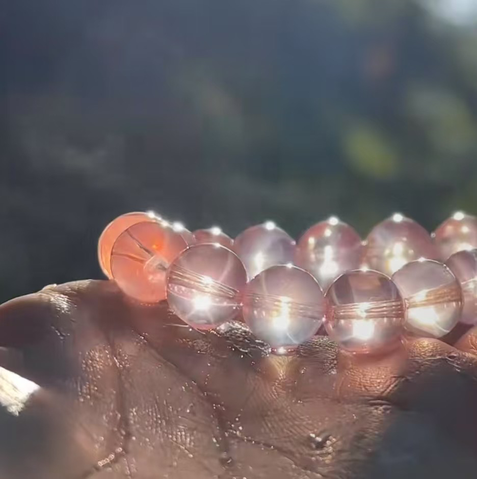 可人儿的星光粉晶,(实际点儿说明白:灯光下才能看到),颜色非常温柔啊非常柔和,非常干净的质地,现在粉晶多种多样,要说我真的非常喜爱想亲近的,就是这批的质感,果冻版润泽,水嘟嘟的,主要是这个粉不抢肤色,无论你是白皮肤,黄皮,戴着都很漂亮柔和,安安静静的,亲切的,甜美的,怎么说呢,很清净,又很甜。