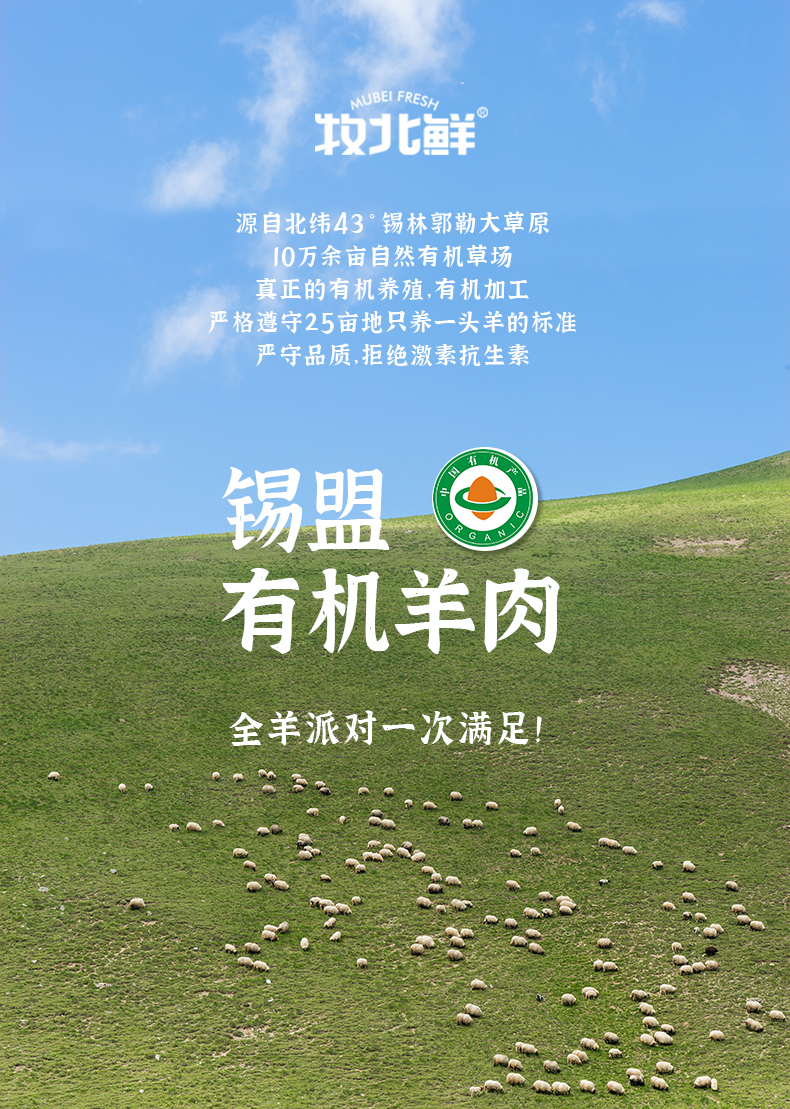 - “牧北鲜”是蒙味牧场公司旗下专注于有机牧场养殖,有机农产品种植、有机牛羊肉深加工的品牌。公司秉承“尊重自然,倡导有机生活”的经营理念, 从源头严控有机牛羊肉品质,推动绿色消费升级,让品质生活触手可及