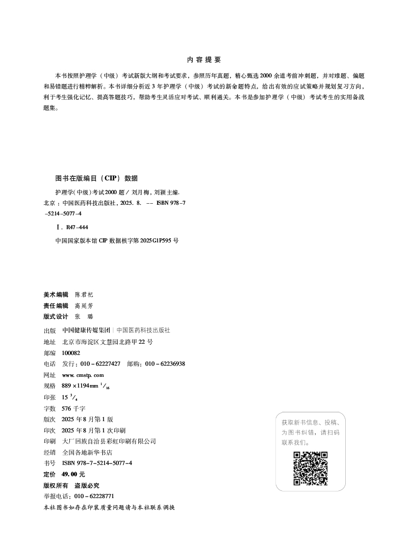 护理学(中级)考试2000题(2026护考应急包)刘月梅 刘颖 护理学(中级)考试考生的实用备战题集 9787521450774中国医药科技出版社