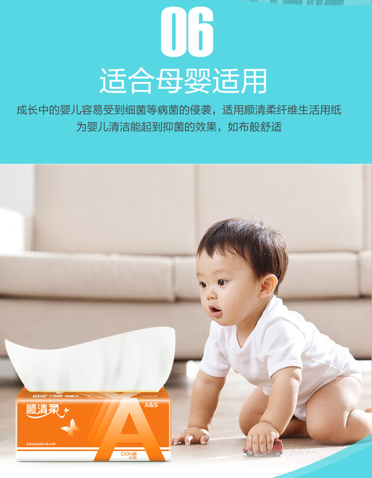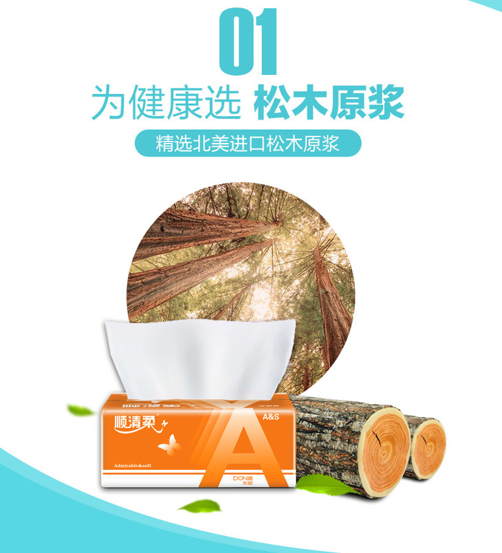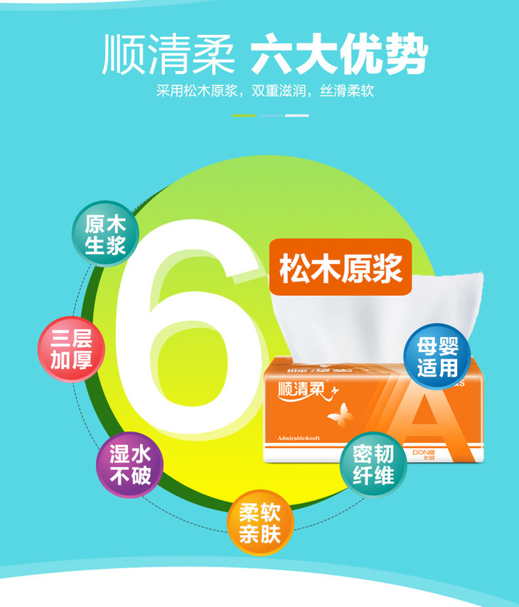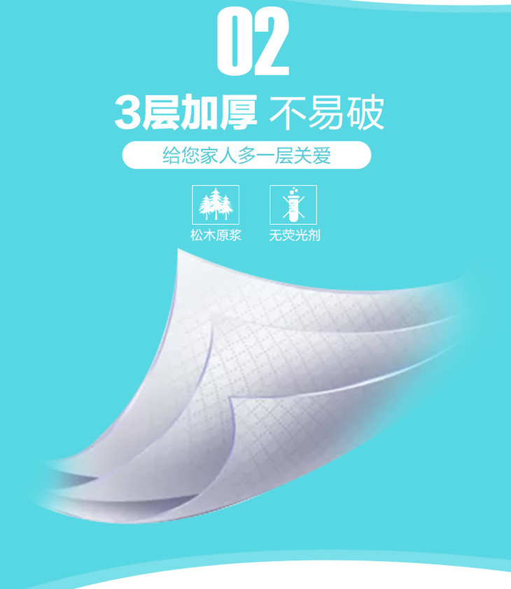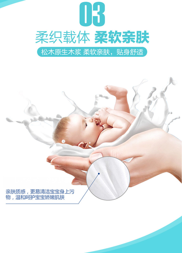 产品卖点:为健康选松木原浆,3层加厚不易破,柔织载体柔软亲肤,韧性十足湿水不破,密韧纤维密织柔韧,适合母婴使用。
