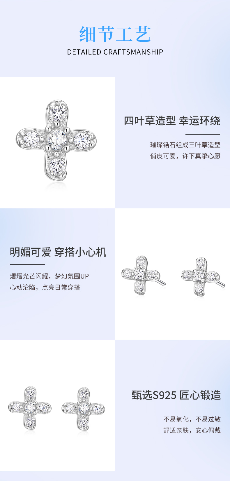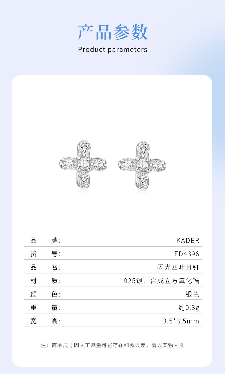 卡蒂罗/KADER 闪光四叶耳钉 幸运四叶草精致小巧睡觉免摘耳饰 俏皮可爱满钻吸睛秋冬简约配饰 925银