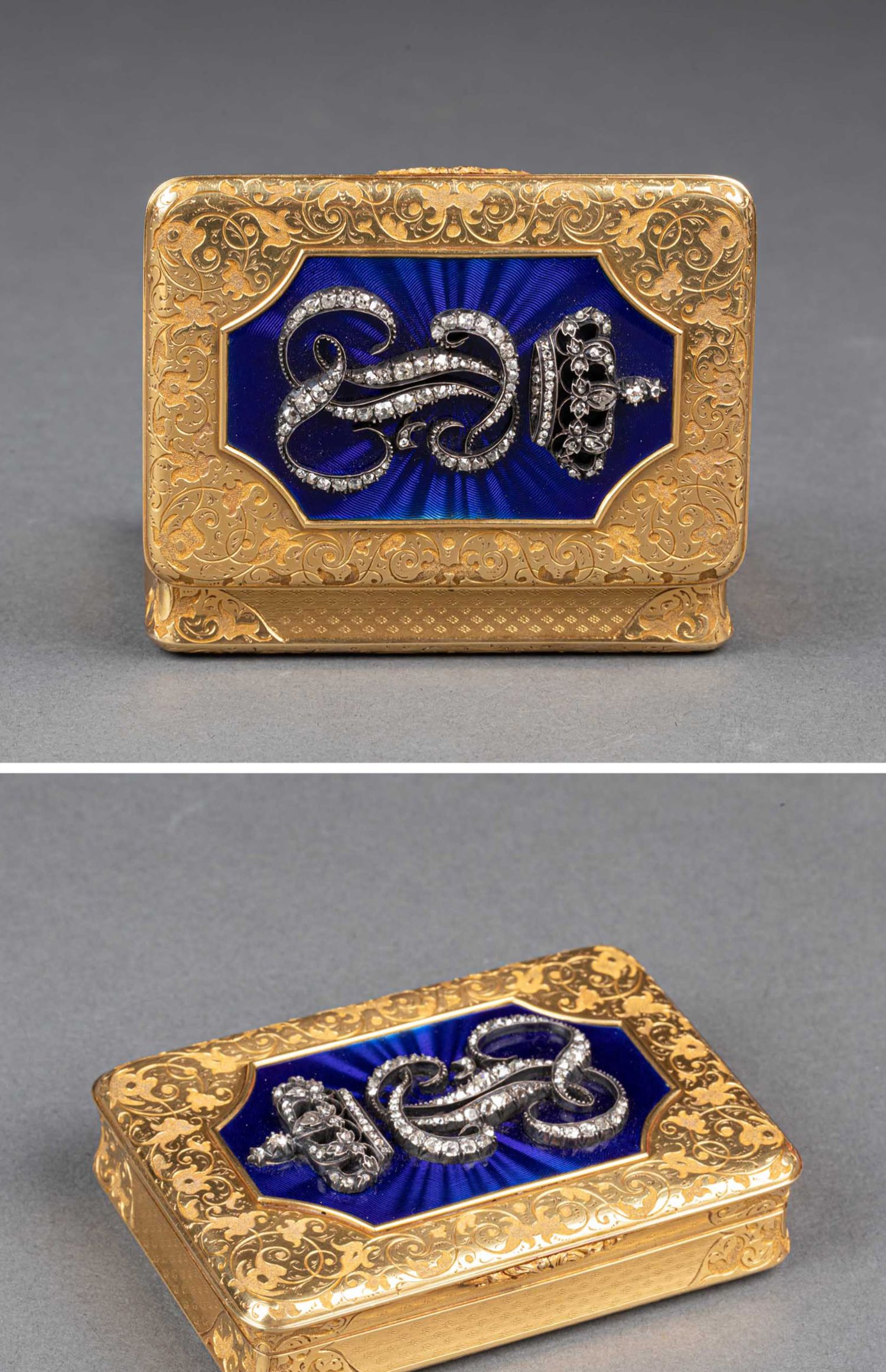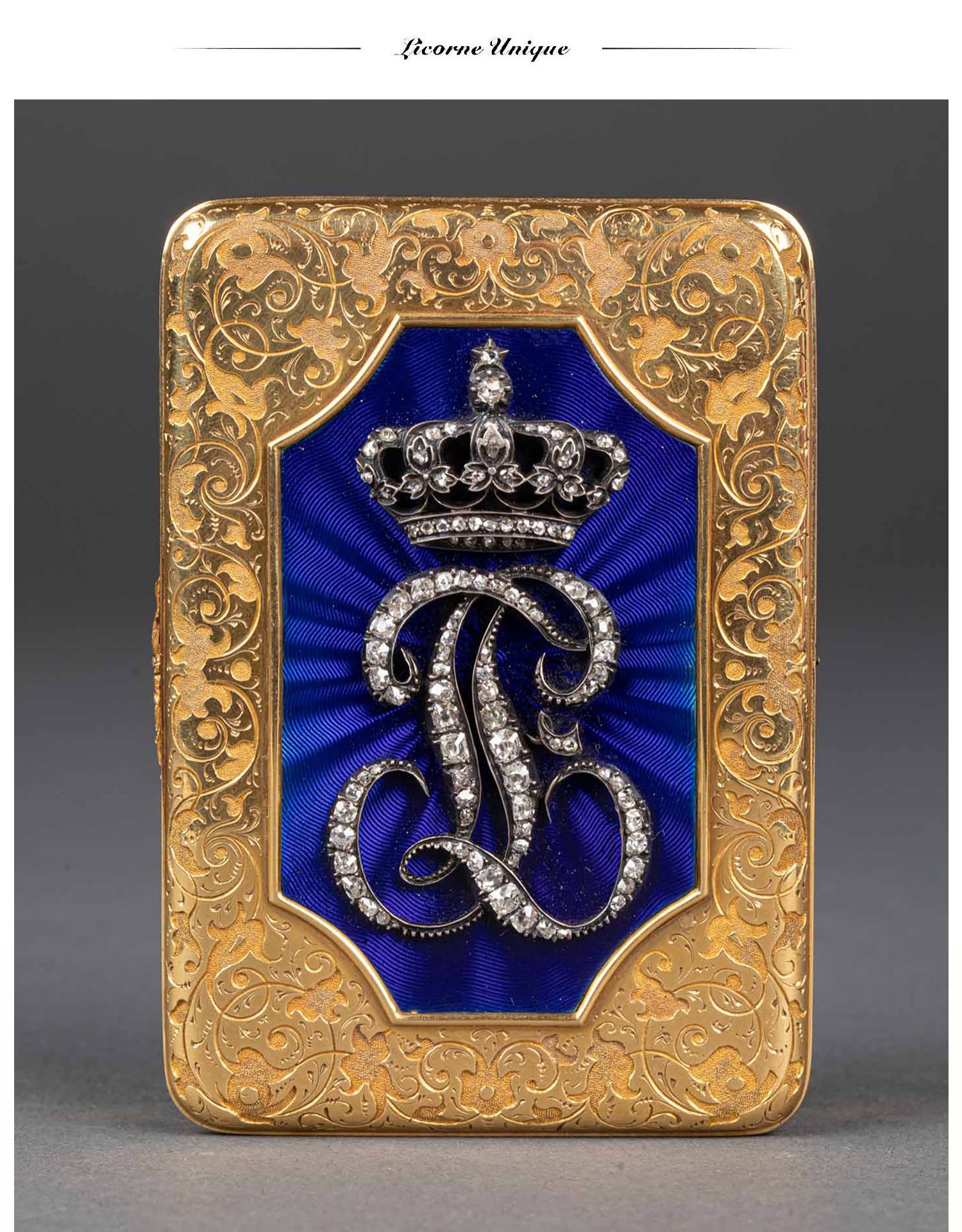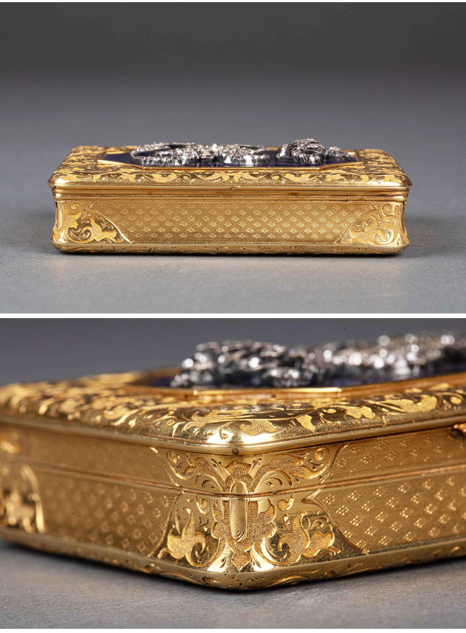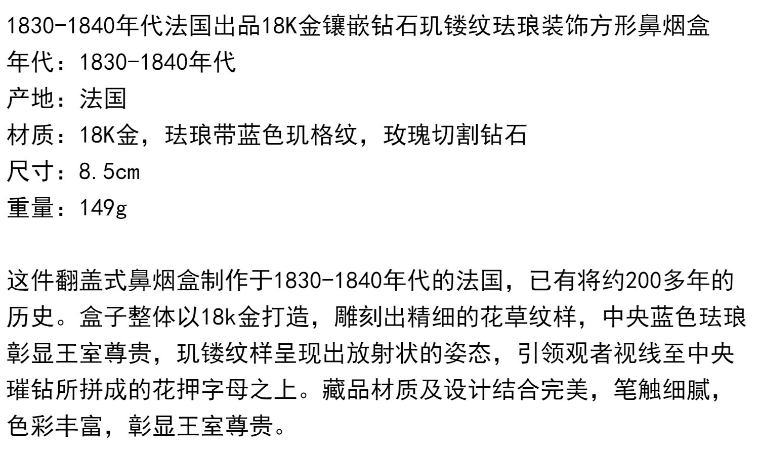 独角鹿西洋古董法国18K金镶嵌钻石玑镂纹珐琅装饰方形鼻烟盒