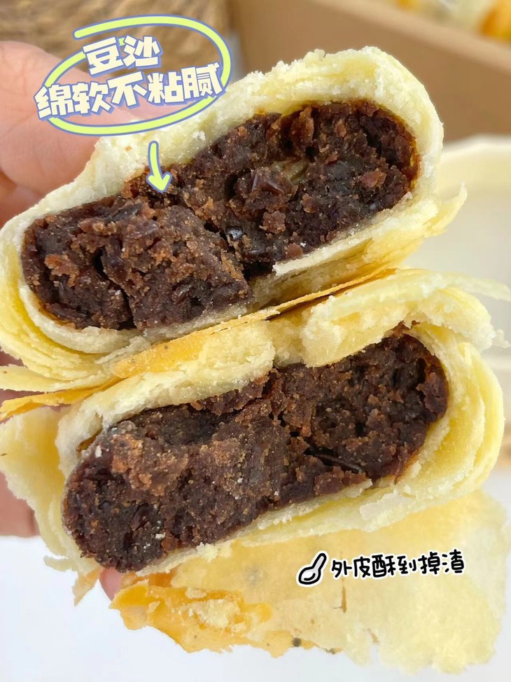 全程纯手工制作,外皮酥松,内馅绵甜细腻,甜度适中,吃起来不会黏腻。