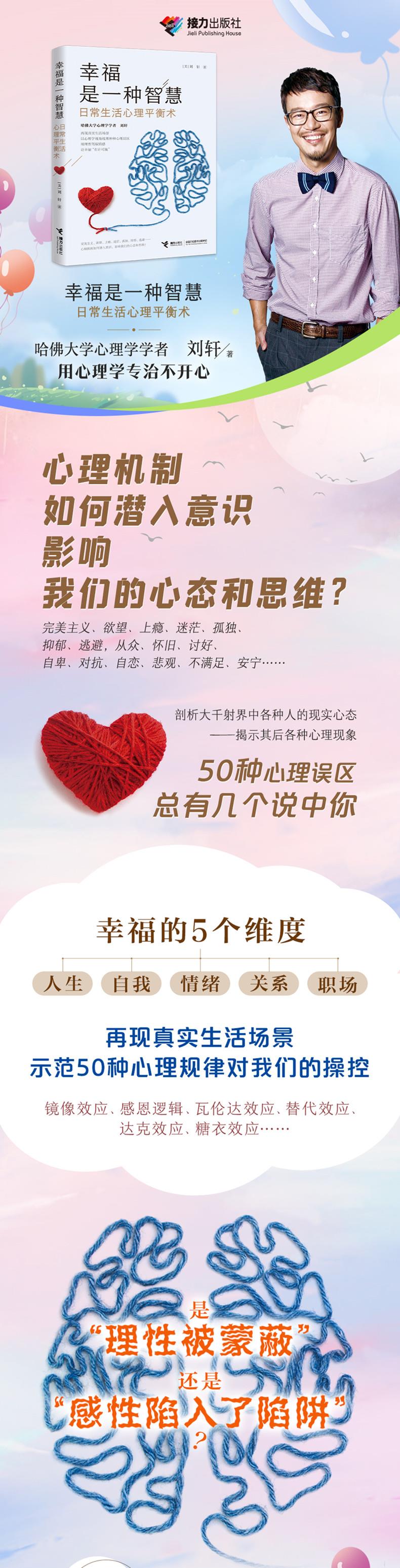 本书是哈佛大学心理学学者刘轩的新作。书中剖析了大干社会中各种人等当下的现实心态,反映出当下社会的种种心理现象,比如追求完美、难以控制的欲望、上瘾、迷茫、孤独、抑郁、逃避、失衡、从众、怀旧、讨好、自卑、对抗、自恋、悲观、不满足……作者以心理学家的视角敏锐地洞察到其背后起作用的心理机制,比如达克效应、超常刺激、感恩思维、镜像效应、高自信灰色人……作者以自己切身的体悟,运用心理学原理,寻求幸福的智慧,帮助读者认知自我,认知社会,从而找到心理调适的方法和秘诀,让我们在生活工作中走出心理问题陷阱,获得更多的幸福。