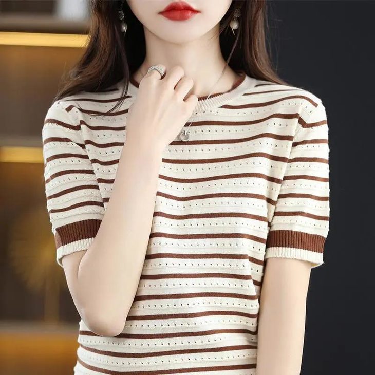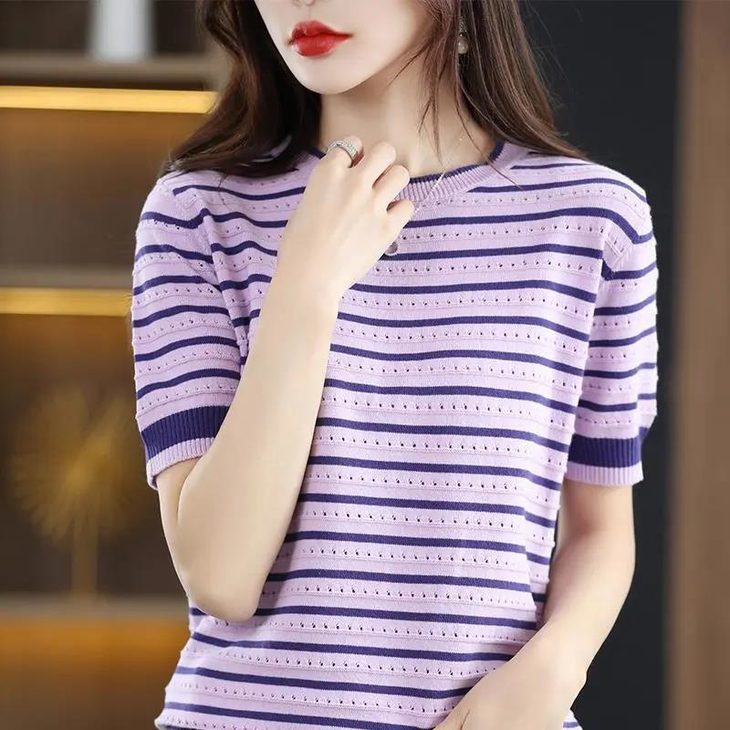 薄款冰丝韩版拼色条纹镂空圆领宽松百搭针织衫