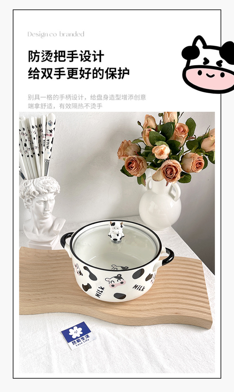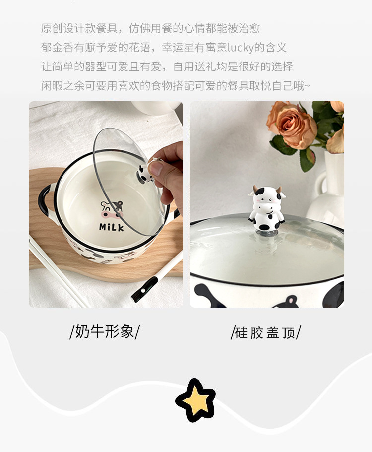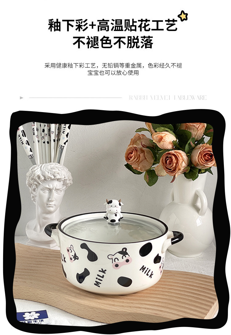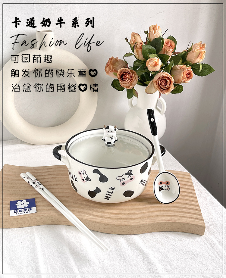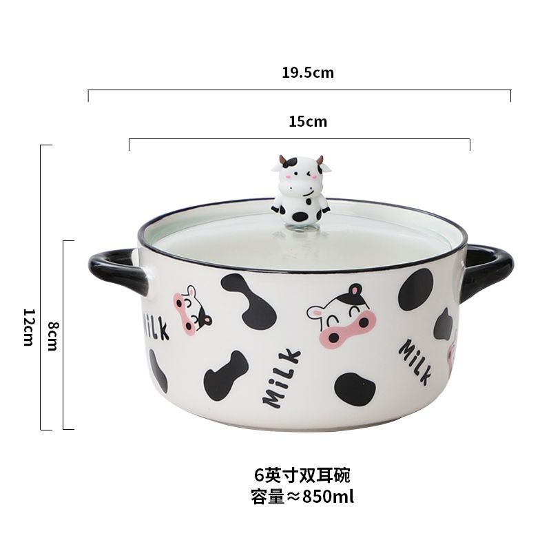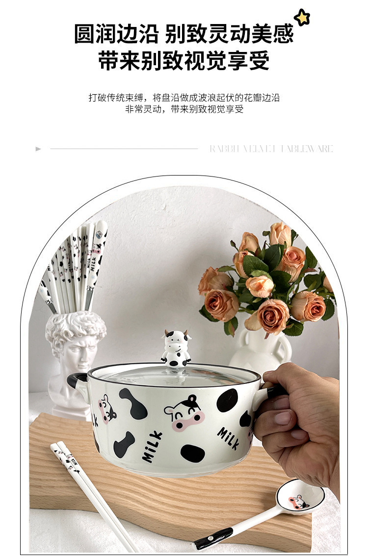 【防烫把手设计!给双手更好的保护】ins可爱奶牛双耳带盖泡面碗少女心宿舍家用陶瓷碗餐具耐热高颜值。ry