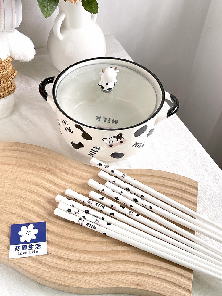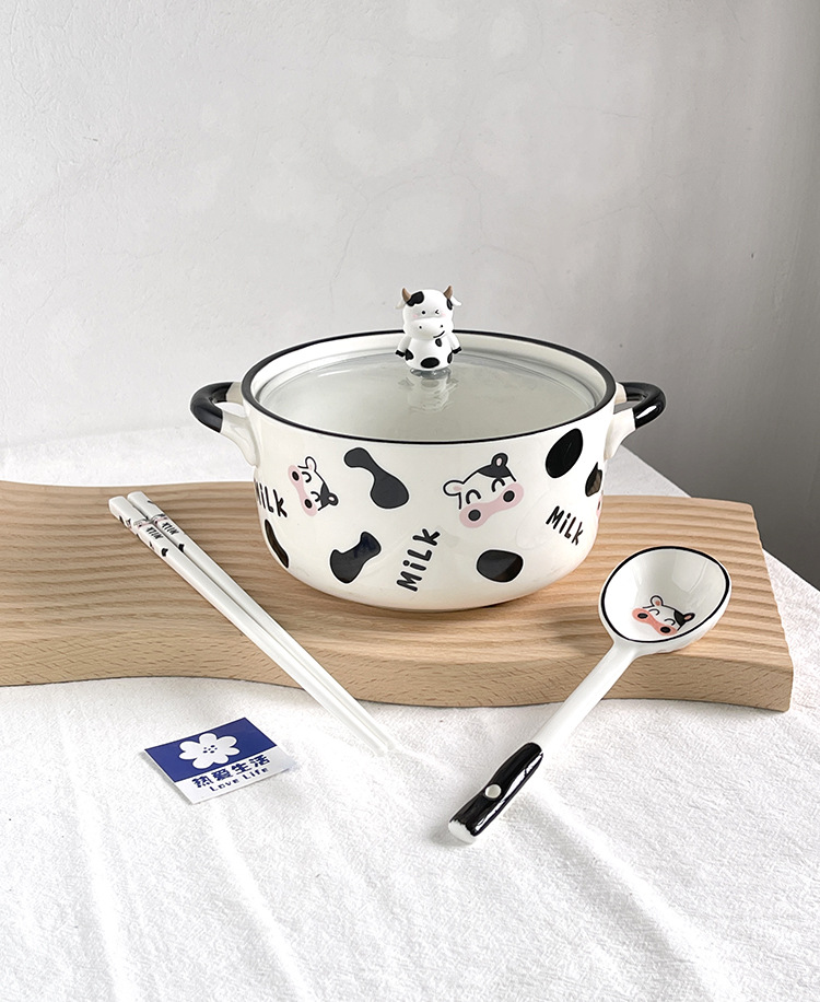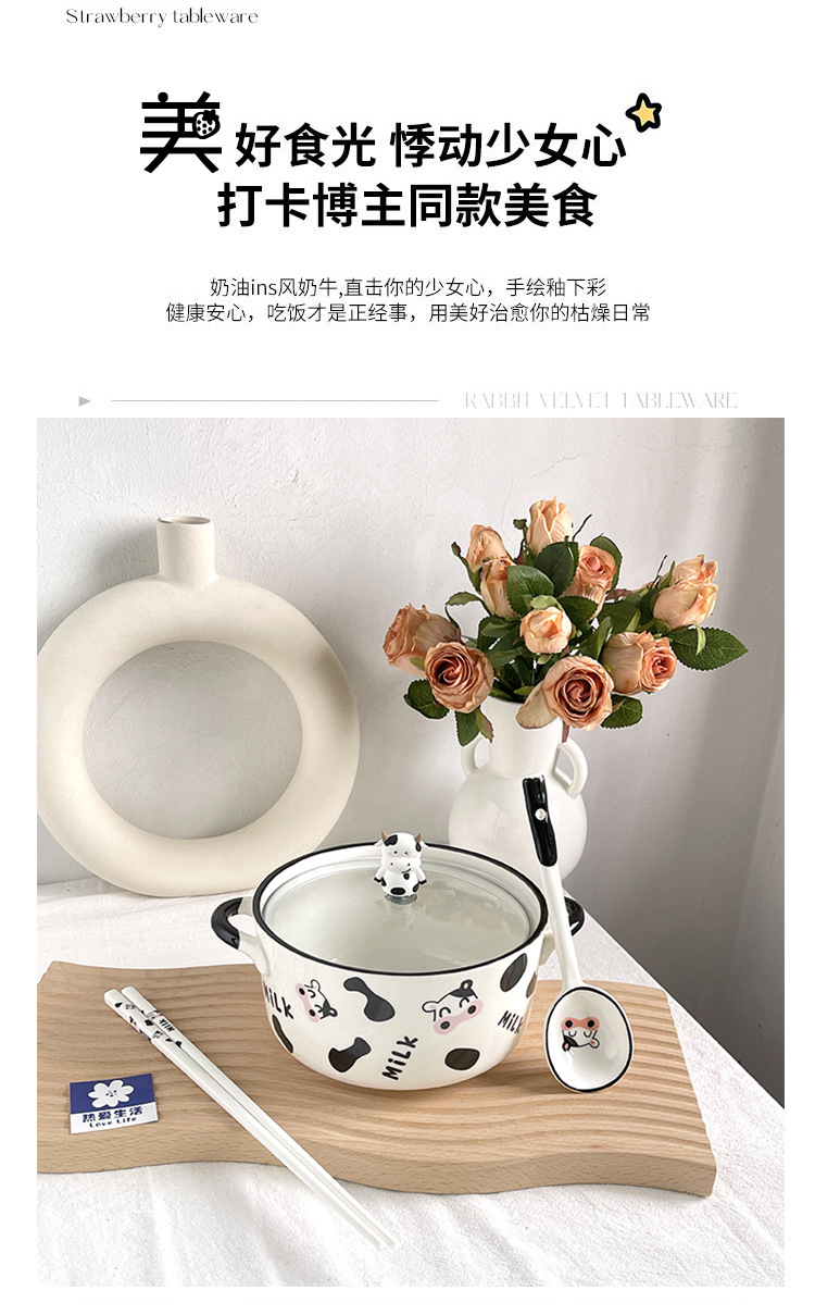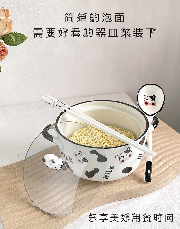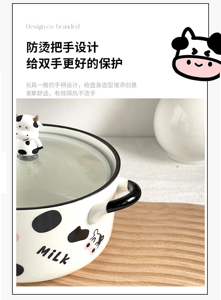 【防烫把手设计!给双手更好的保护】ins可爱奶牛双耳带盖泡面碗少女心宿舍家用陶瓷碗餐具耐热高颜值。ry