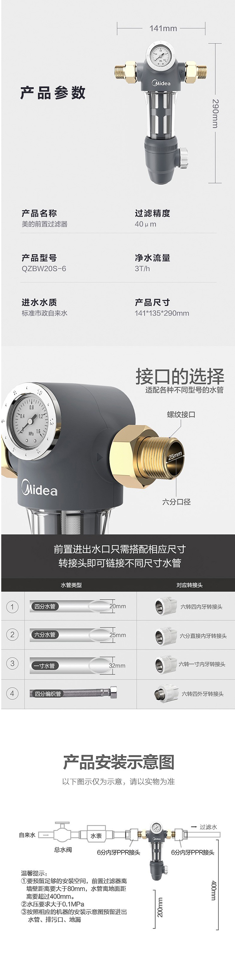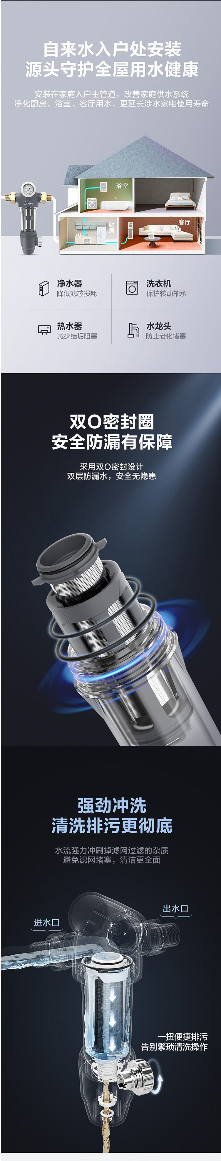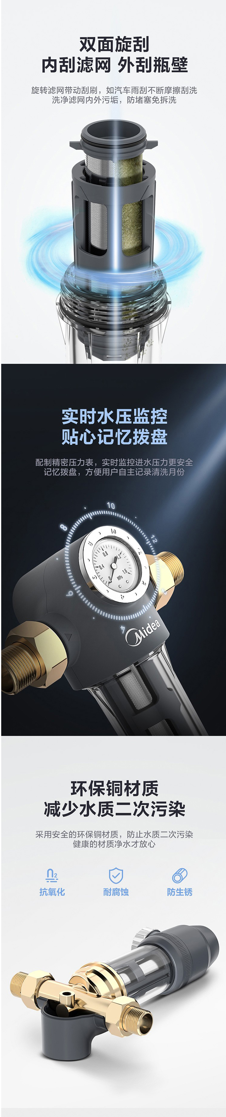 美的(Midea)(509645) 前置过滤器 高精度过滤反冲洗大压力表监控 双面旋刮 全屋净化自来水净水器 QZBW20S-6