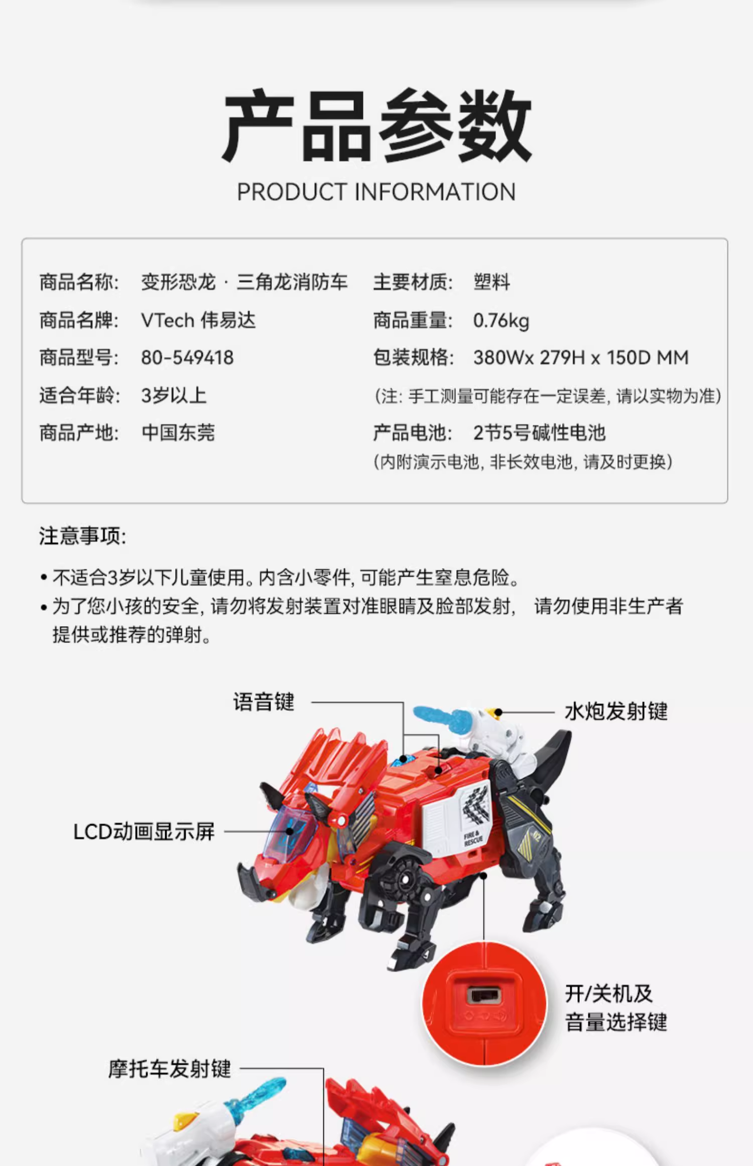 V-tech 变形恐龙-三角龙消防车VTEC80-549418