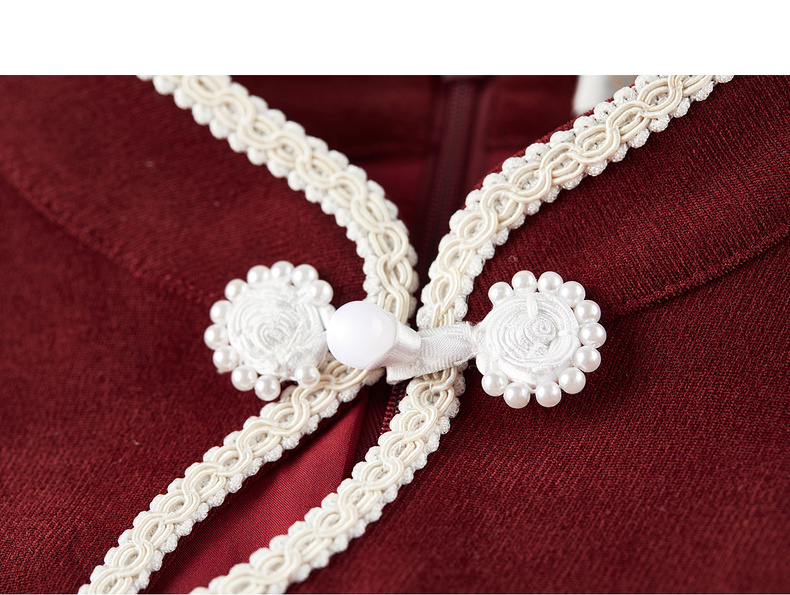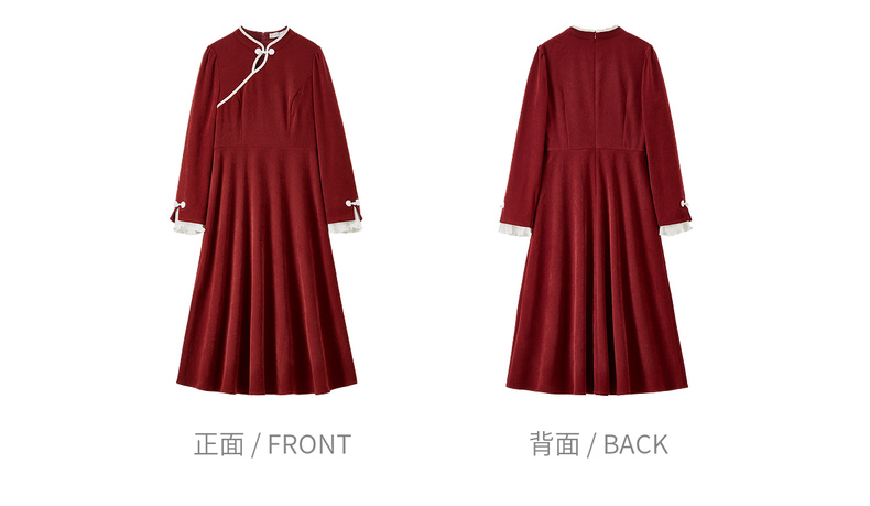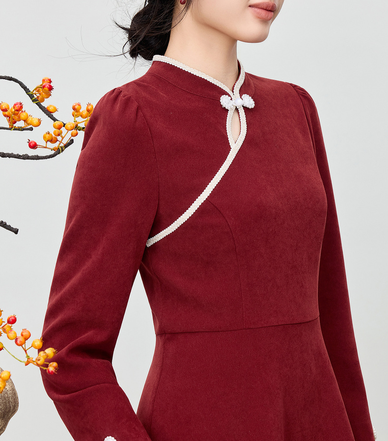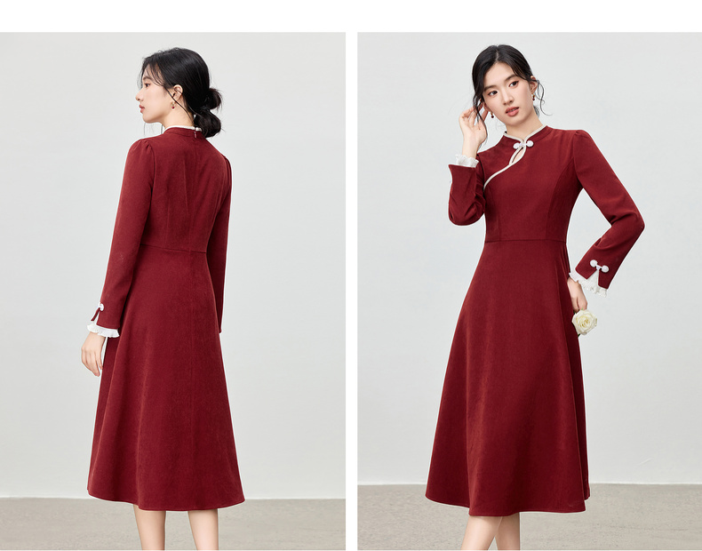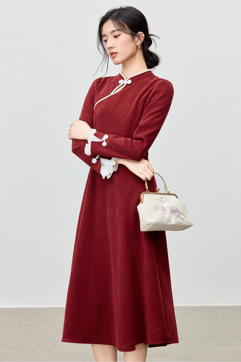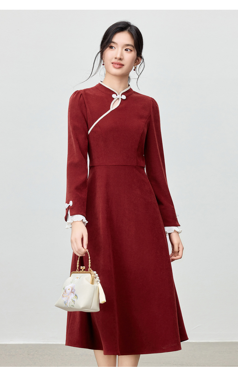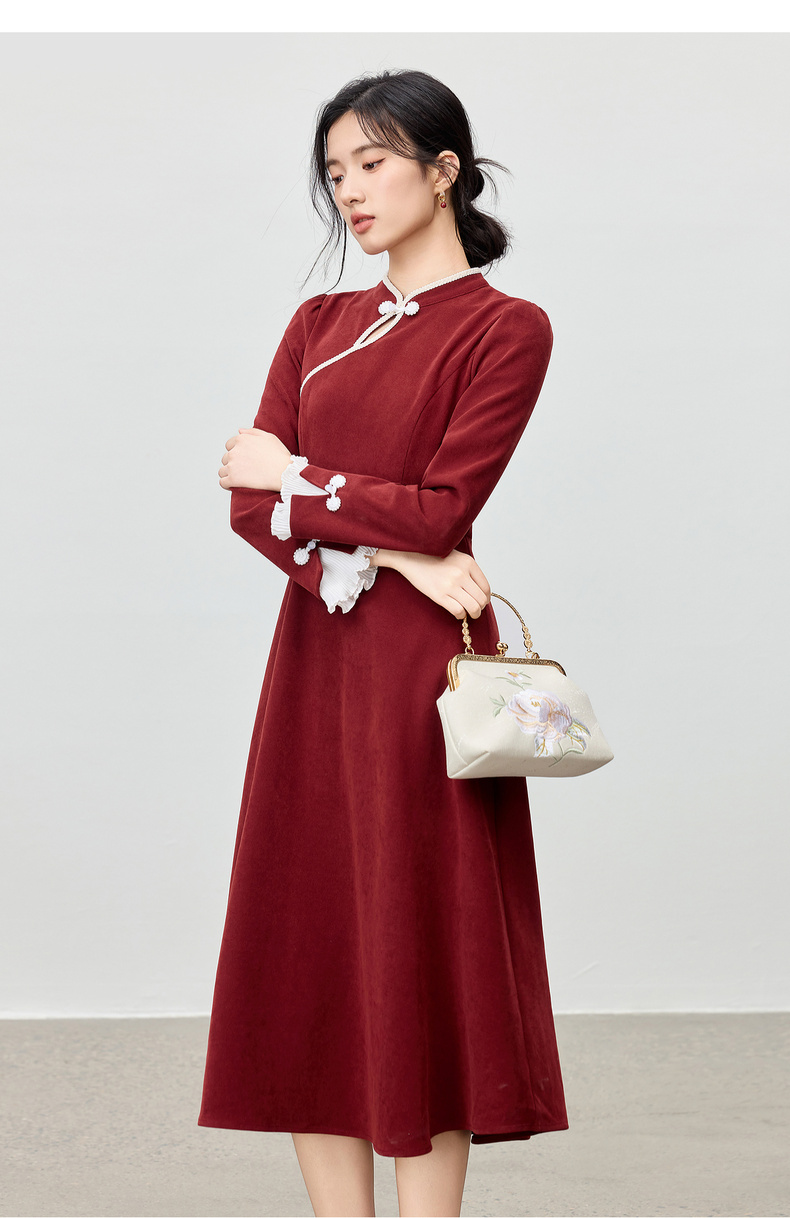 【内购】【撞色织带】国风立领珍珠盘扣假斜襟开叉褶艺荷叶袖修身连衣裙-153LV3572