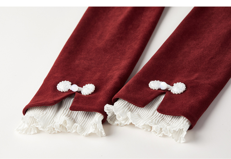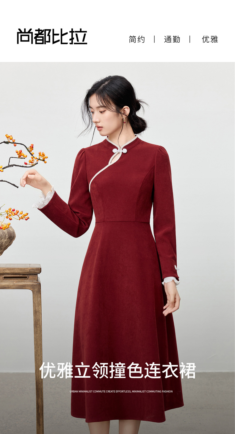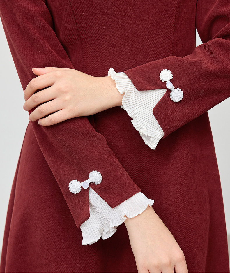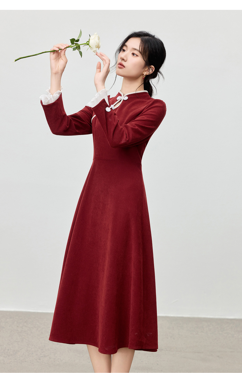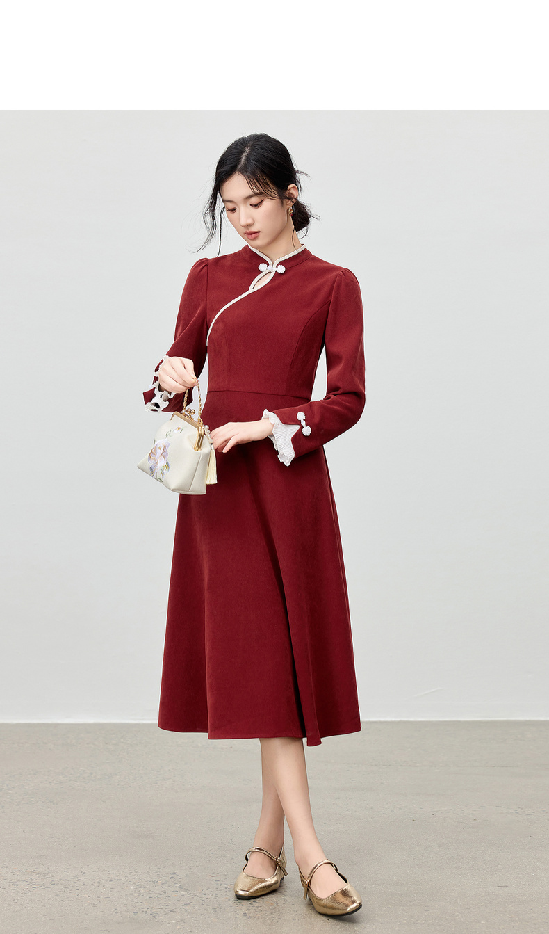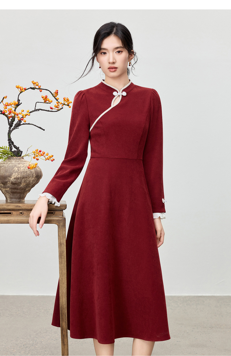 【内购】【撞色织带】国风立领珍珠盘扣假斜襟开叉褶艺荷叶袖修身连衣裙-153LV3572