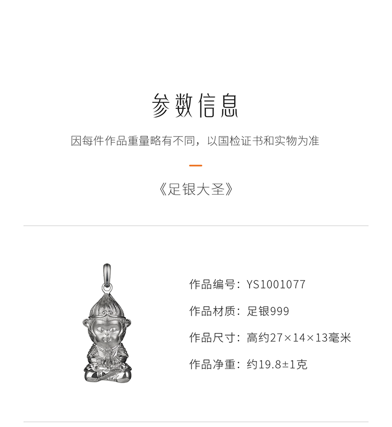 玺匠金铺《足银大圣》孙悟空足银999 佩戴吊坠项链 中秋节礼物