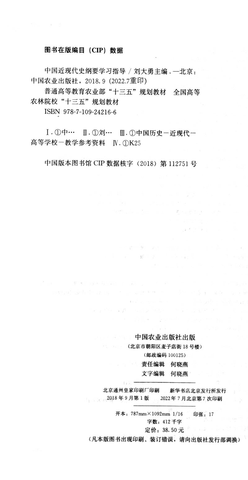 中国近现代史纲要学习指导 刘大勇 普通高等教育农业部“十三五”规划教材 全国高等农林院校“十三五”规划教材 24216 中国近代