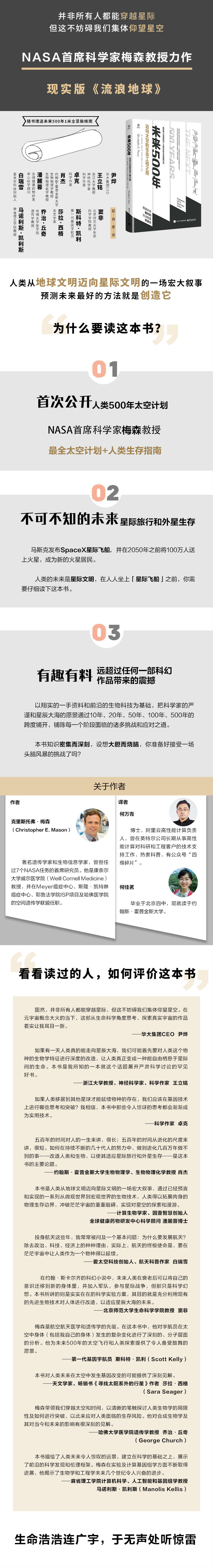 并非所有人都能穿越星际,但这不妨碍我们集体仰望星空。 人类从地球文明迈向星际文明的一场宏大叙事。 现实版《流浪地球》,梅森教授通过对太空宇航员血液、骨骼、基因变化的研究,探索未来五百年基因工程的必然发展,为太空设计新人类,为人类定居新家园做准备。梅森提出了一个十个阶段,为期500年的计划。该计划*终目标是实现人类对新太阳系的适应。他列出了首先要"参观”的太阳系的路线图,并融合了生物技术、哲学和遗传学等,从而为未来的宇宙提供了无与伦比的视野。