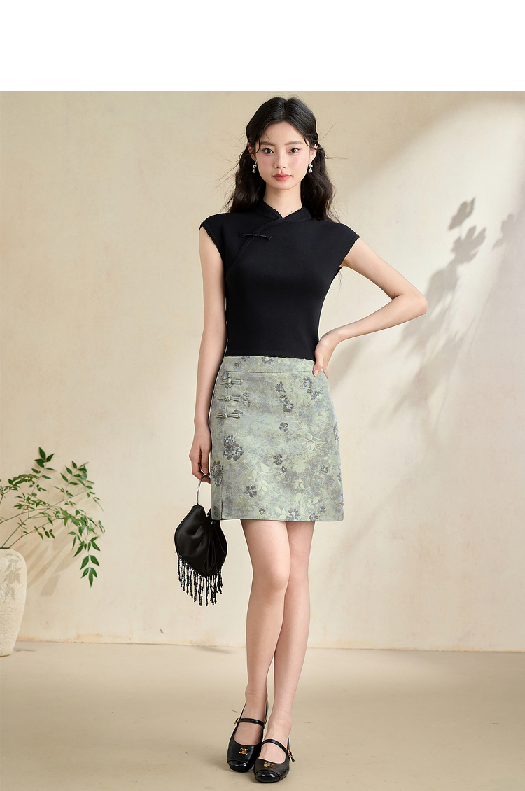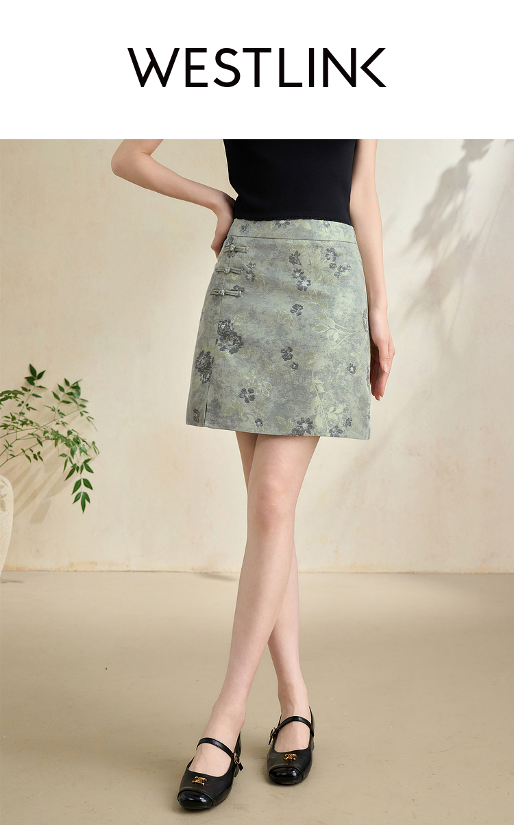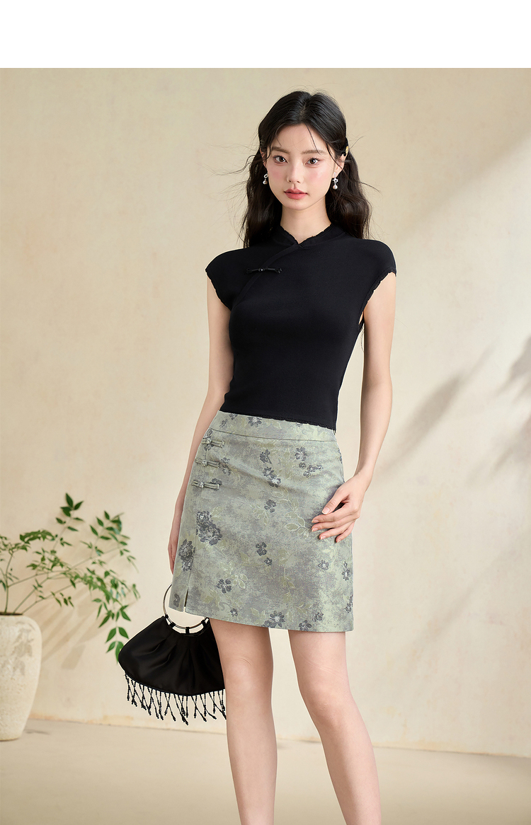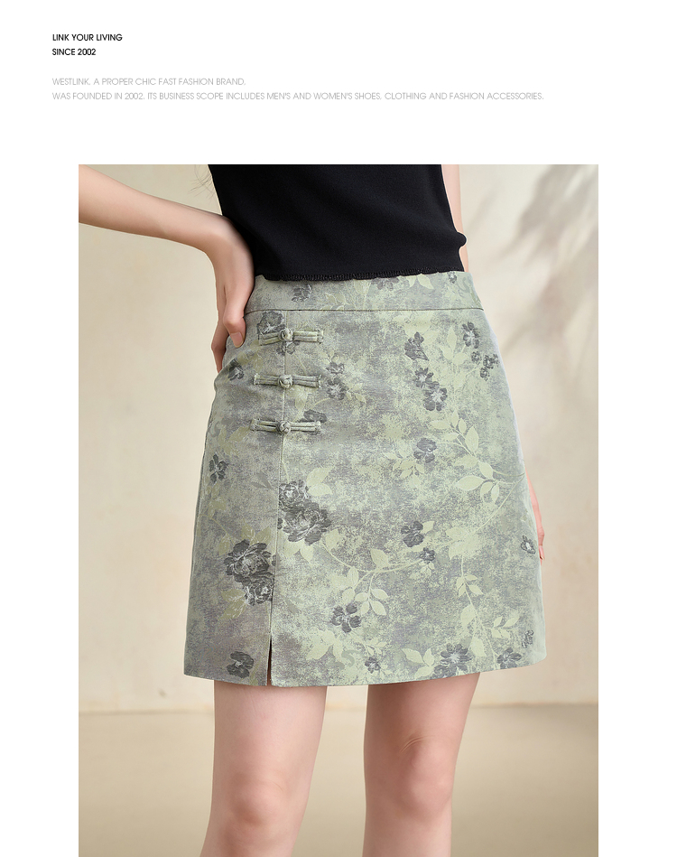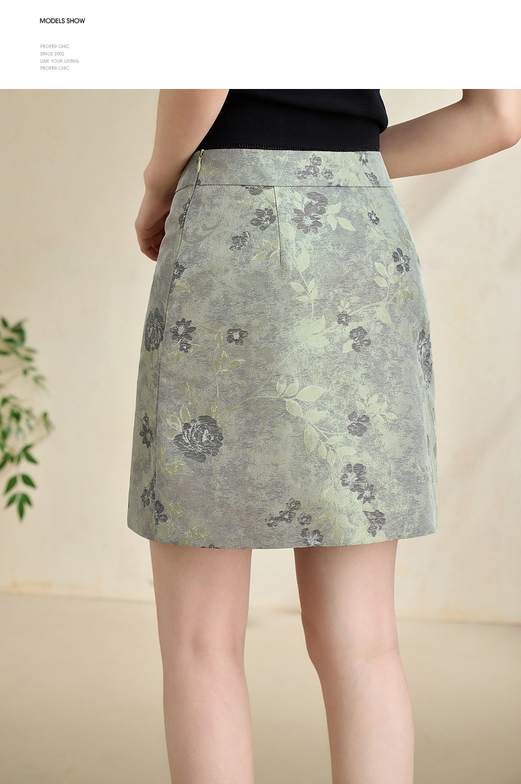 新中式国风重工提花一字扣半身裙女开叉直筒裙V2742130