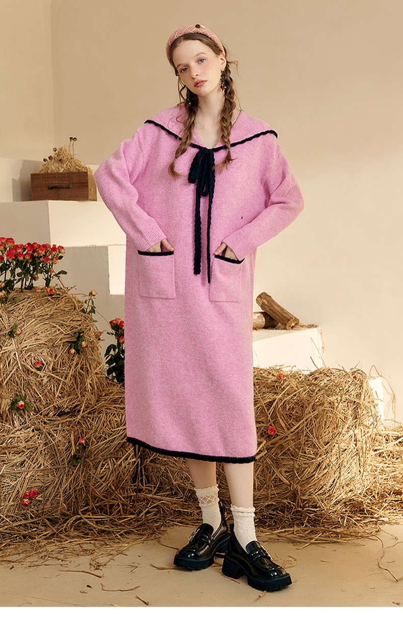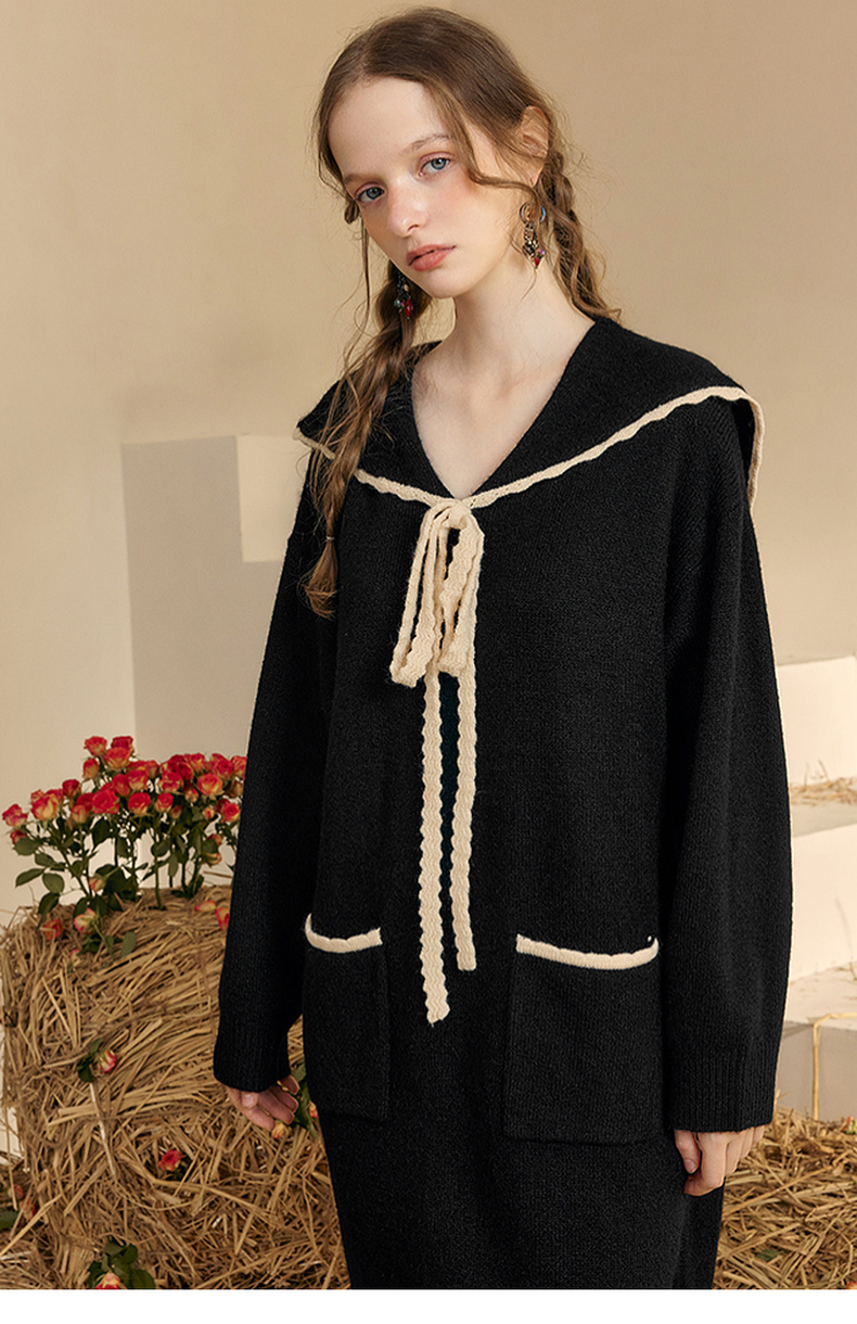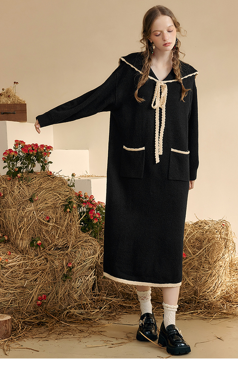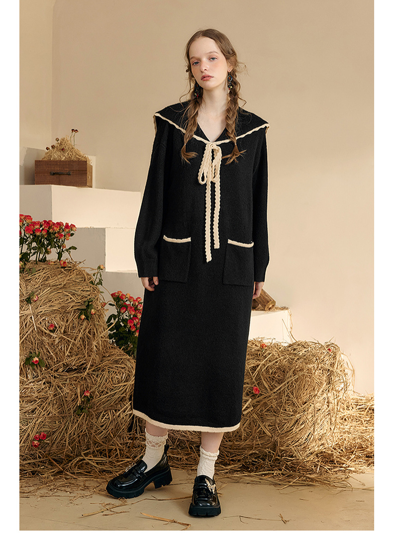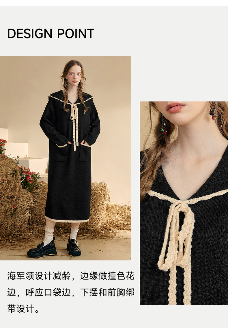 两三事 粉墨登场 2024秋季新款字母刺绣绑带海军领毛衣裙连衣裙