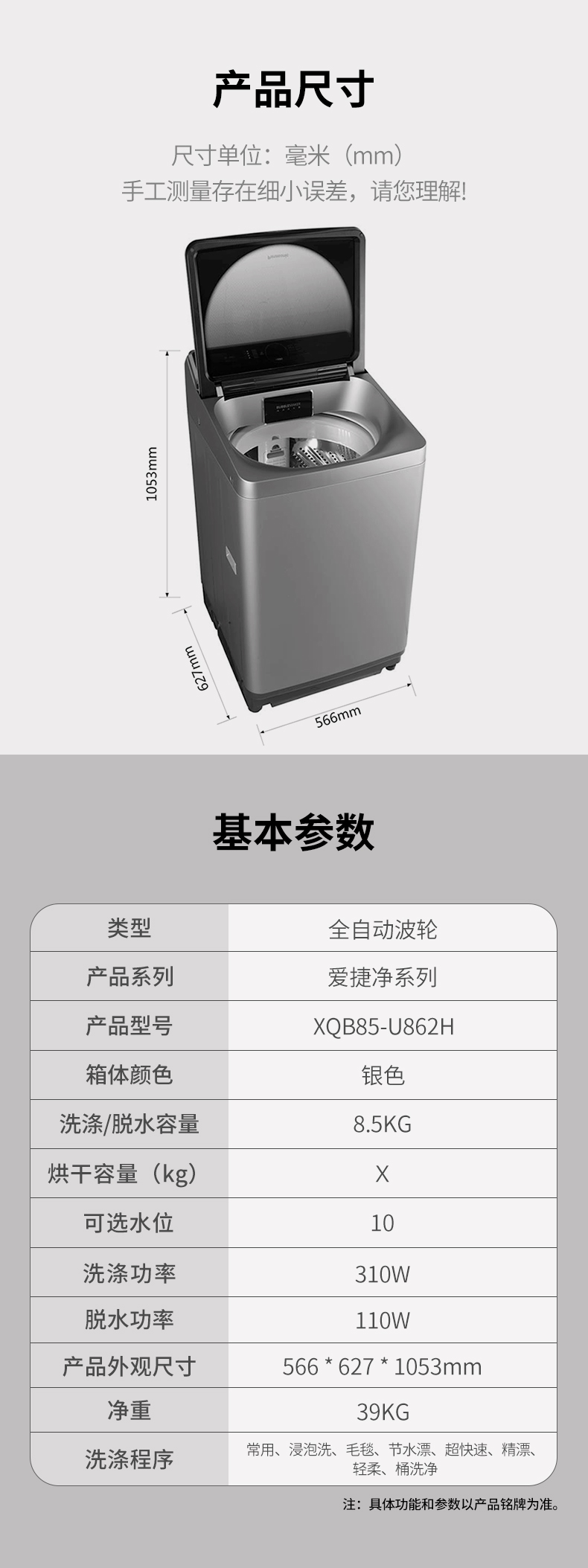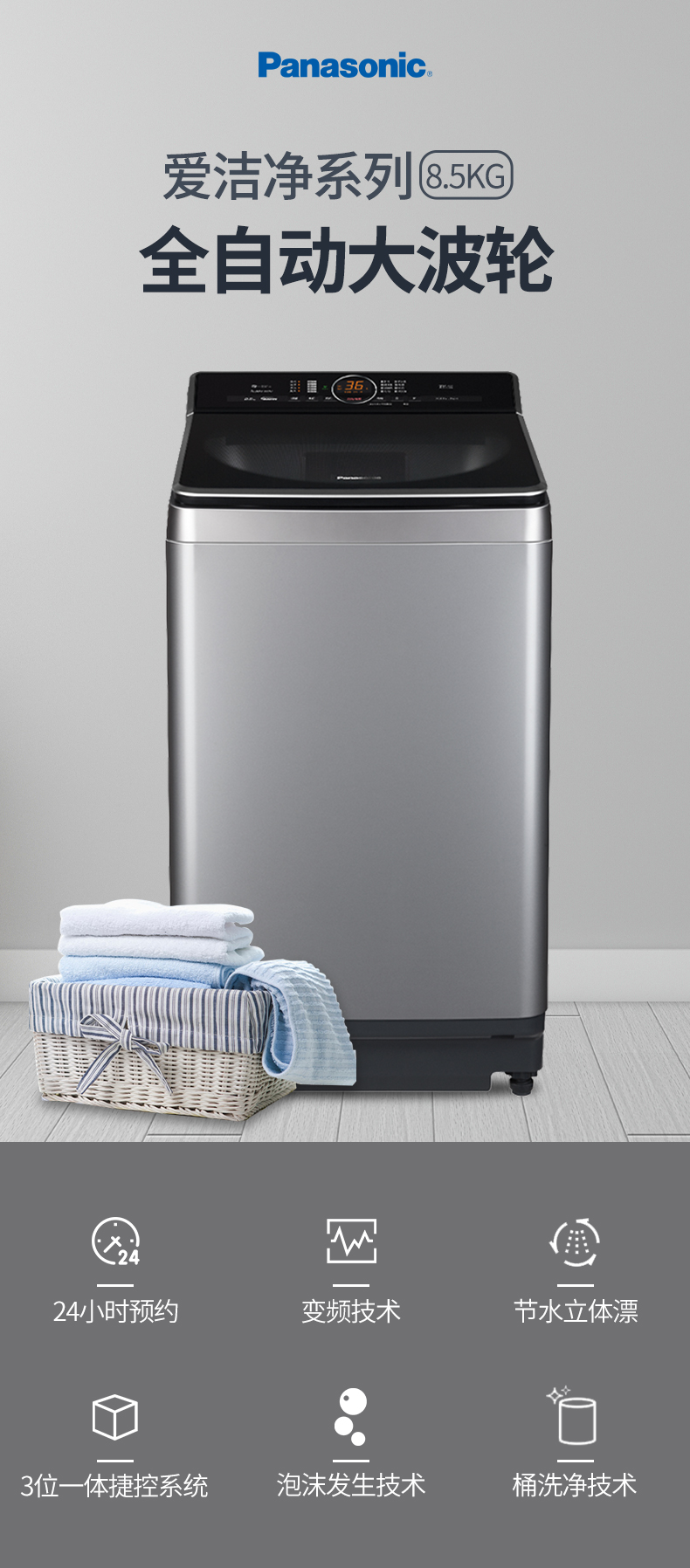 松下8.5公斤全自动节能洗脱一体波轮洗衣机XQB85-U862H