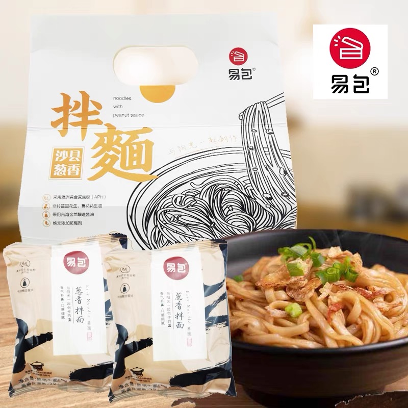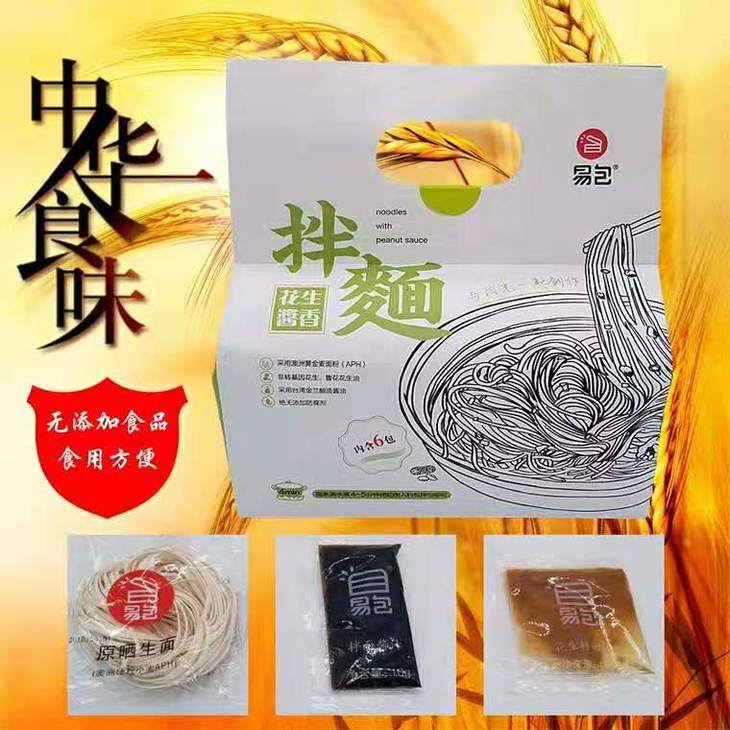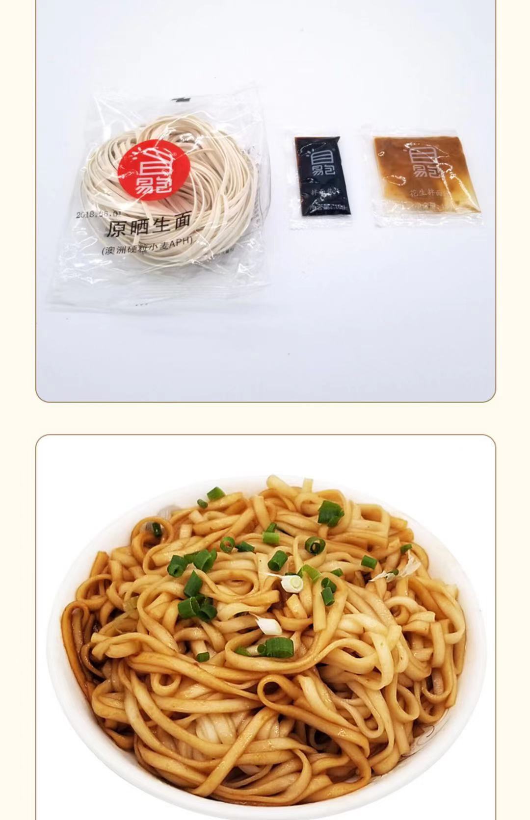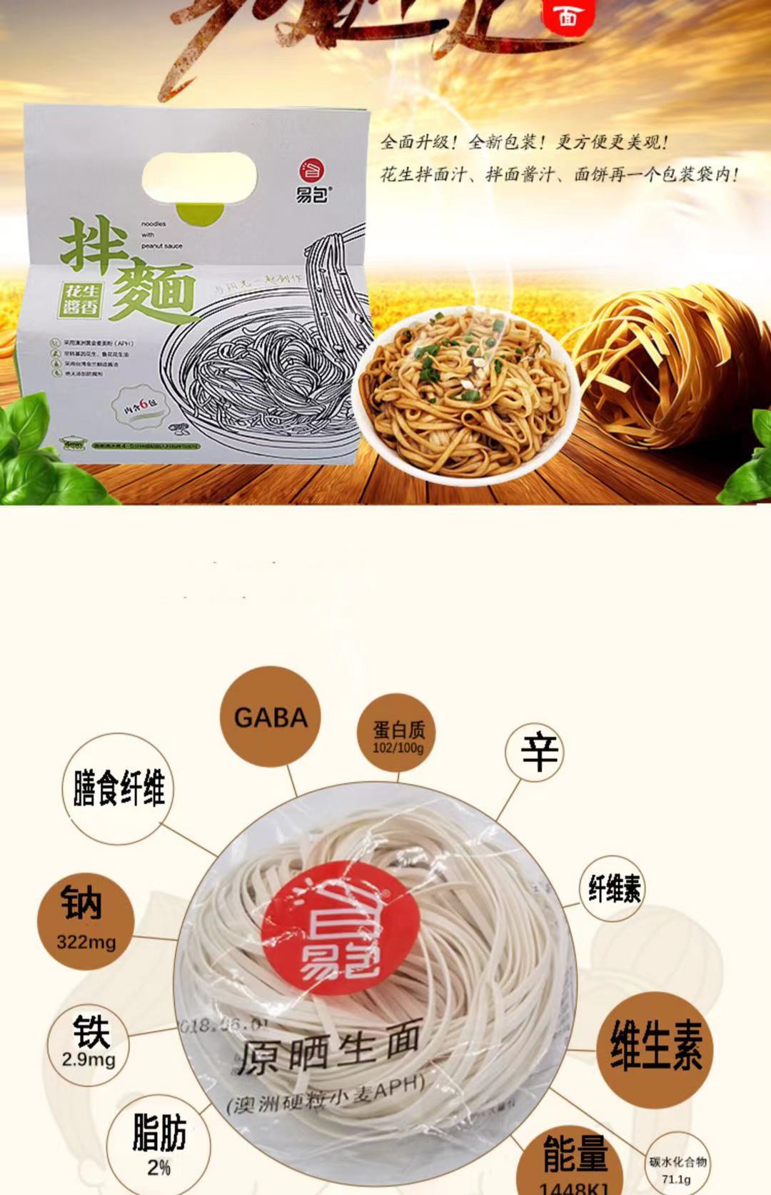 【详情】易包拌面,严选澳洲黄金小麦,面粉加蛋清作为主要原料, 面条极富弹性,口感非常劲道。 调料是特制的花生酱、猪油、酱油、葱花作为主要配料。