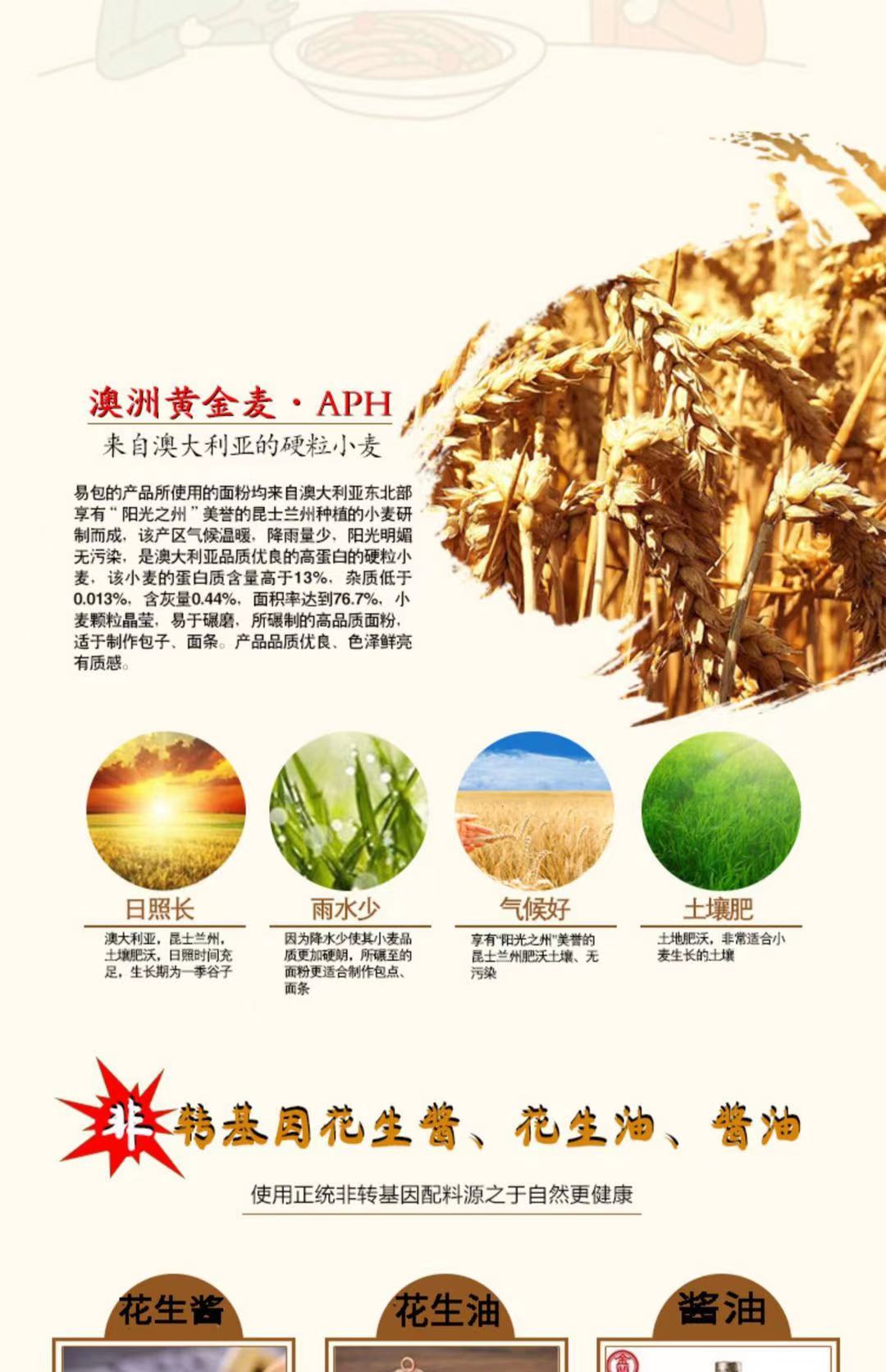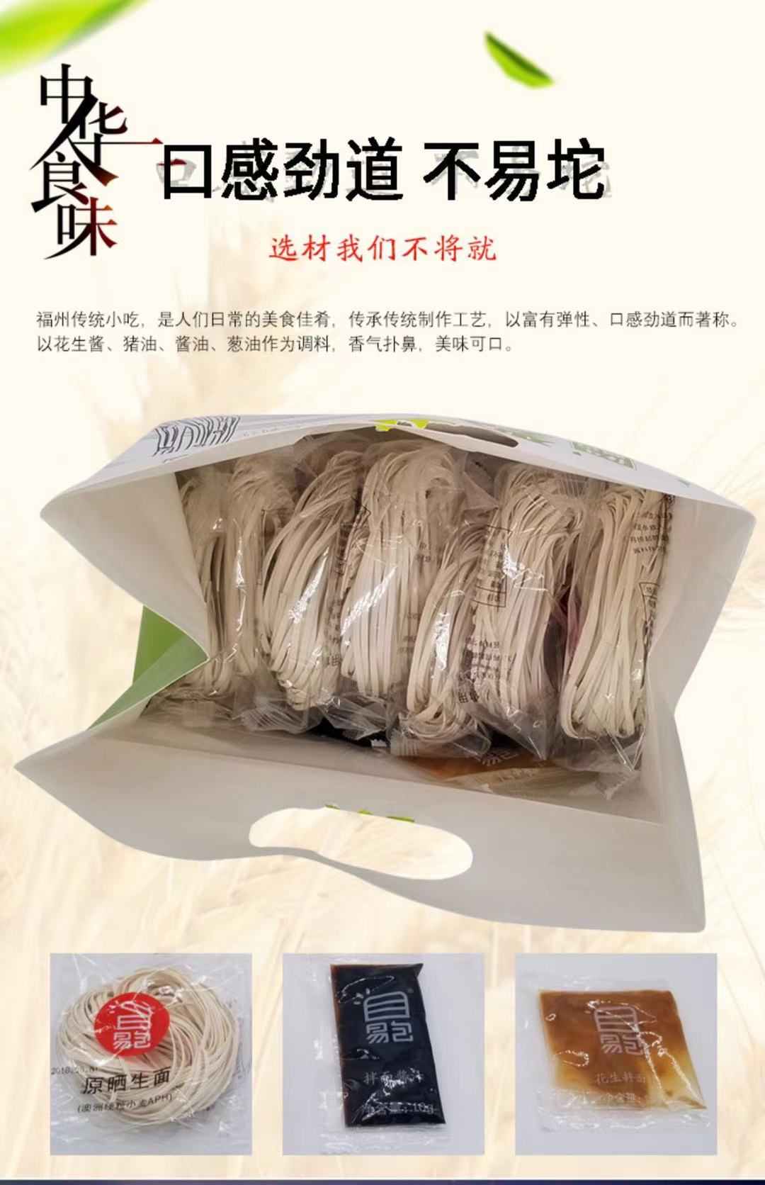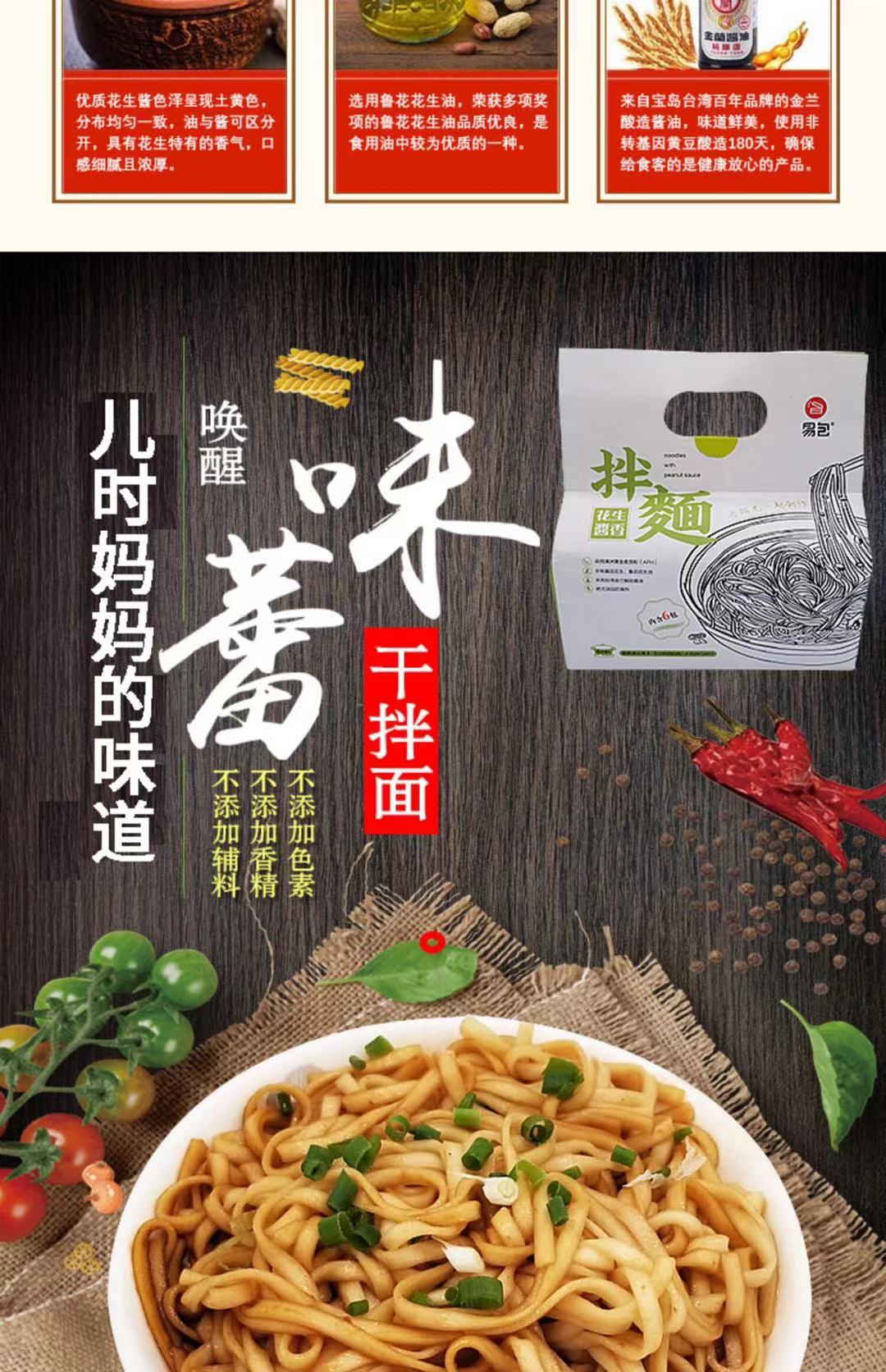 【详情】易包拌面,严选澳洲黄金小麦,面粉加蛋清作为主要原料, 面条极富弹性,口感非常劲道。 调料是特制的花生酱、猪油、酱油、葱花作为主要配料。