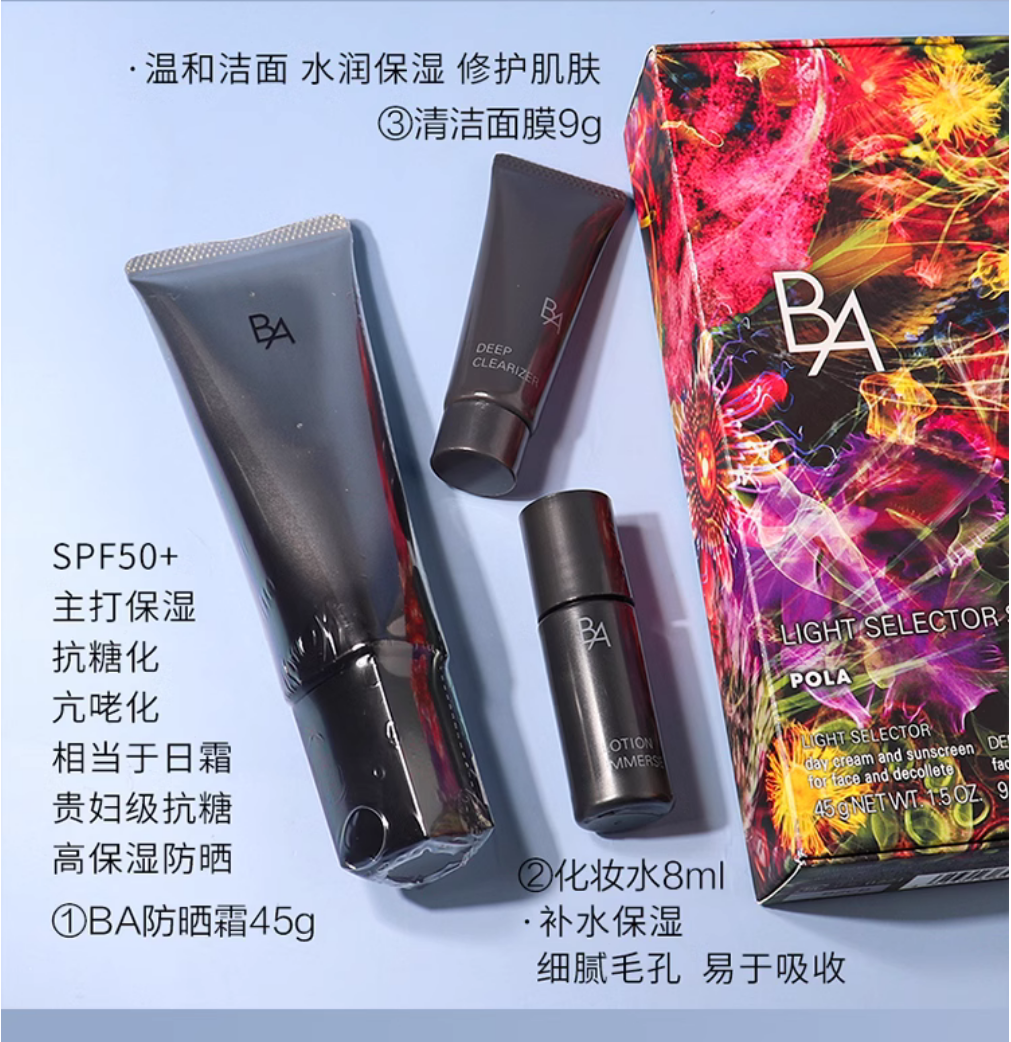【品名】POLA限量套装三件套 BA防晒霜45g+BA新品化妆水8ml+BA洁面9ml