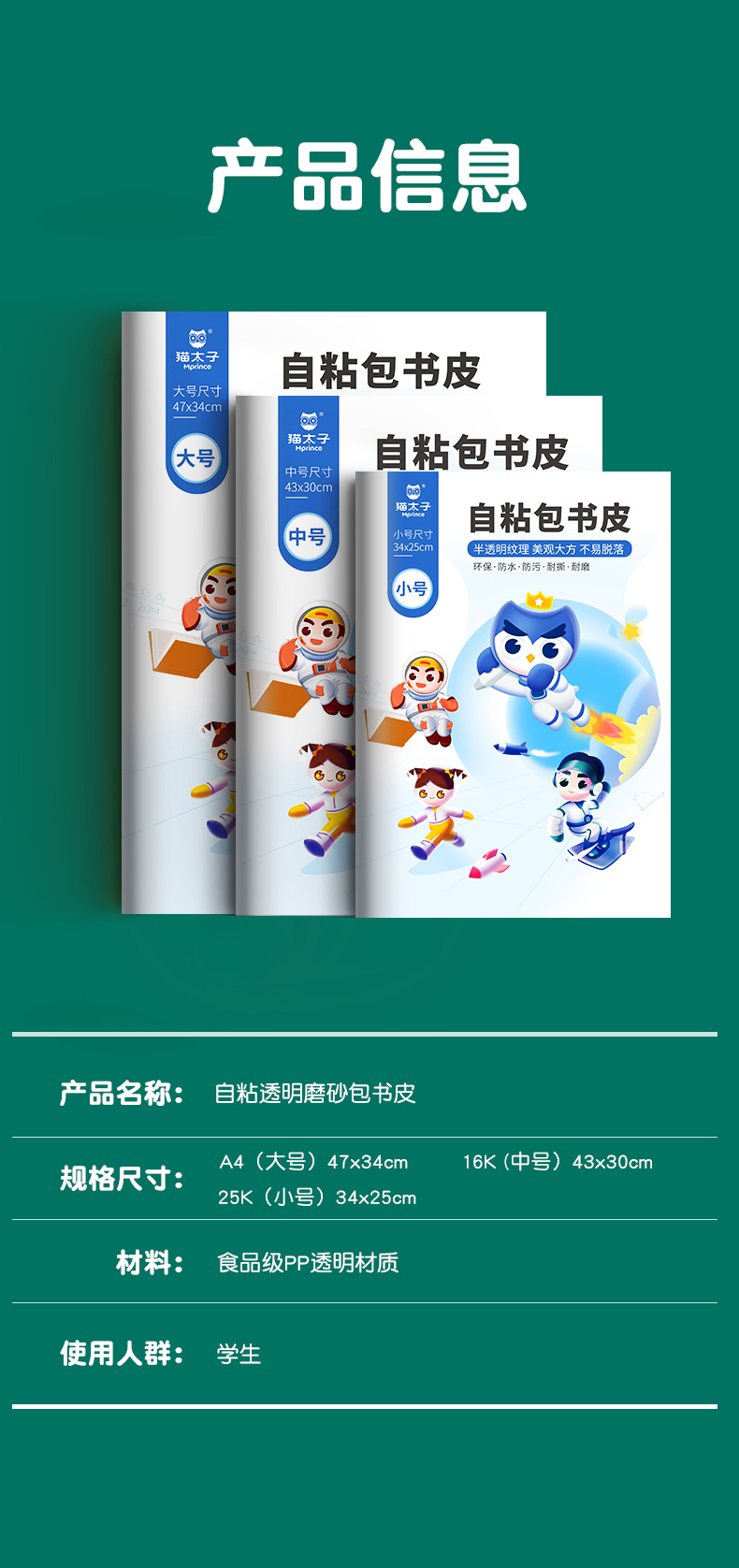猫太子包书皮书套书皮纸自粘透明磨砂16K包书膜小学生书本课本保护套一年级二年级上册三四五a4自粘书壳全套大张