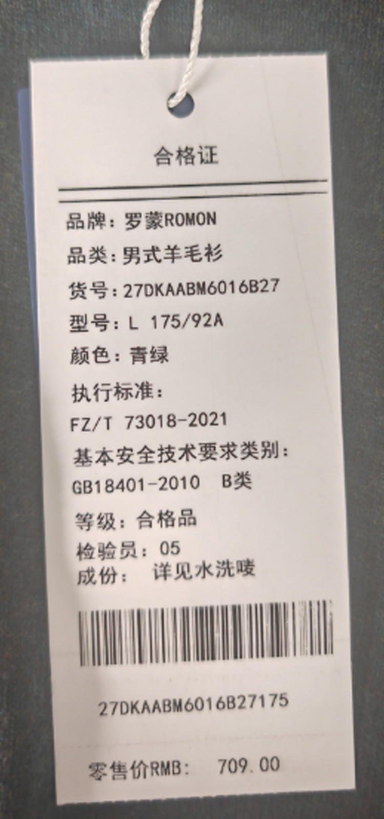 面料:100%绵羊毛