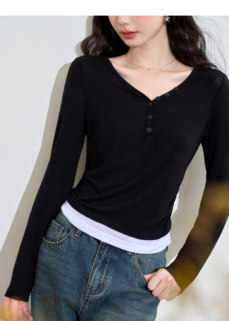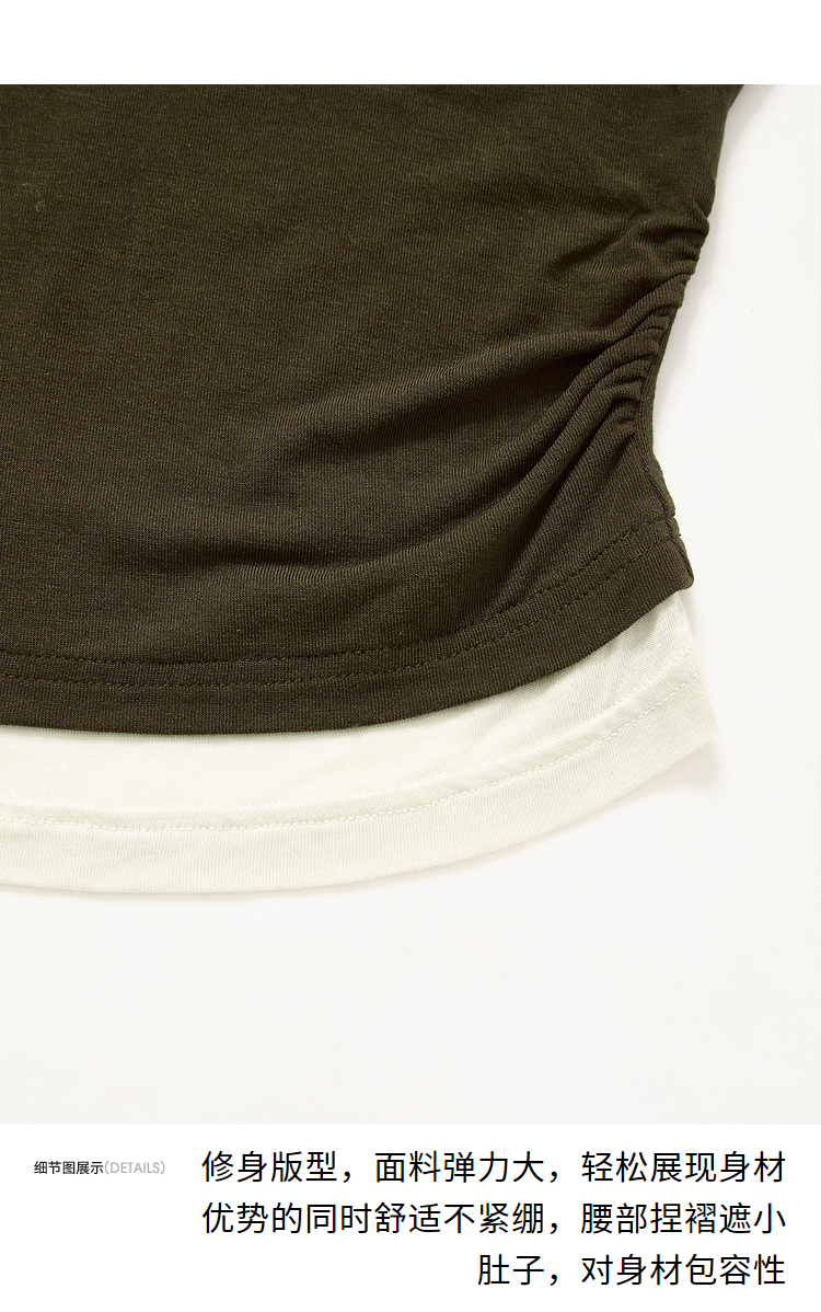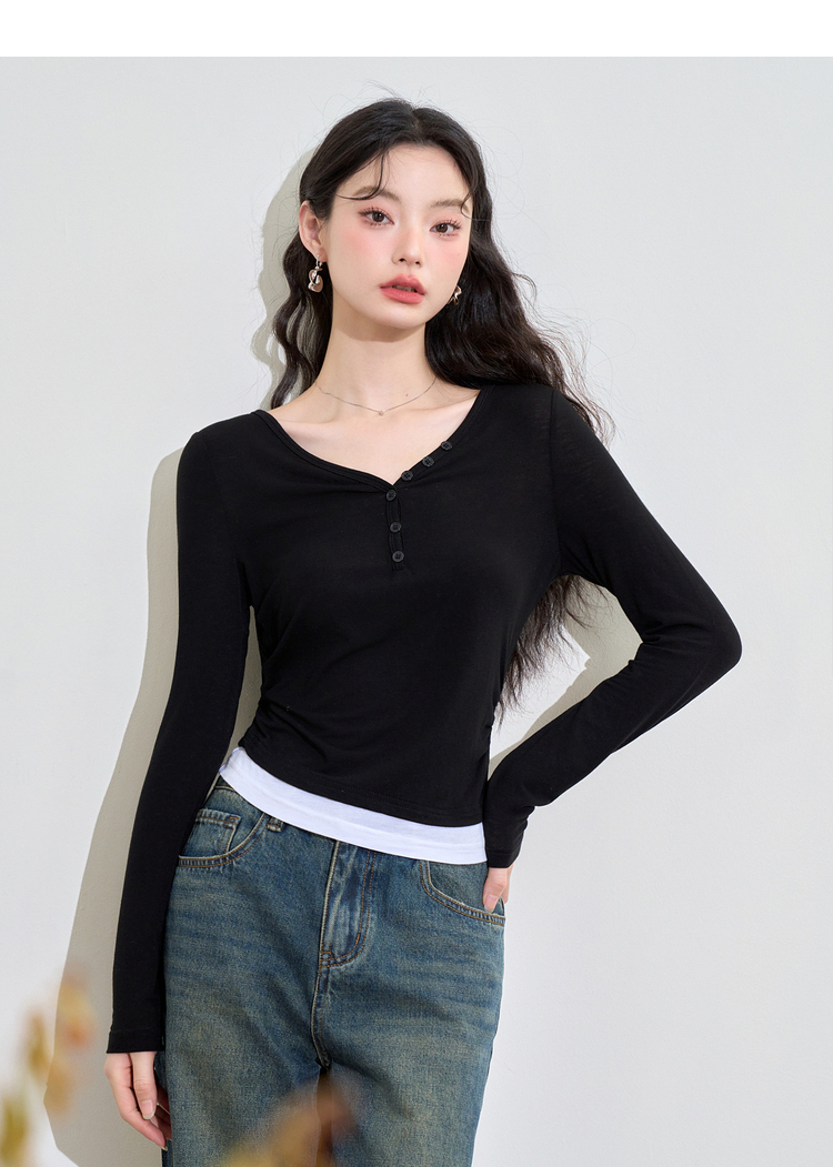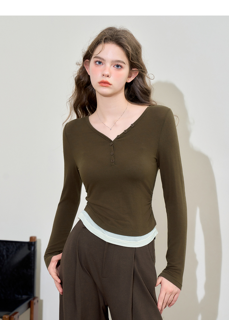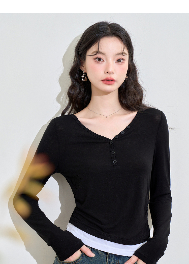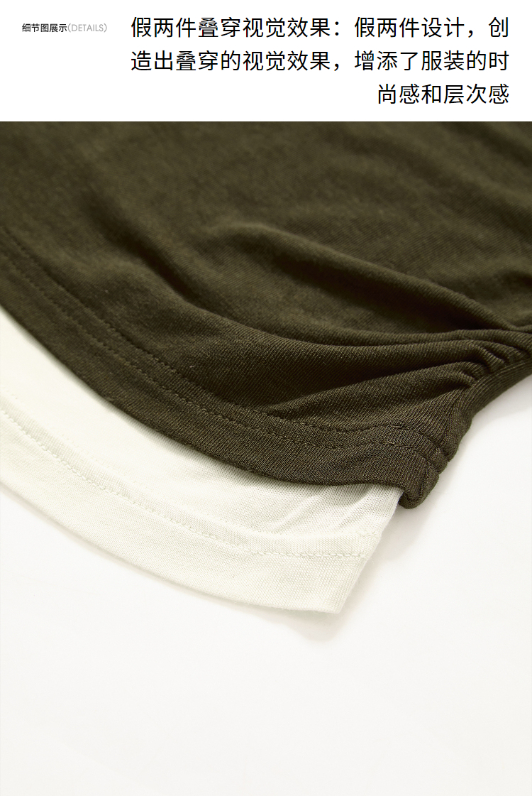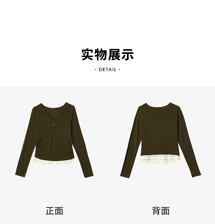 撞色设计感假两件长袖T恤女早春捏褶显瘦修身上衣V3242273