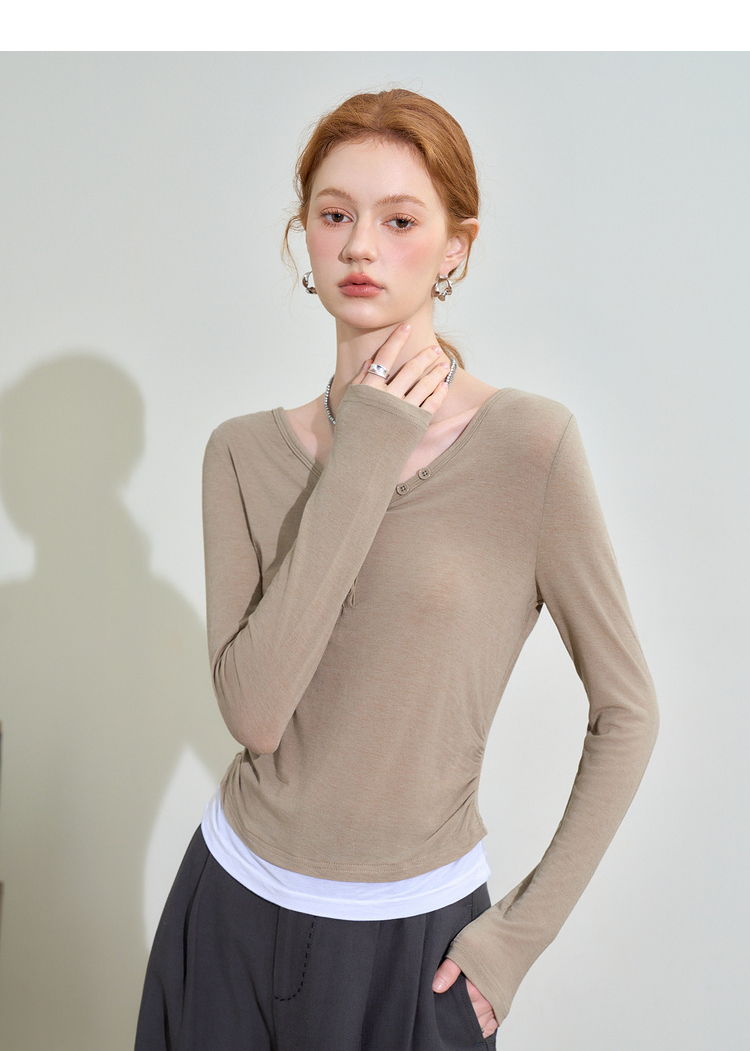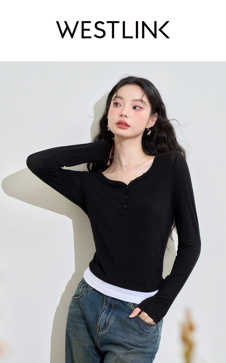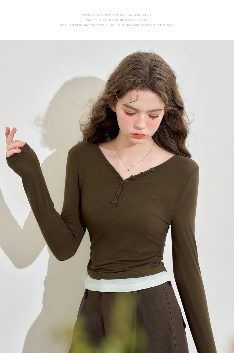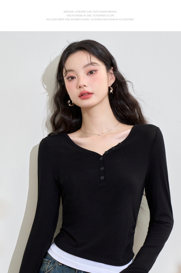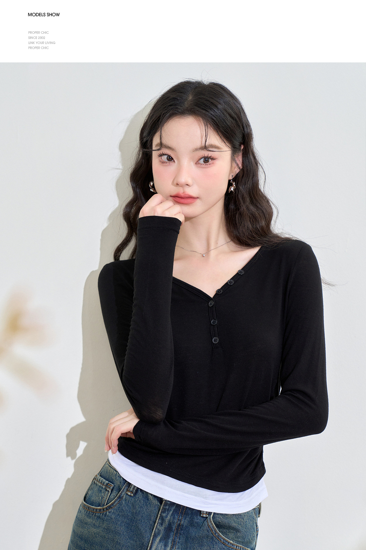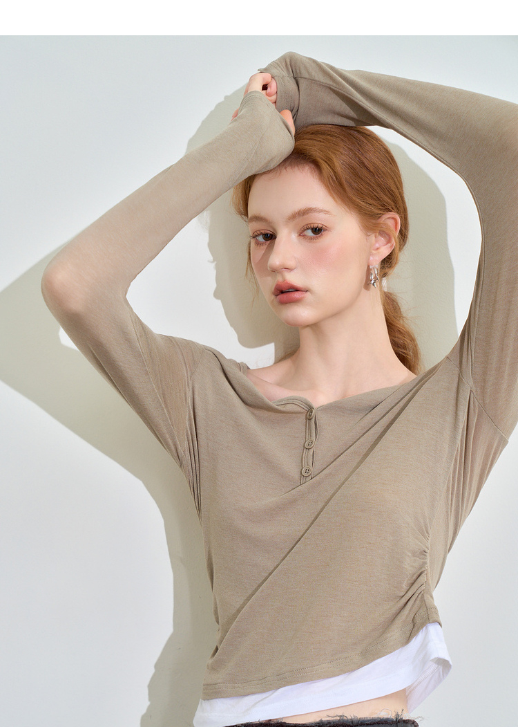 撞色设计感假两件长袖T恤女早春捏褶显瘦修身上衣V3242273