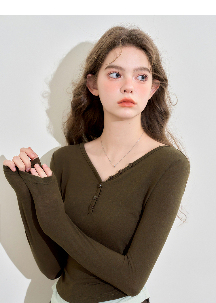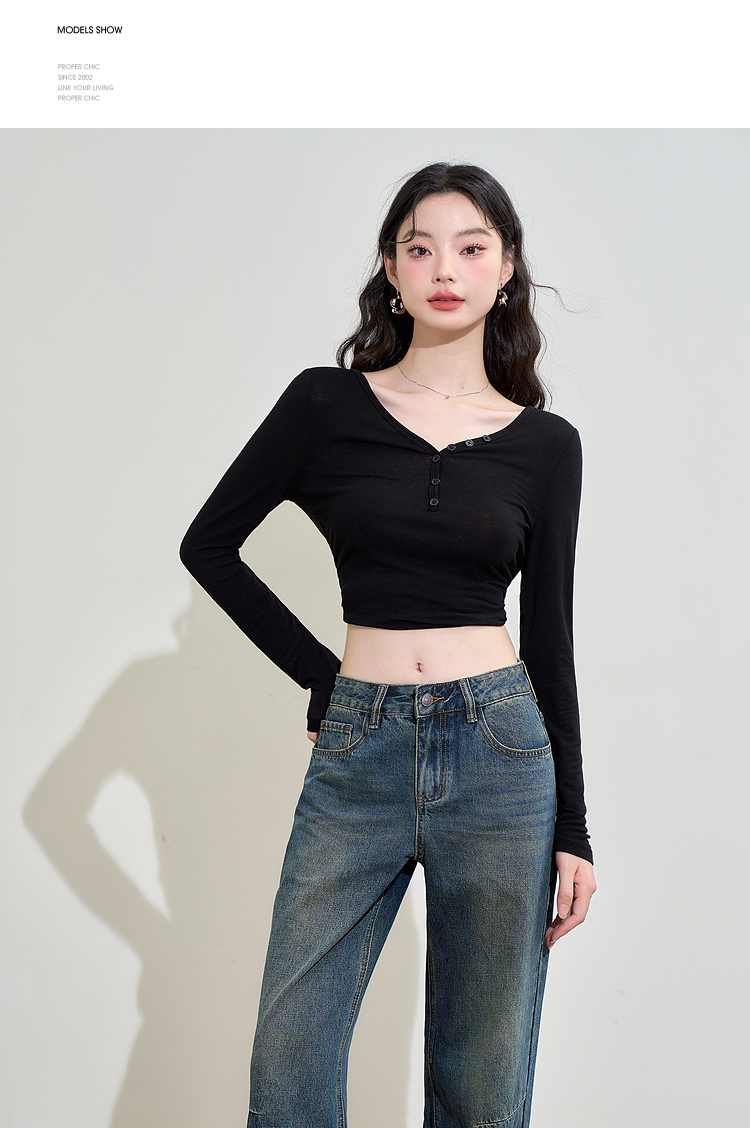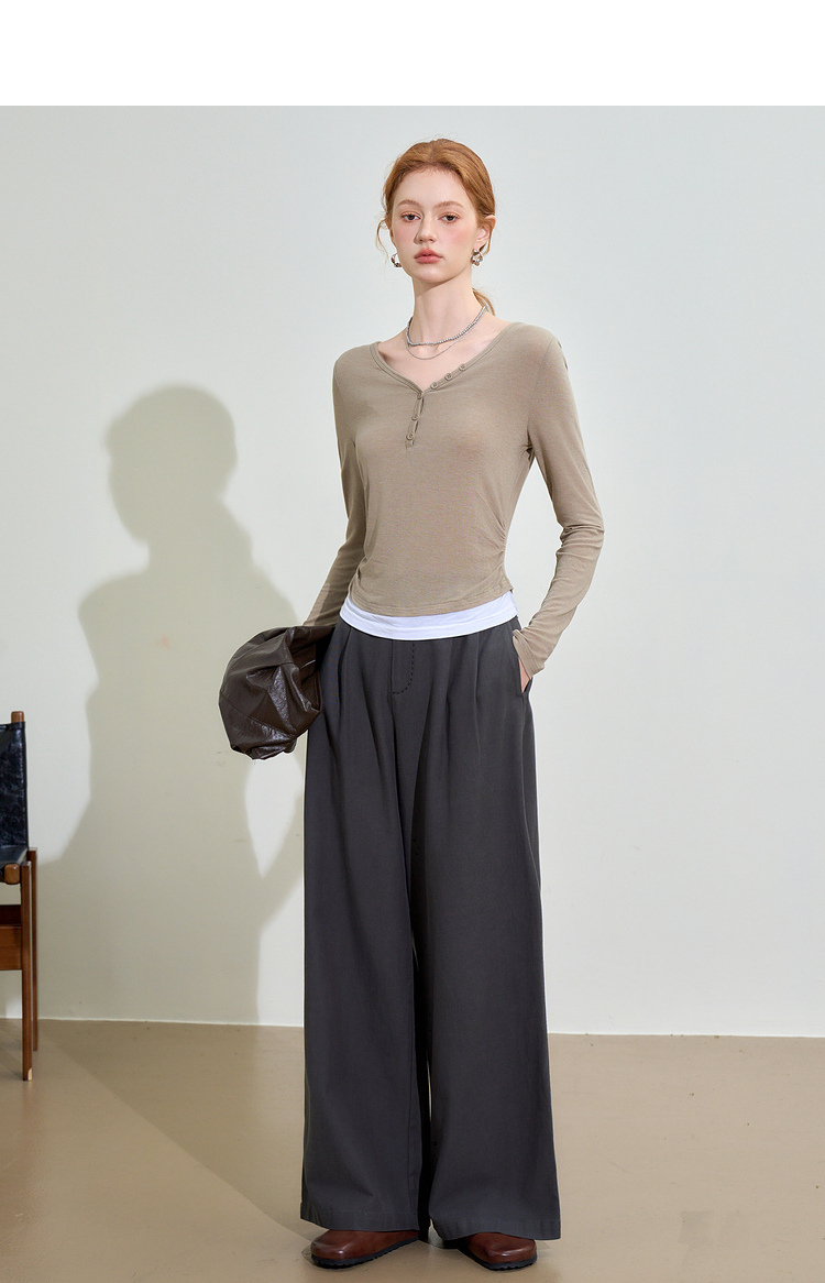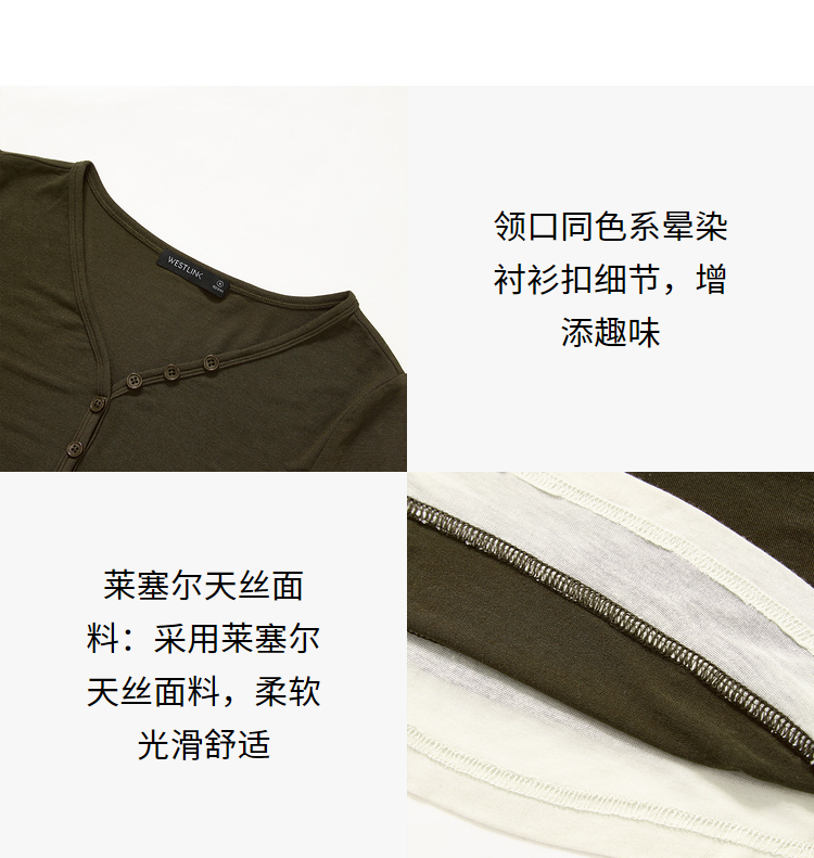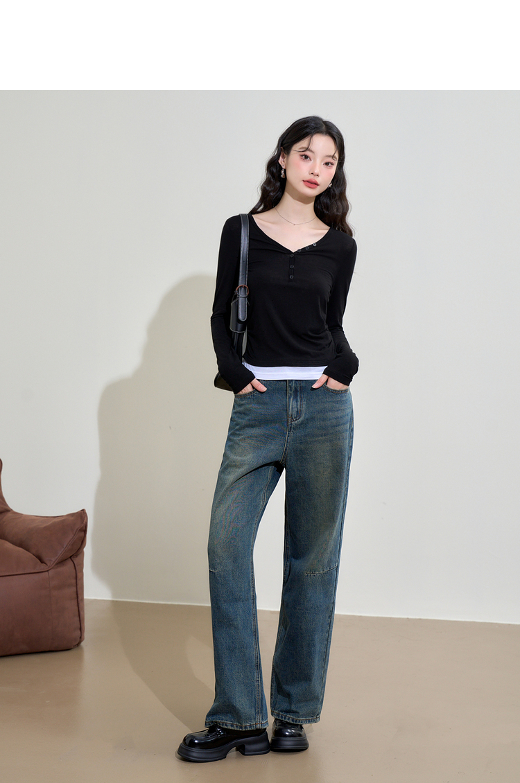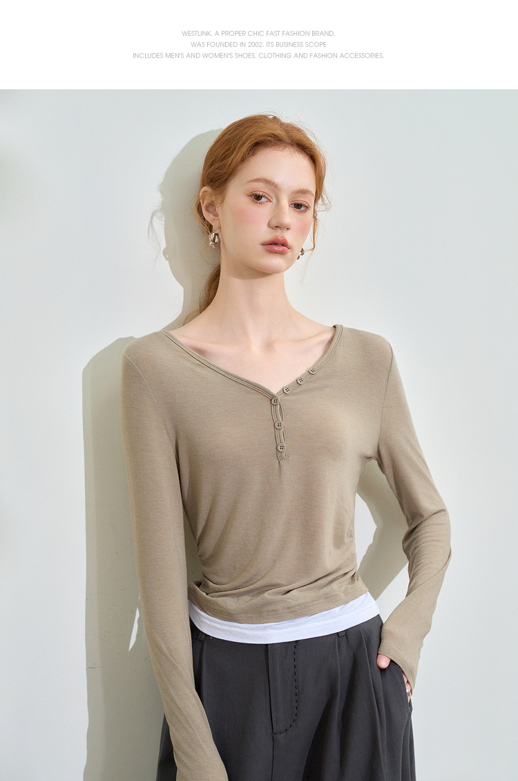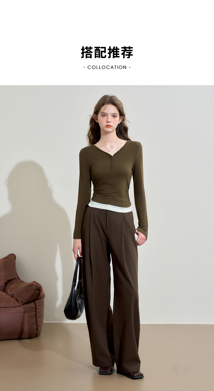 撞色设计感假两件长袖T恤女早春捏褶显瘦修身上衣V3242273