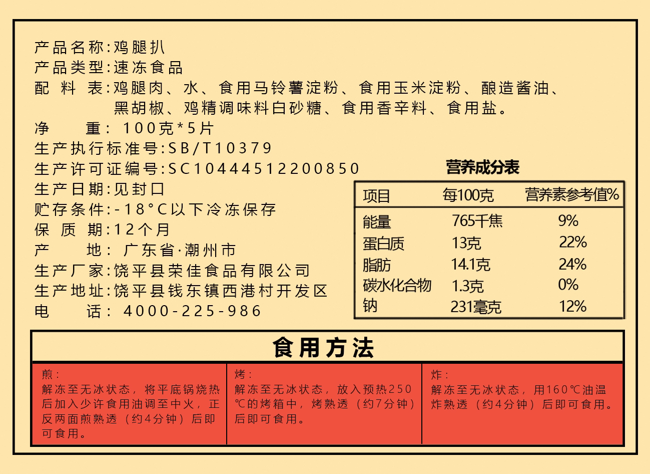 配料:有鸡腿肉、水、食用马铃薯淀粉、食用玉米淀粉、酿造酱油、黑胡椒、鸡精调味料白砂糖、食用香辛料、食用盐。