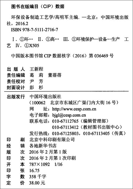 环保设备制造工艺学 普通高等教育"十三五"规划教材 高明军 环境保护 9787511127167