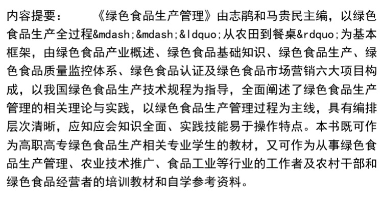 绿色食品生产管理 全国高职高专规划教材 米志鹃 马贵民 环境保护 9787511110589