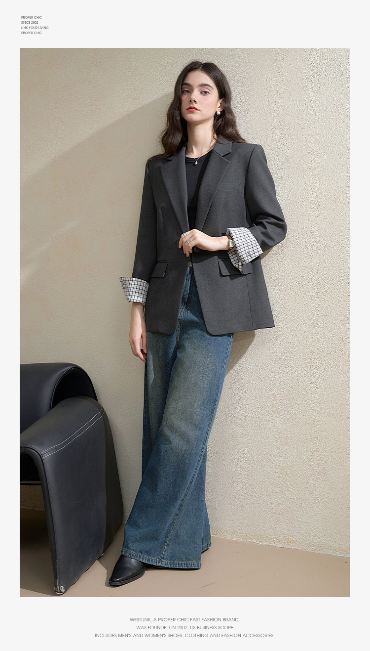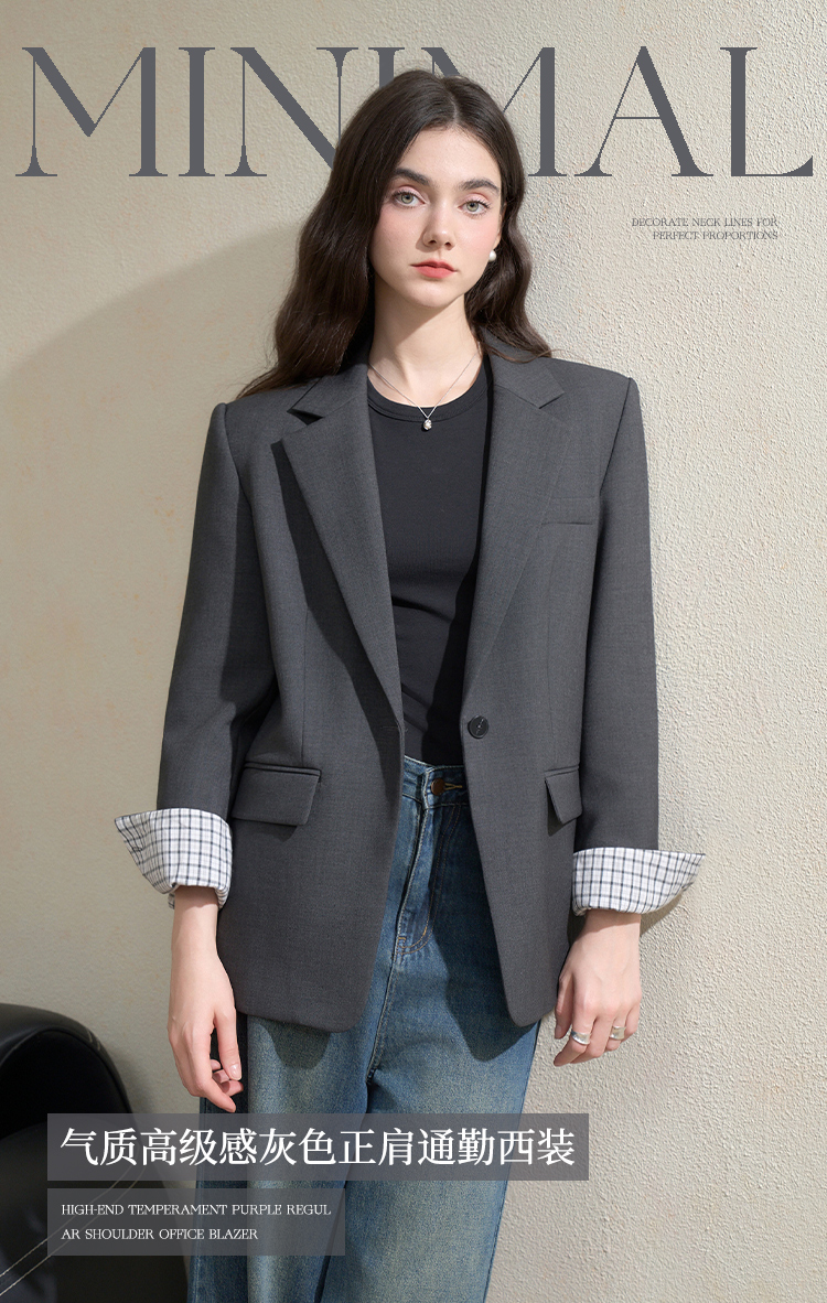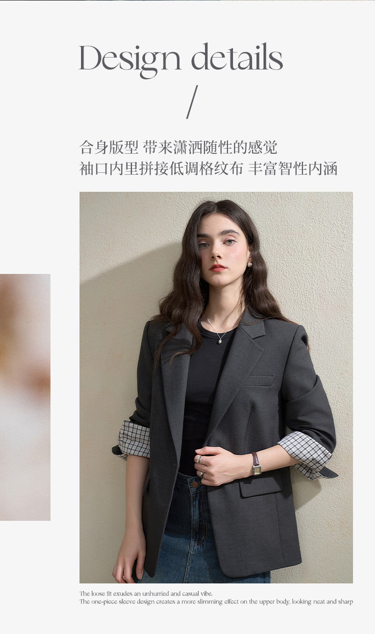 西遇气质通勤格纹袖口翻领垫肩西装外套女秋季百搭休闲西服V2751143