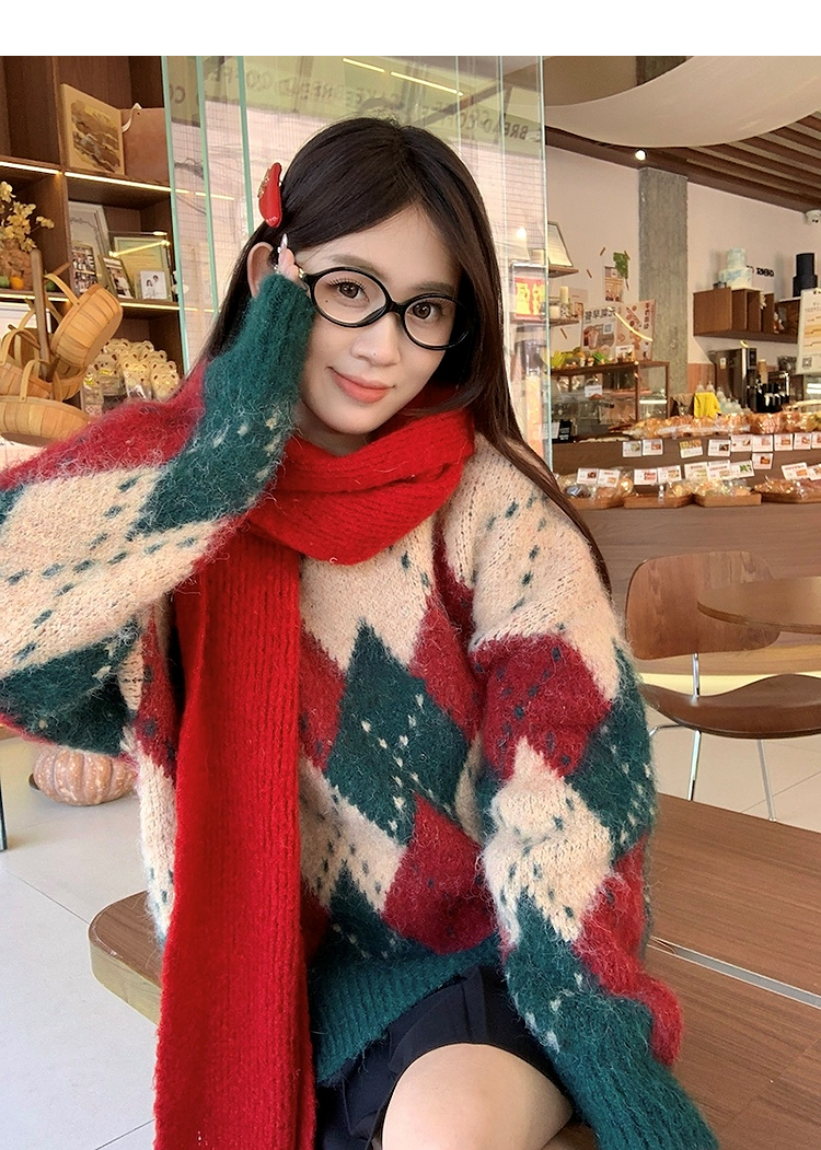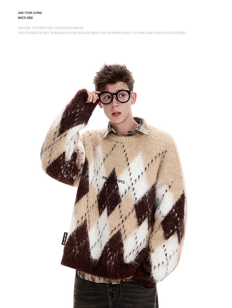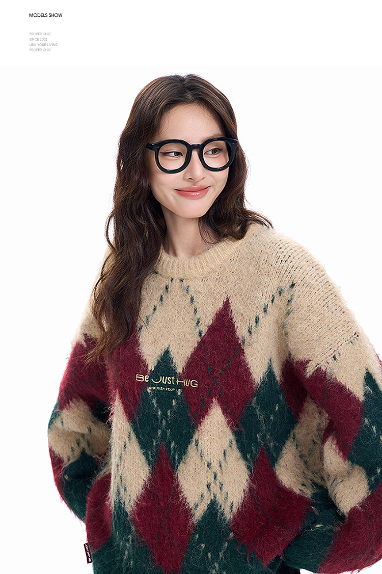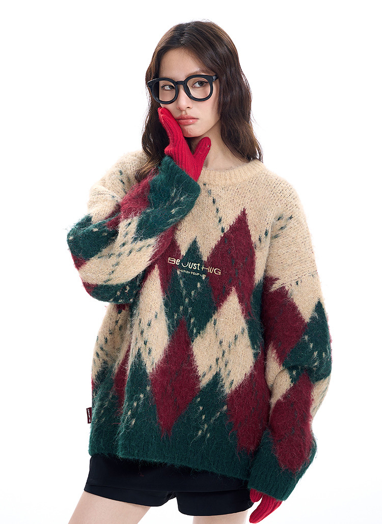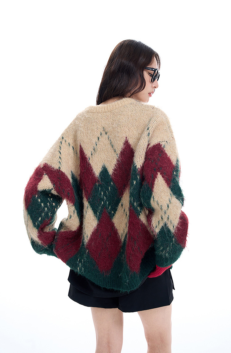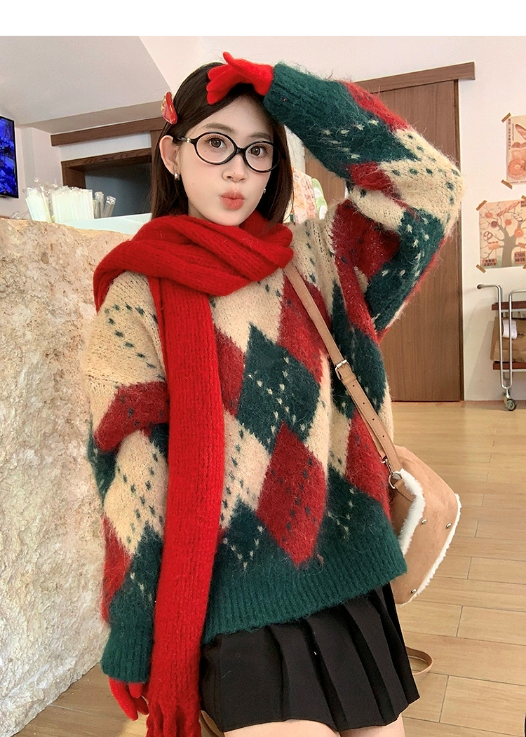 西遇费尔岛毛衣女2025年冬季新款菱形格慵懒圆领套头针织衫SS060002