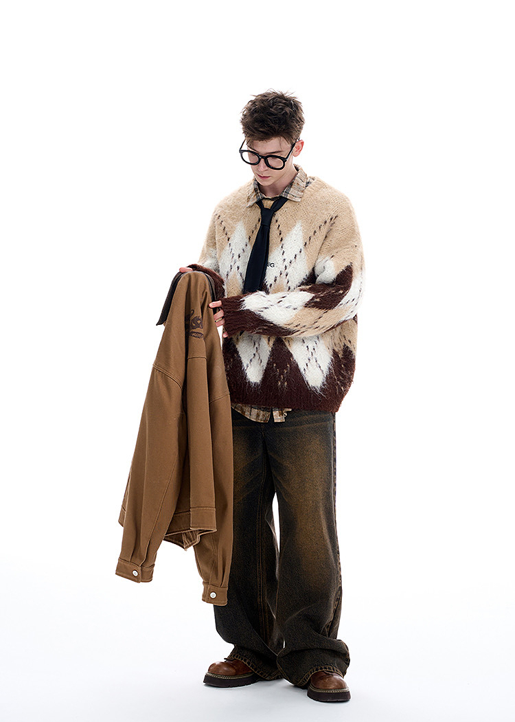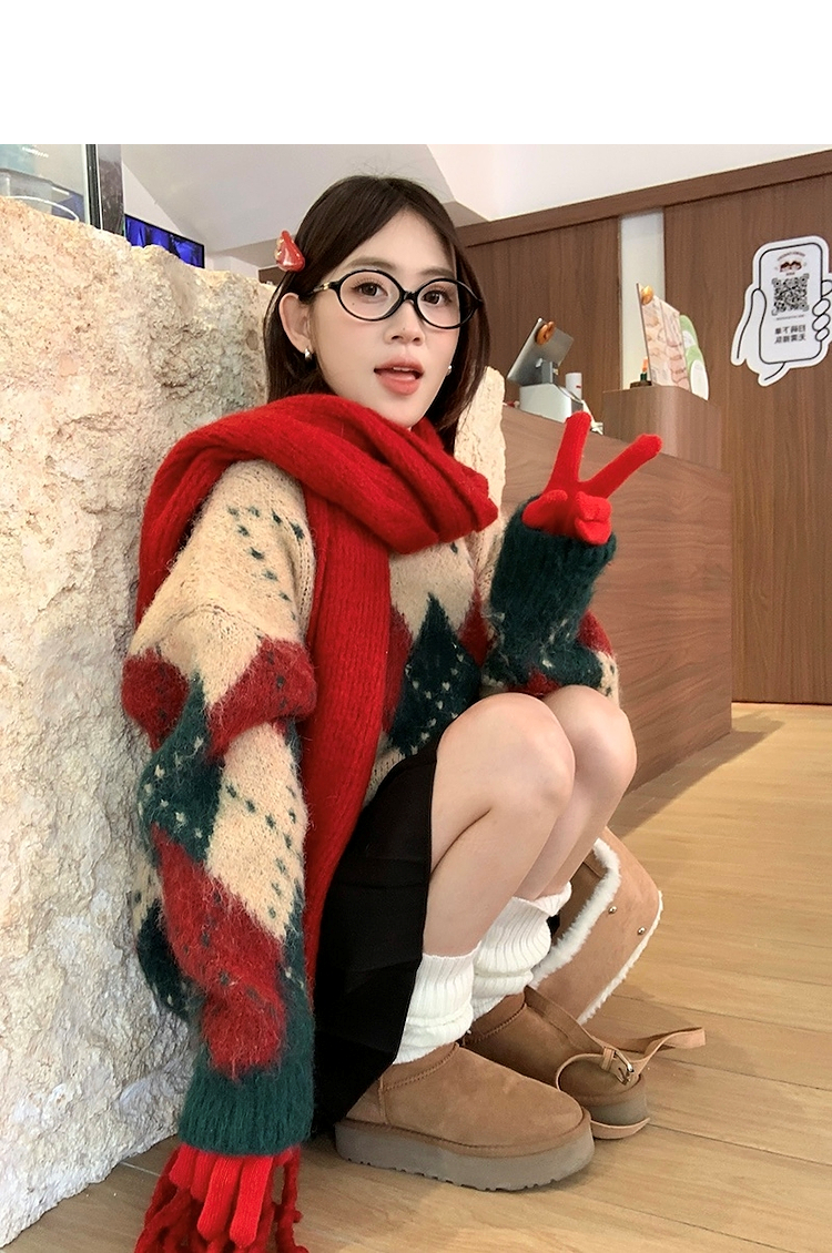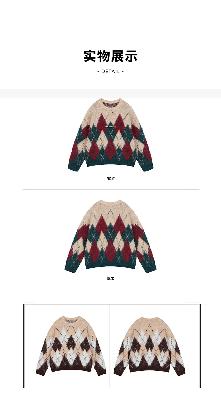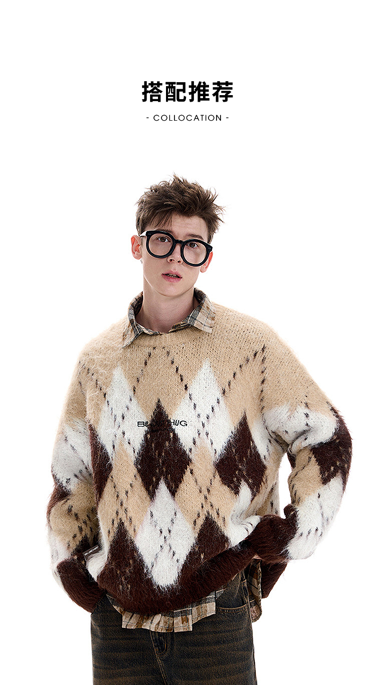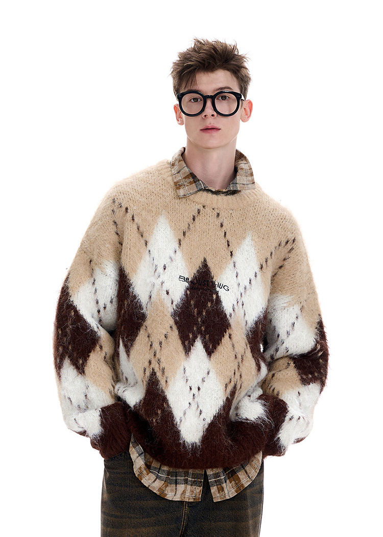 西遇费尔岛毛衣女2025年冬季新款菱形格慵懒圆领套头针织衫SS060002