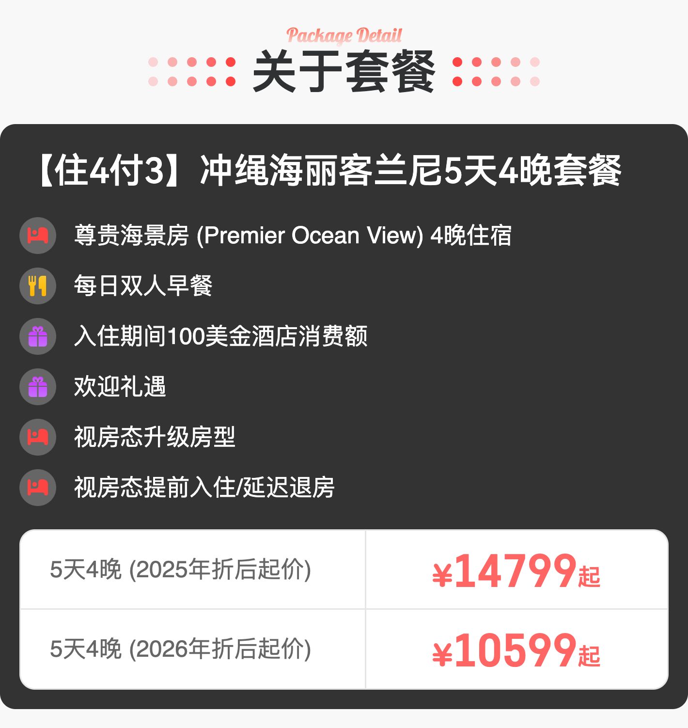5天4晚【冲绳海丽客兰尼酒店 | Halekulan Okinawa | 实时代订】住4付3,可用至2026年3月!入住超美视角海景房,享双人早餐、100美金消费额、免费升房等权益~