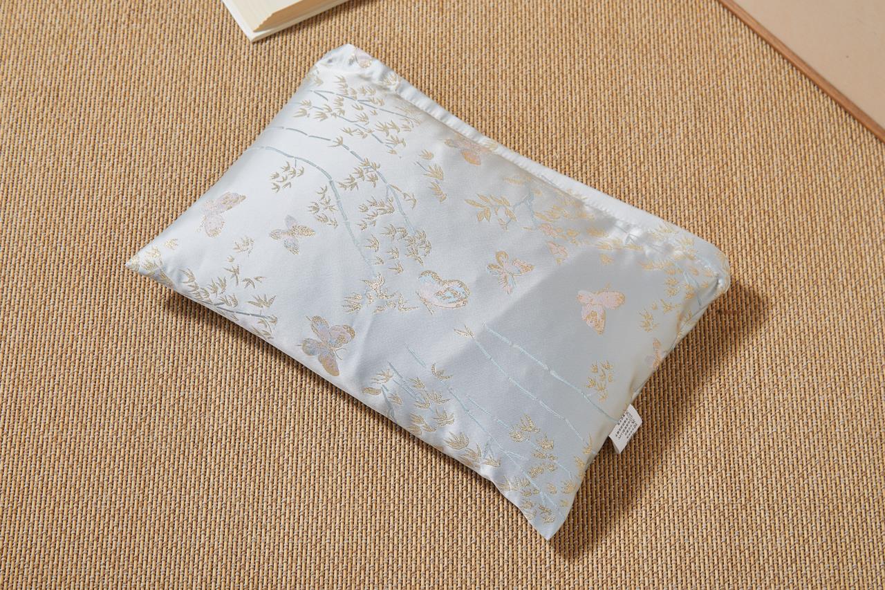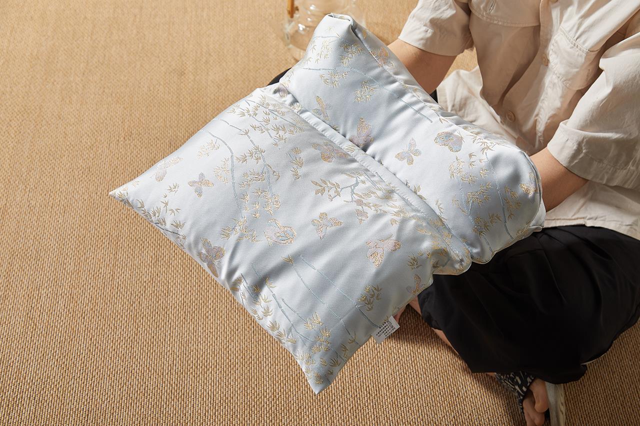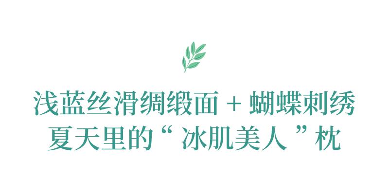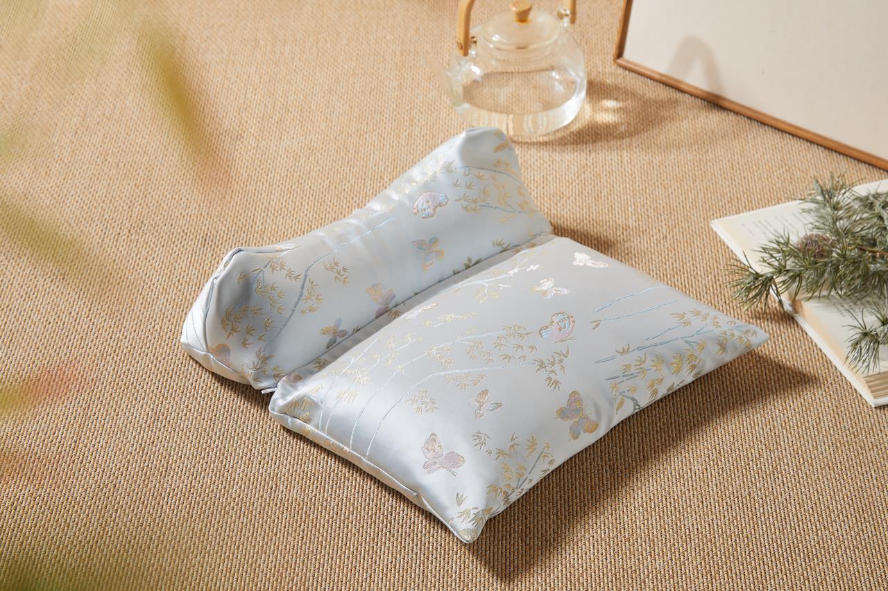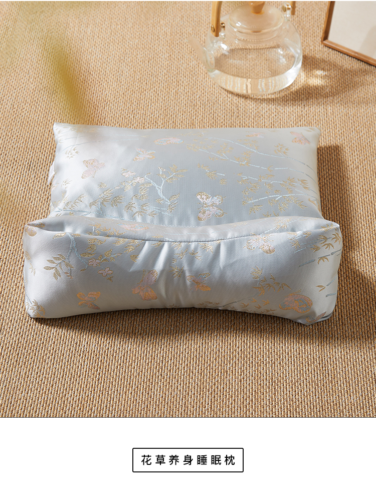 花草养身睡眠枕特别选用清爽的浅蓝色锦纶绸缎,配上精致的中式蝴蝶刺绣,视觉上就带来一股清凉感!