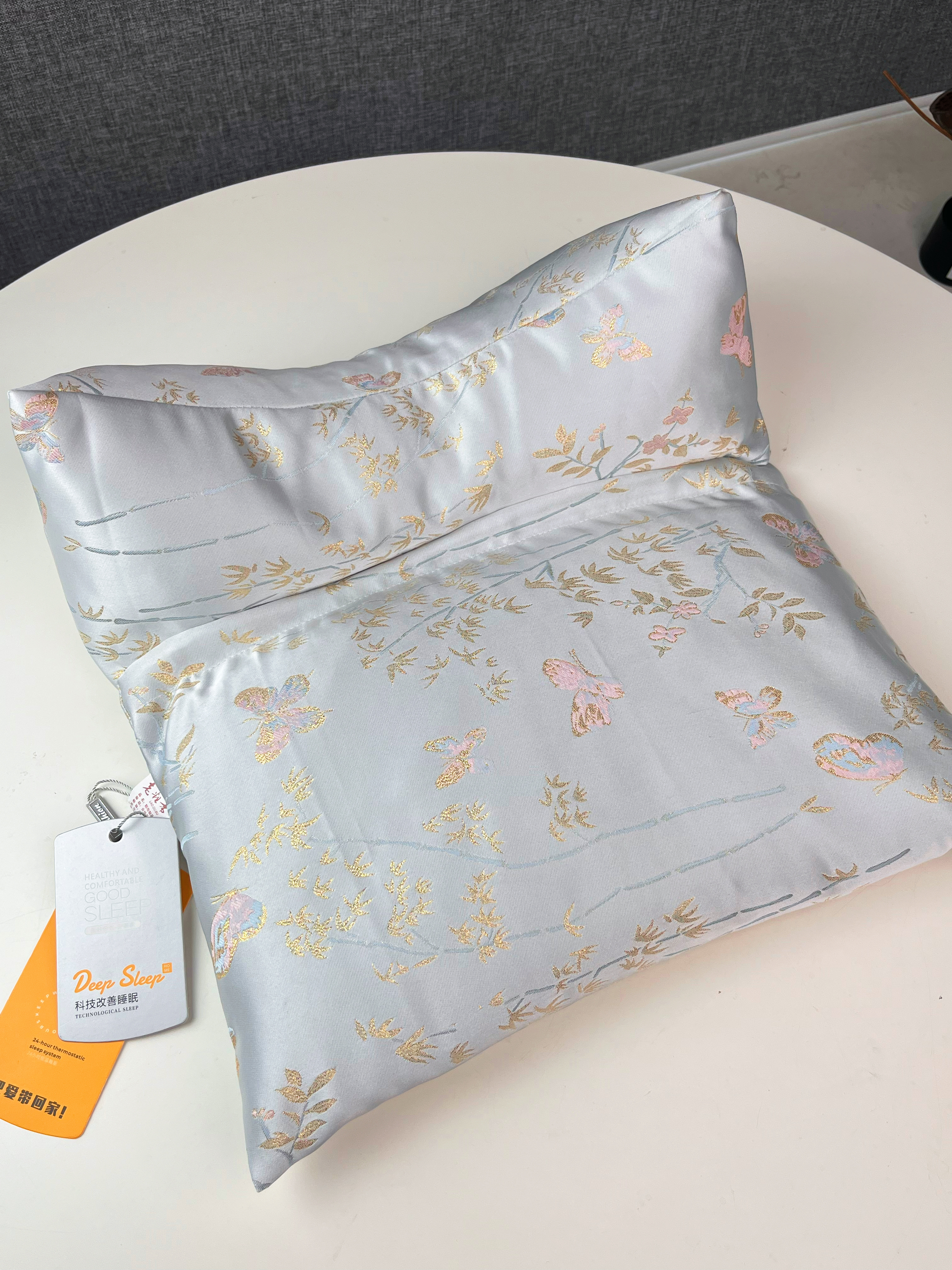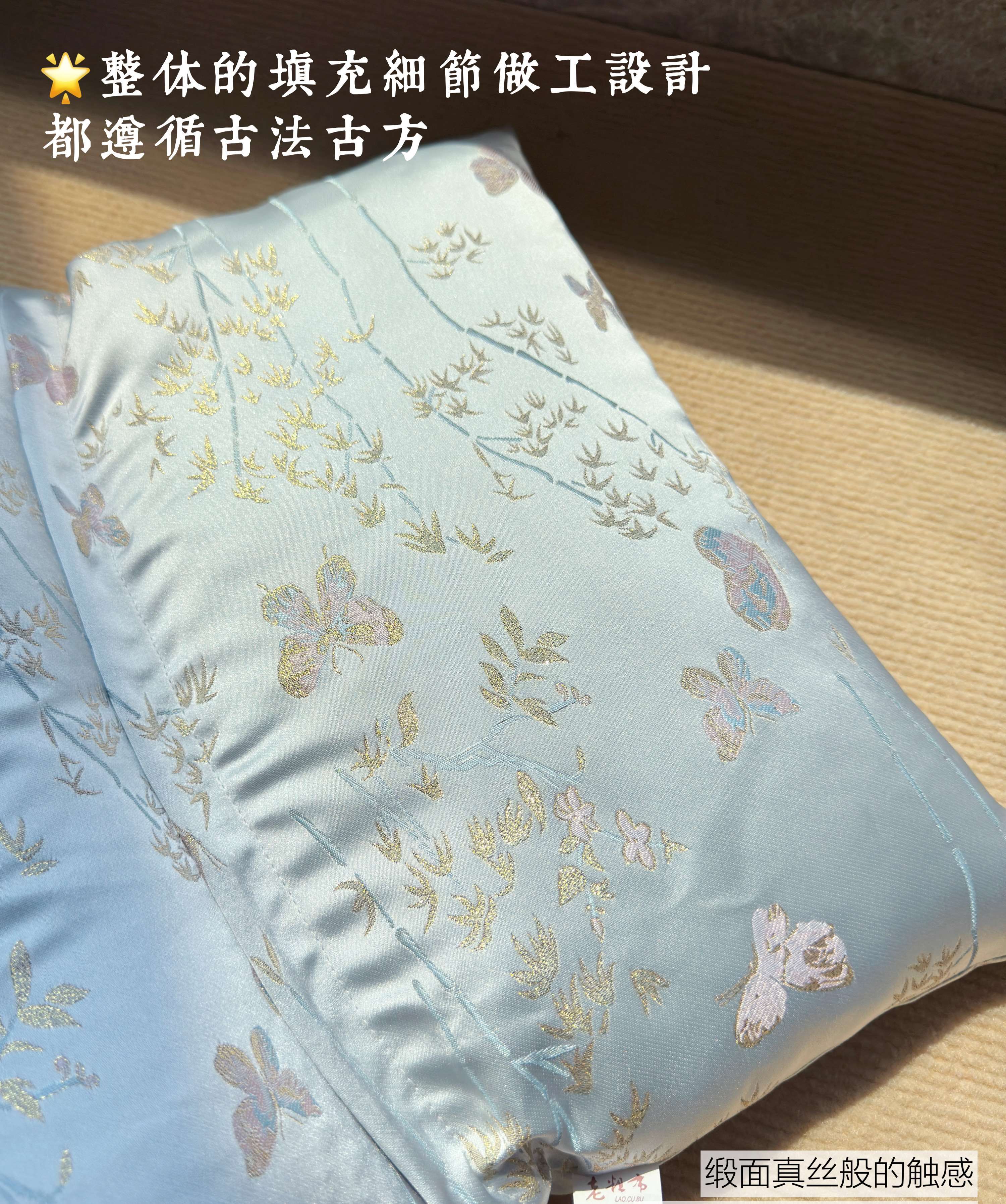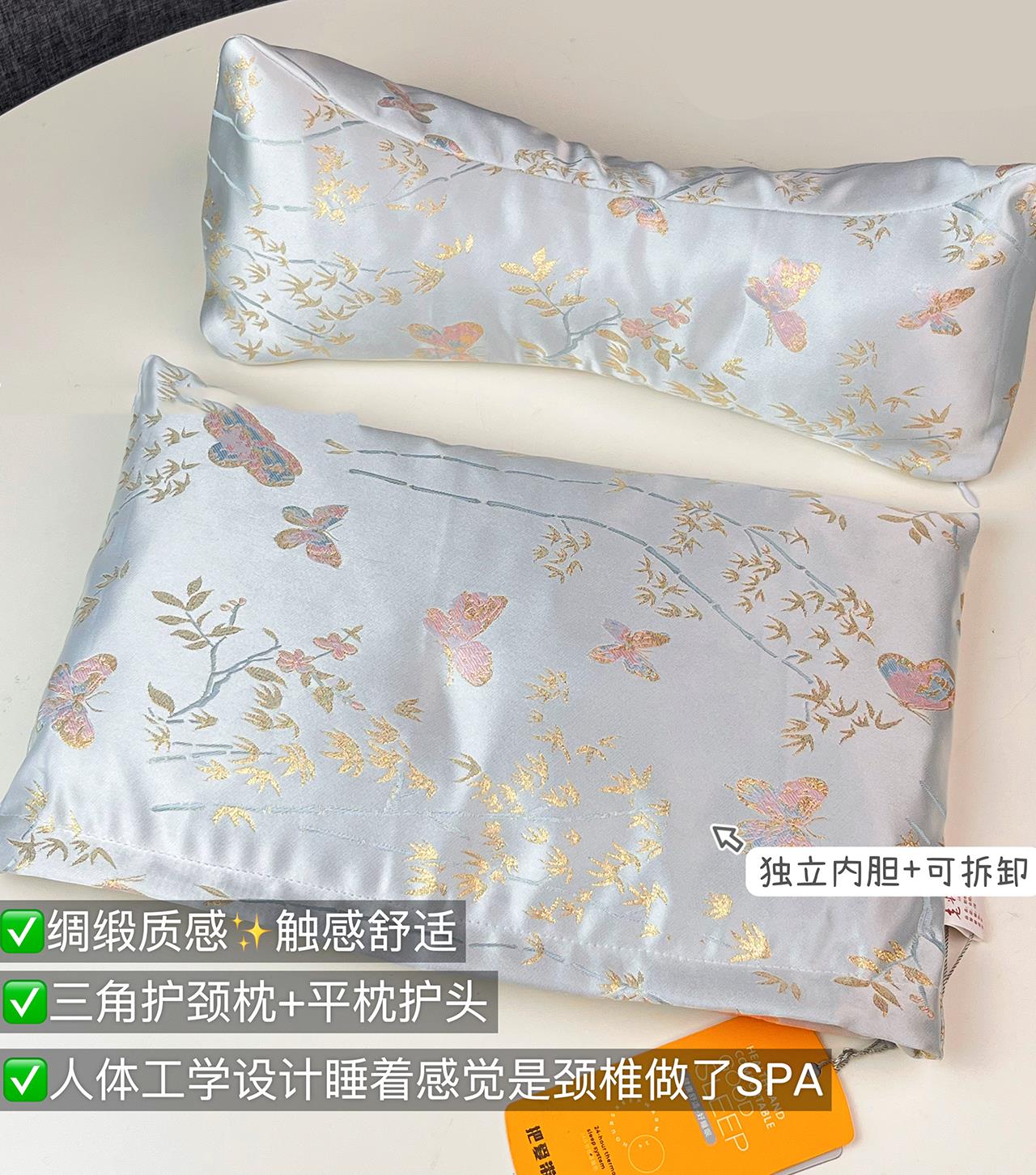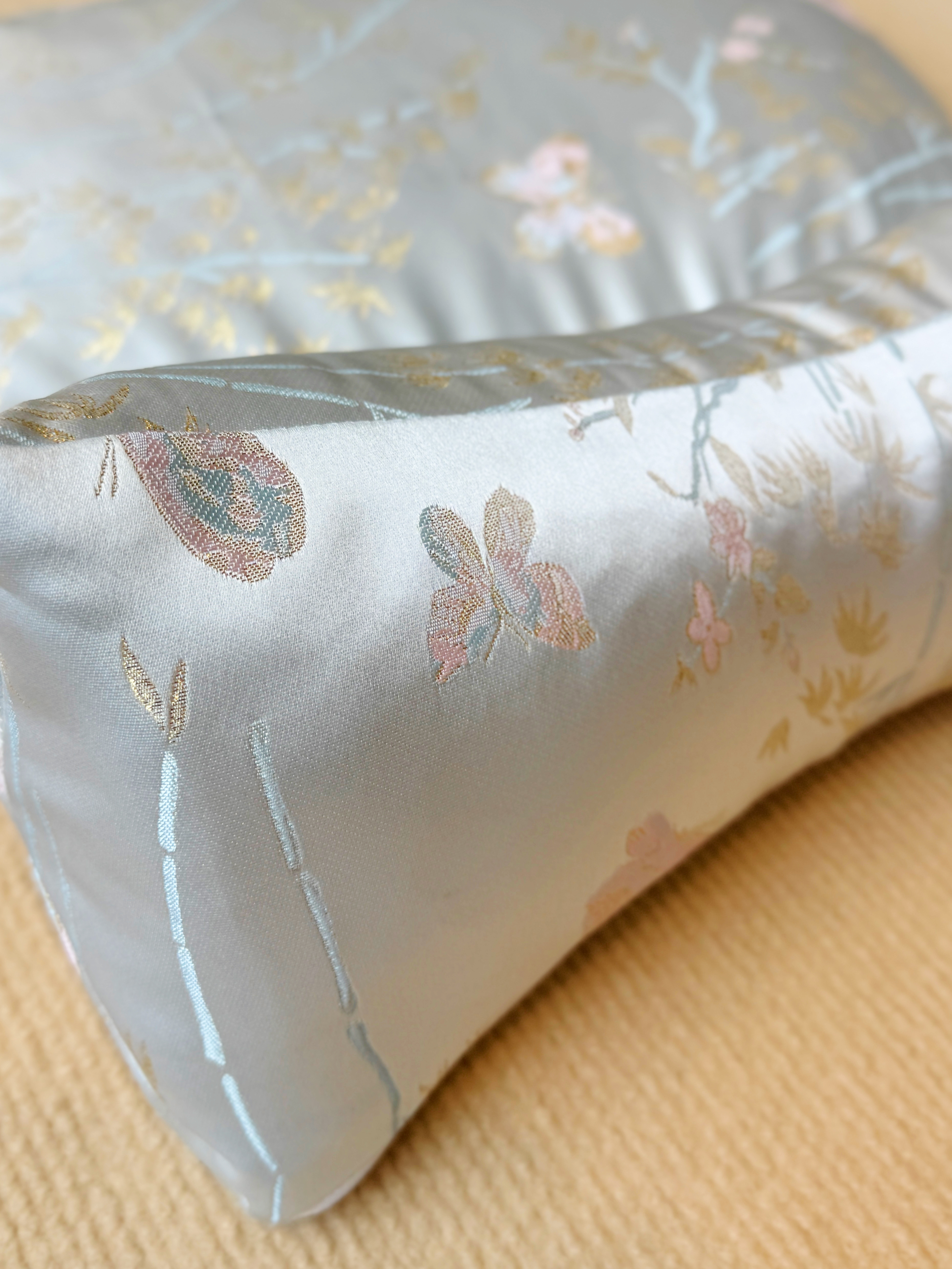 花草养身睡眠枕特别选用清爽的浅蓝色锦纶绸缎,配上精致的中式蝴蝶刺绣,视觉上就带来一股清凉感!