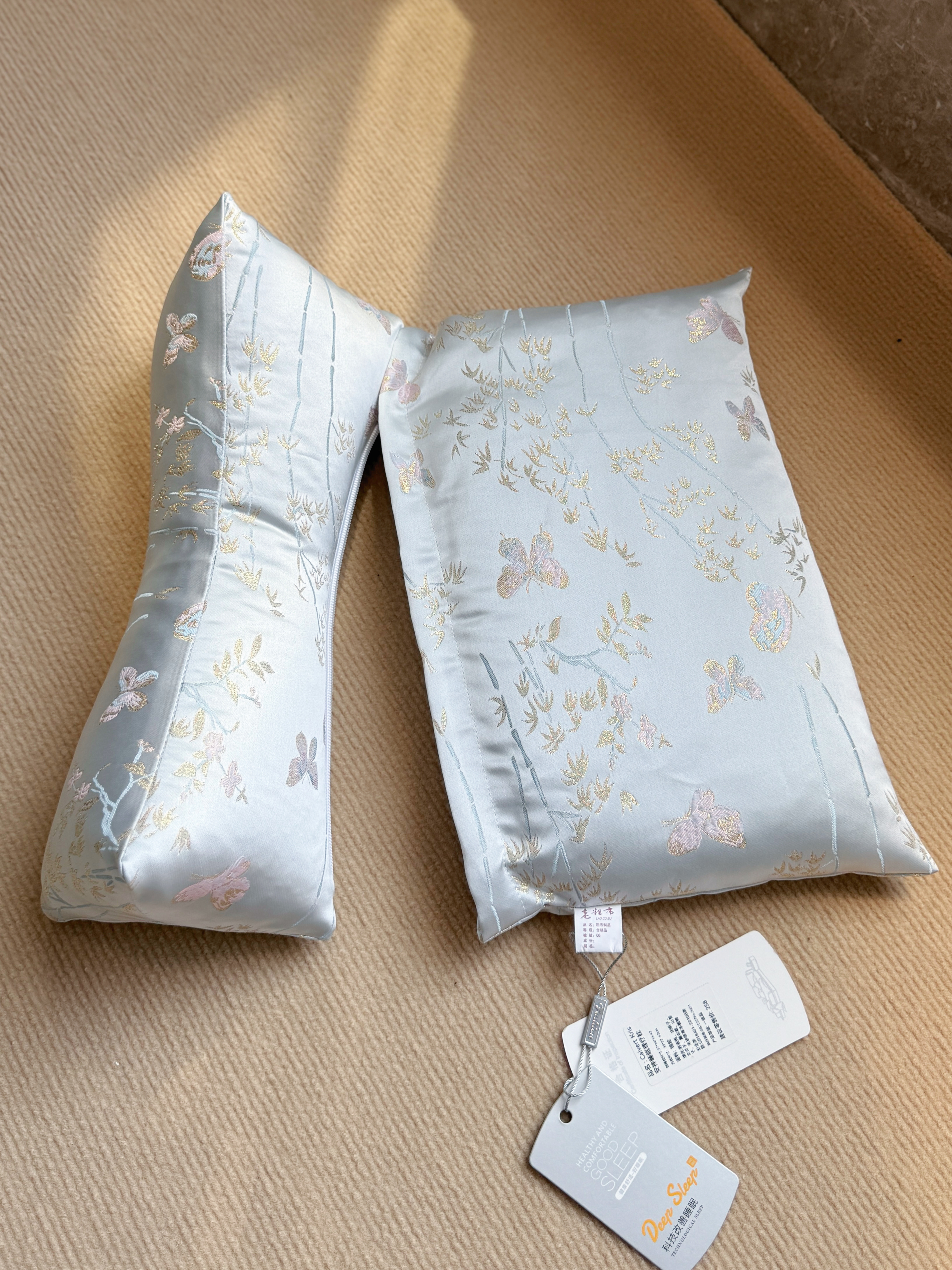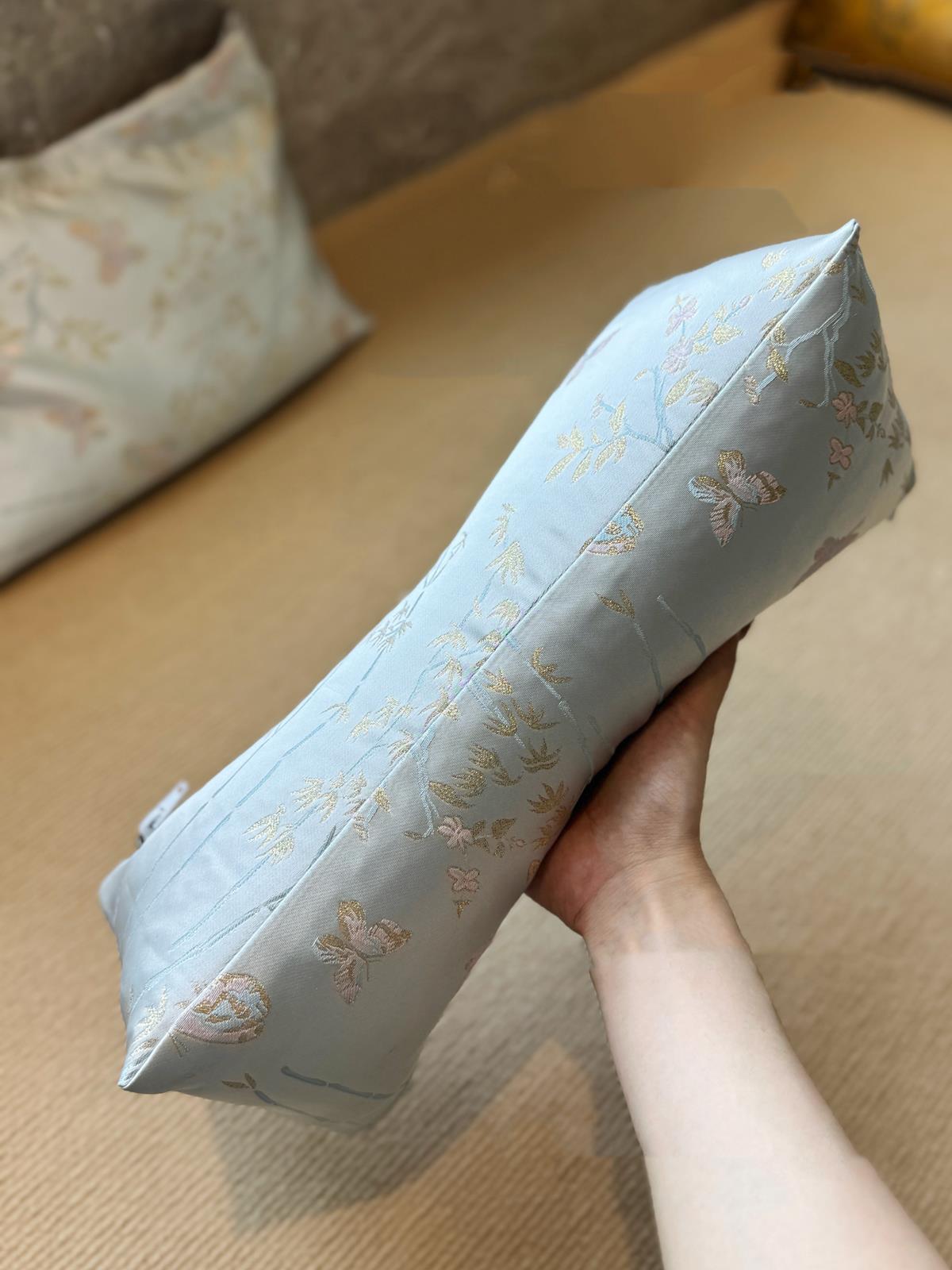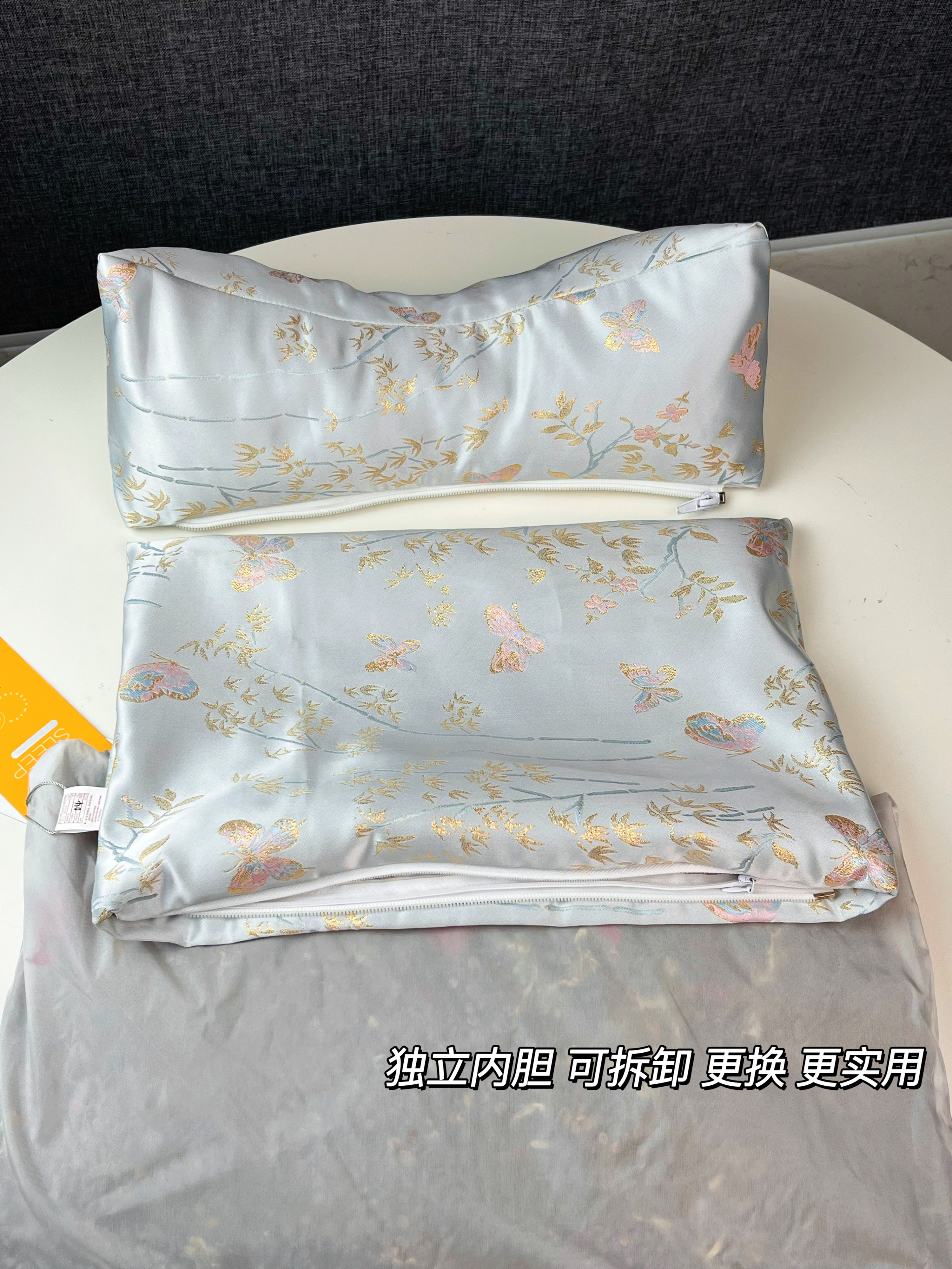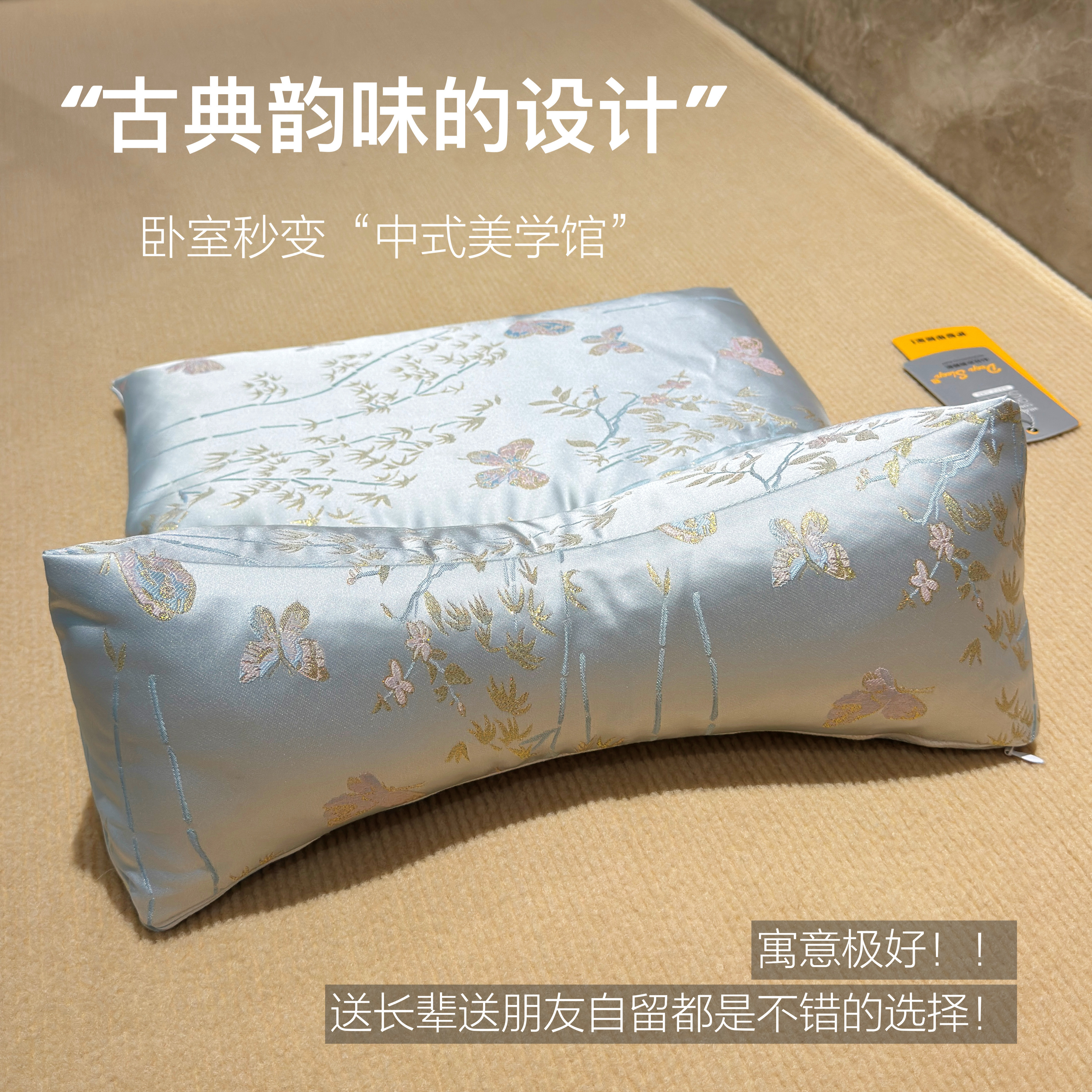 枕套上绣有蝴蝶,“蝴”与“福”谐音,纳福之意,寓意美好: 灵动的蝴蝶穿梭于浅蓝底布之上,寓意幸福,同时充满东方雅韵。