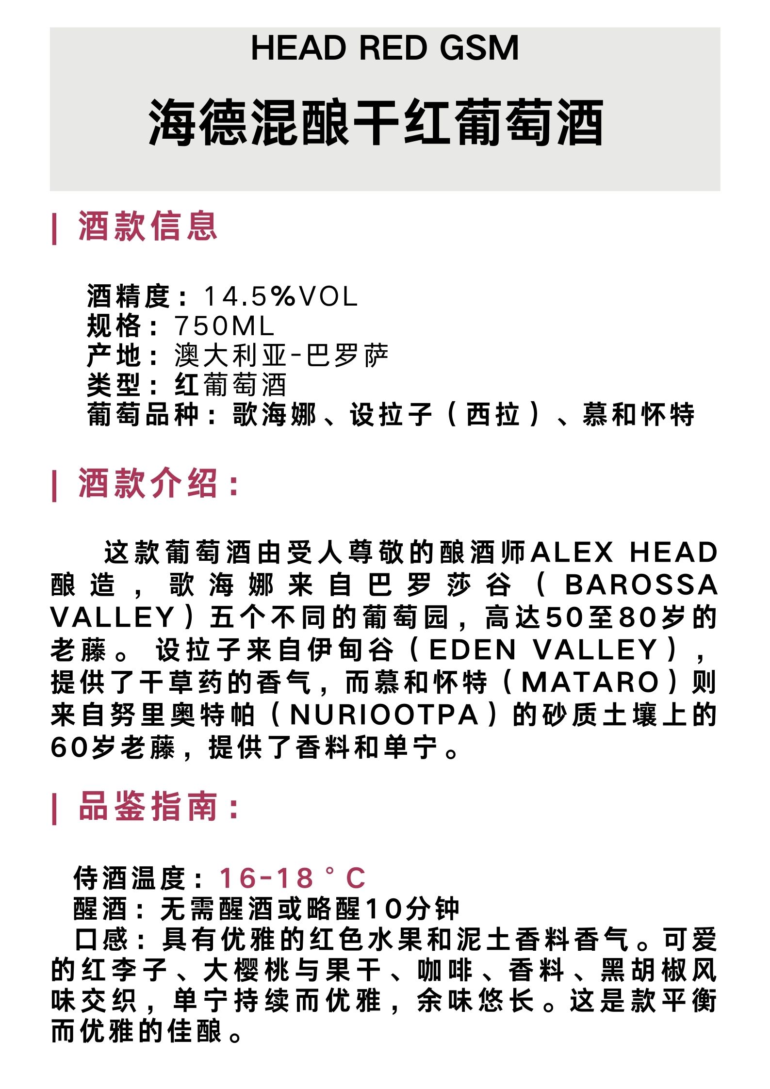 海德混酿干红葡萄酒2015 HEAD RED GSM (Grenache, Shiraz, Mataro)2015