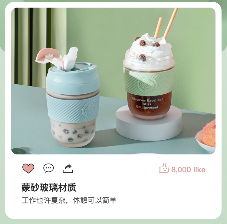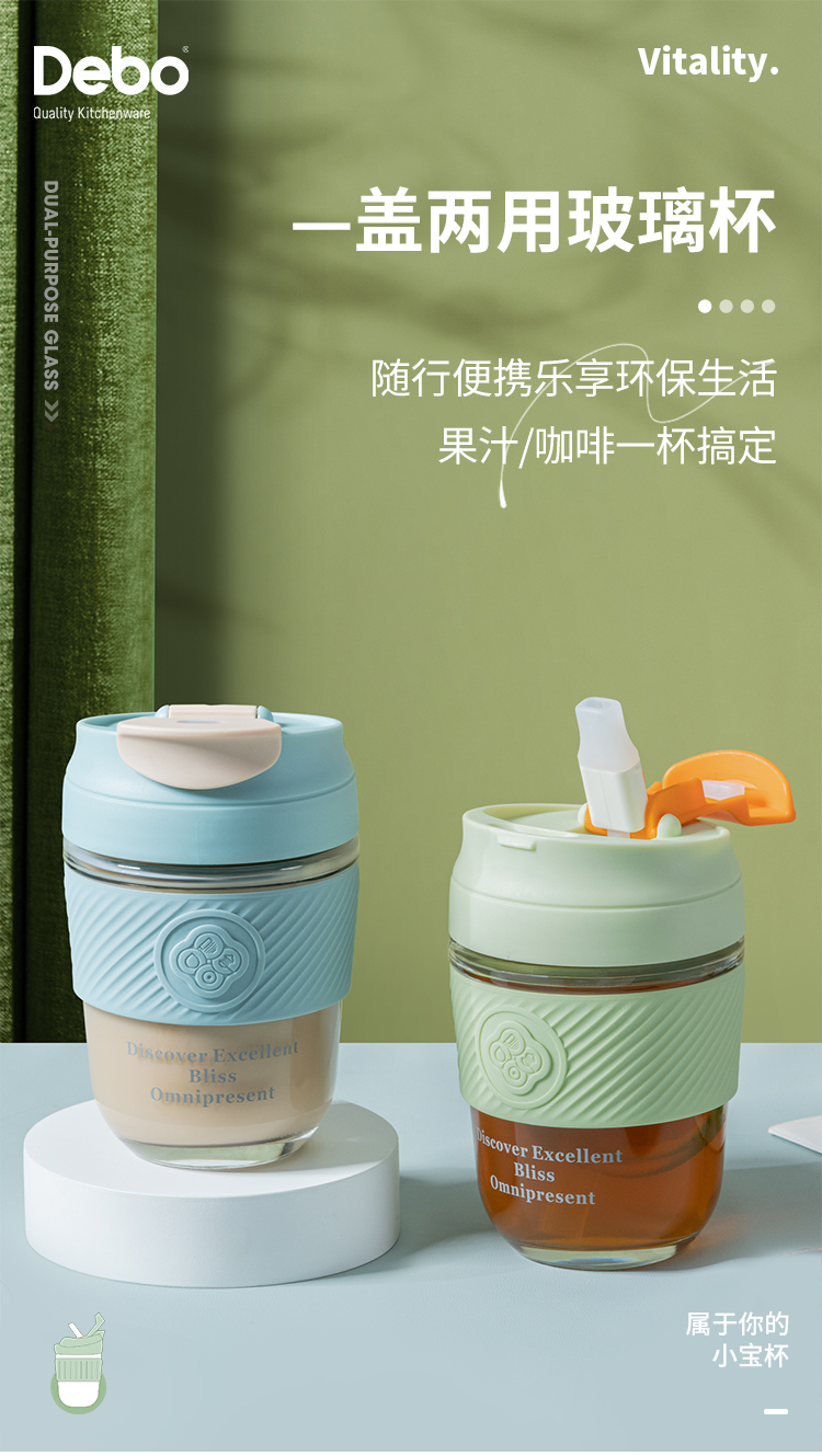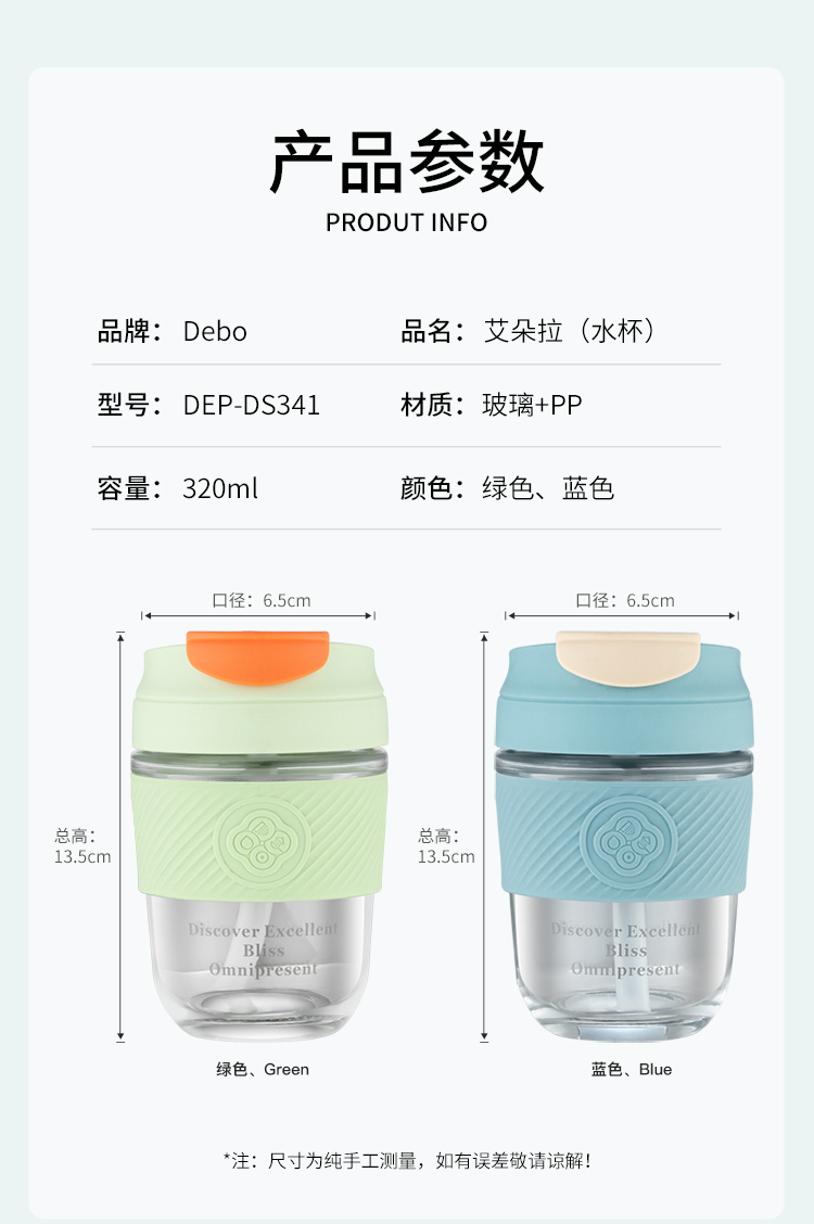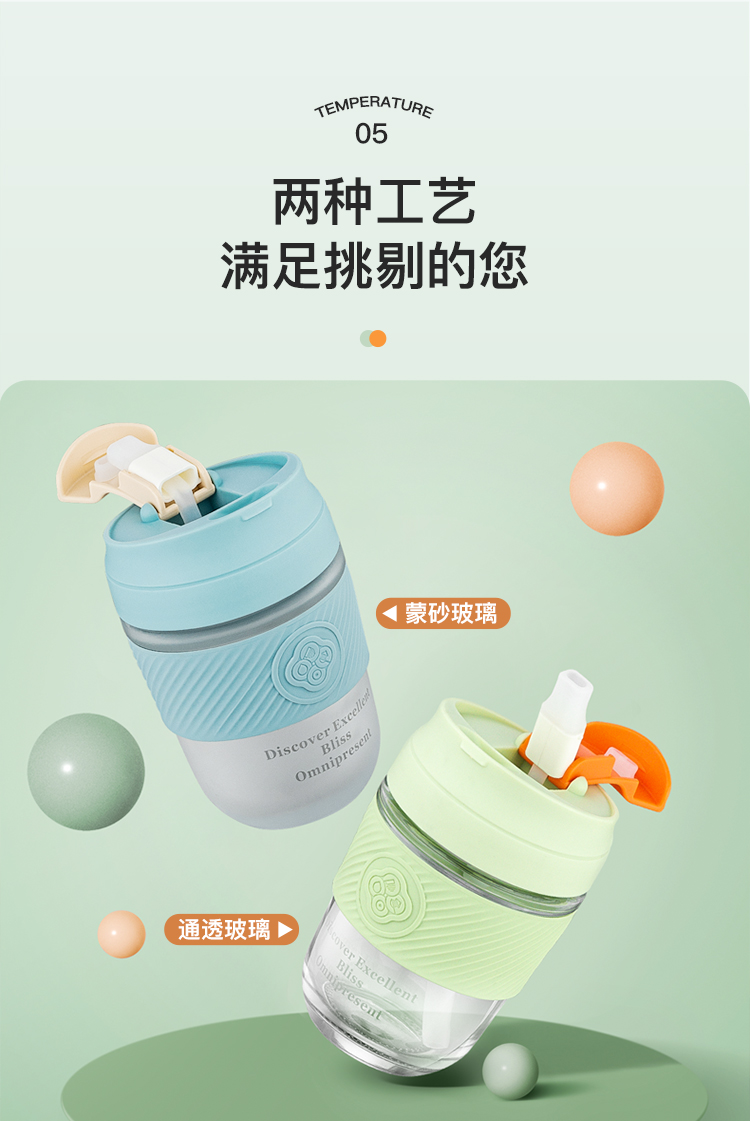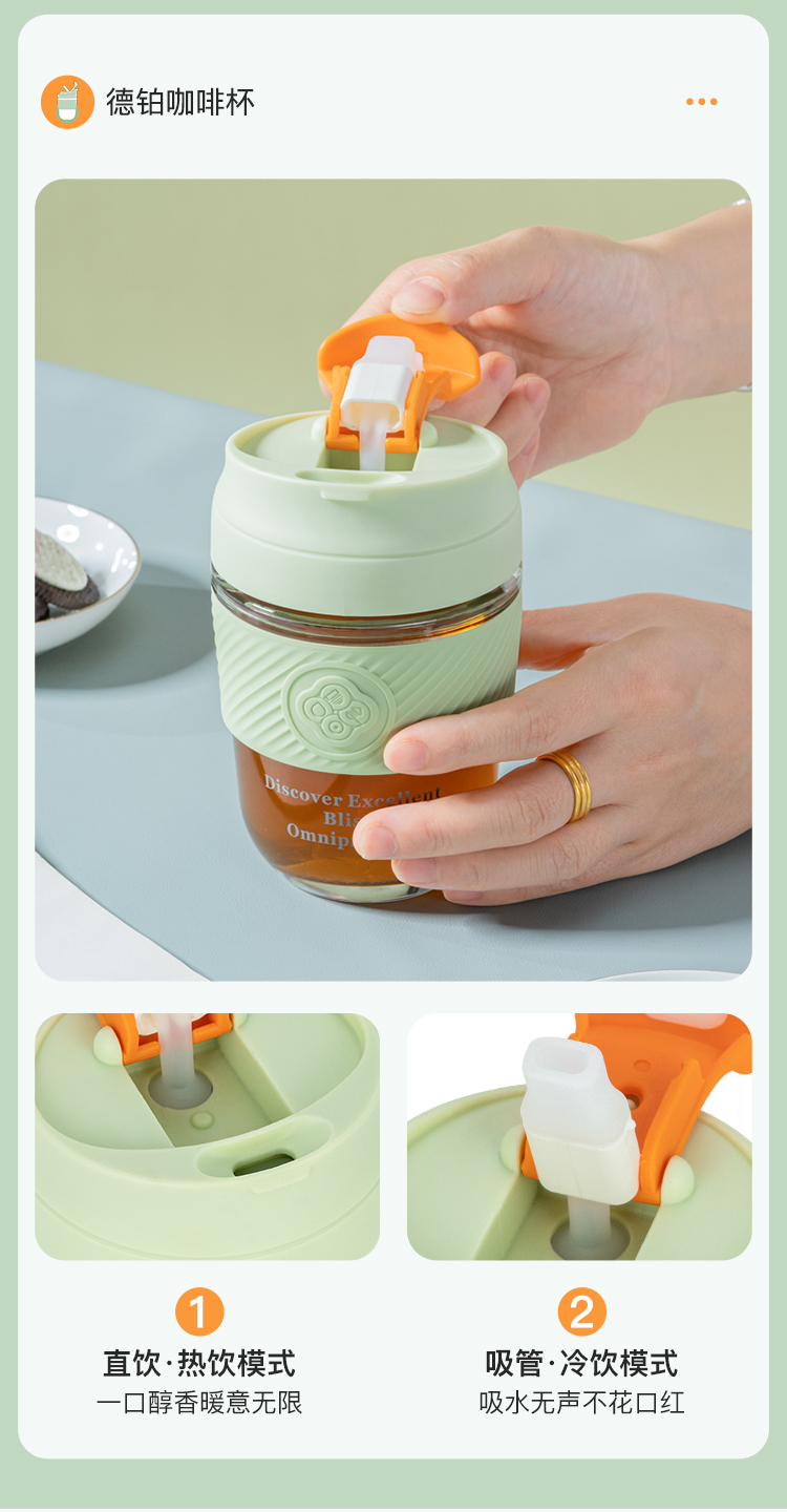 Debo德铂艾朵拉玻璃杯便携小清新有盖吸管杯套创意办公圆形大容量咖啡杯320毫升