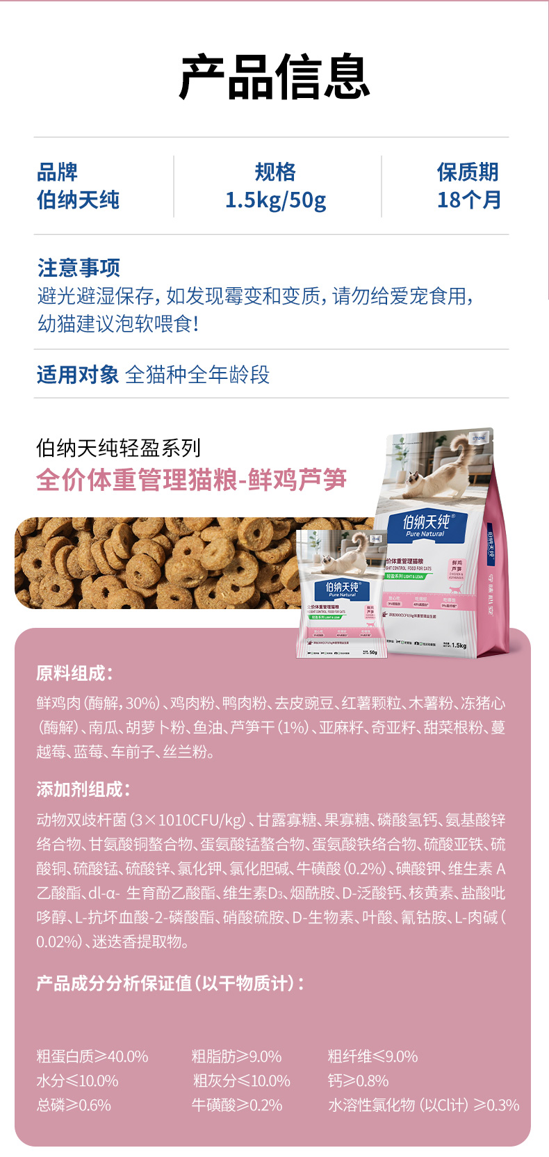 伯纳天纯轻盈低脂全价猫粮轻体控制体重肥胖猫咪专用鲜肉鲜鸡芦笋