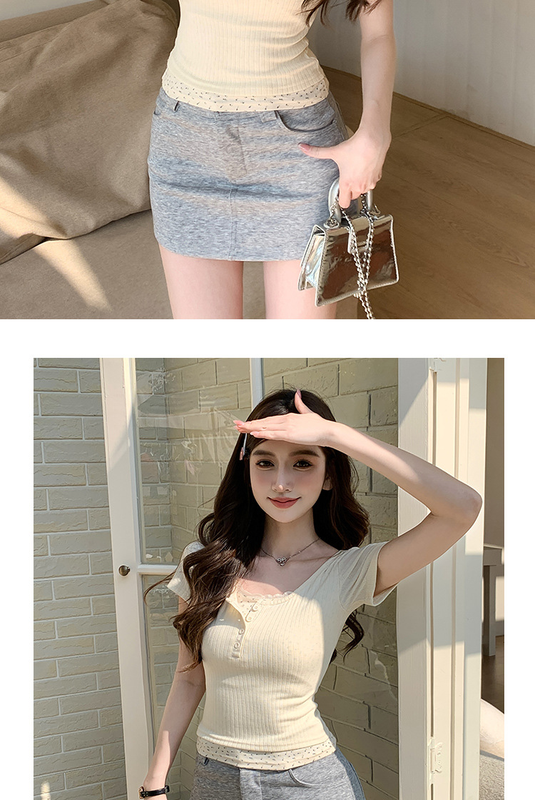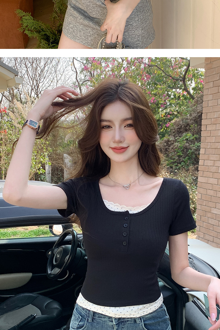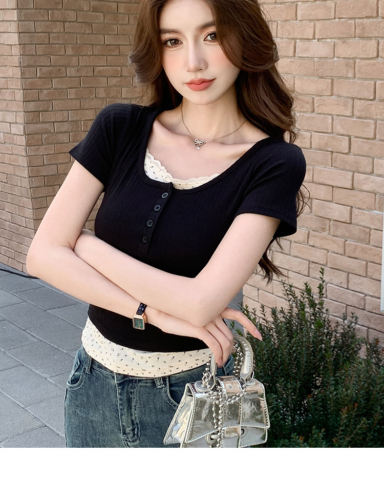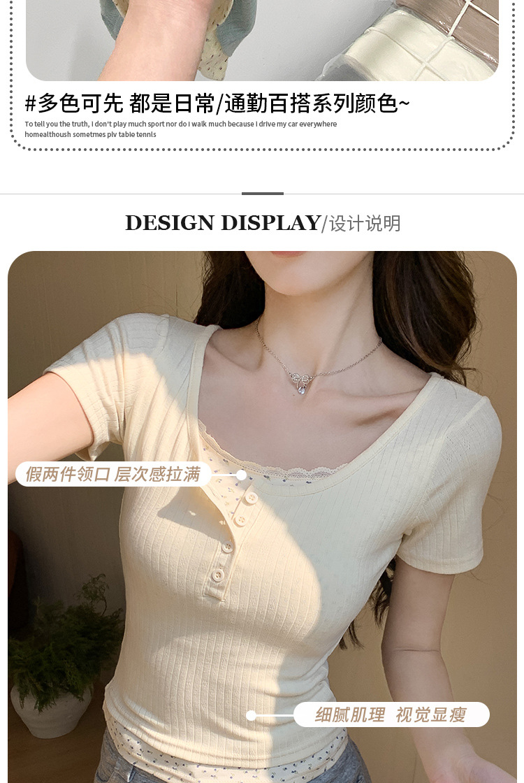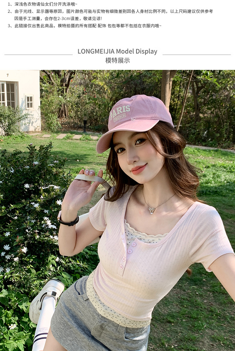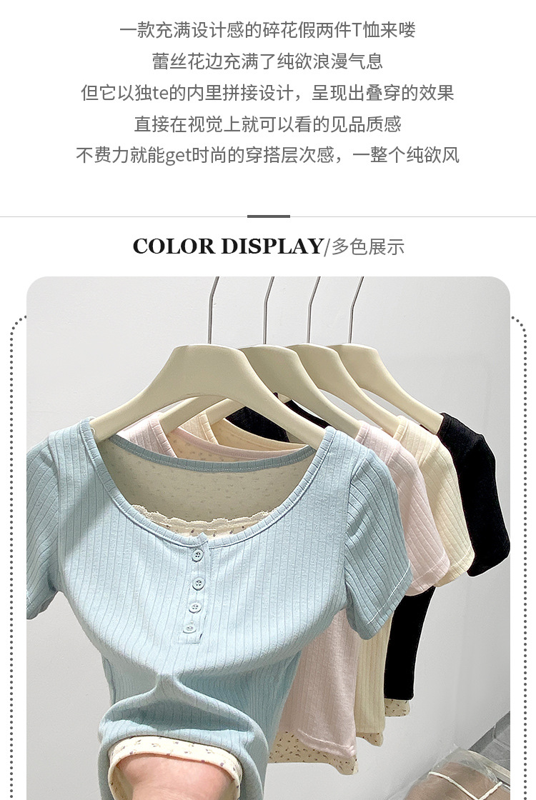 蕾丝花边拼接假两件短袖T恤女内搭修身显瘦外穿条纹打底衫上衣 商品图6