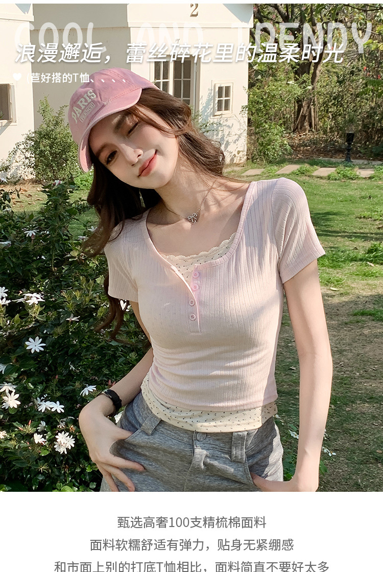 蕾丝花边拼接假两件短袖T恤女内搭修身显瘦外穿条纹打底衫上衣