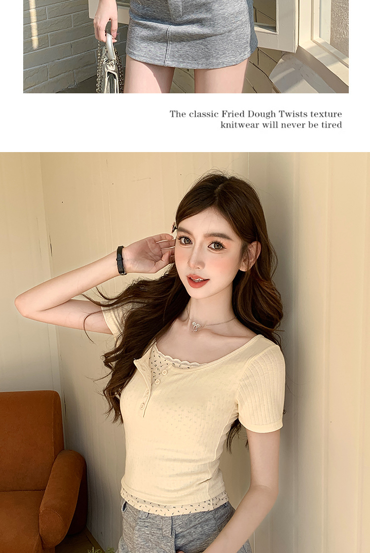 蕾丝花边拼接假两件短袖T恤女内搭修身显瘦外穿条纹打底衫上衣 商品图4