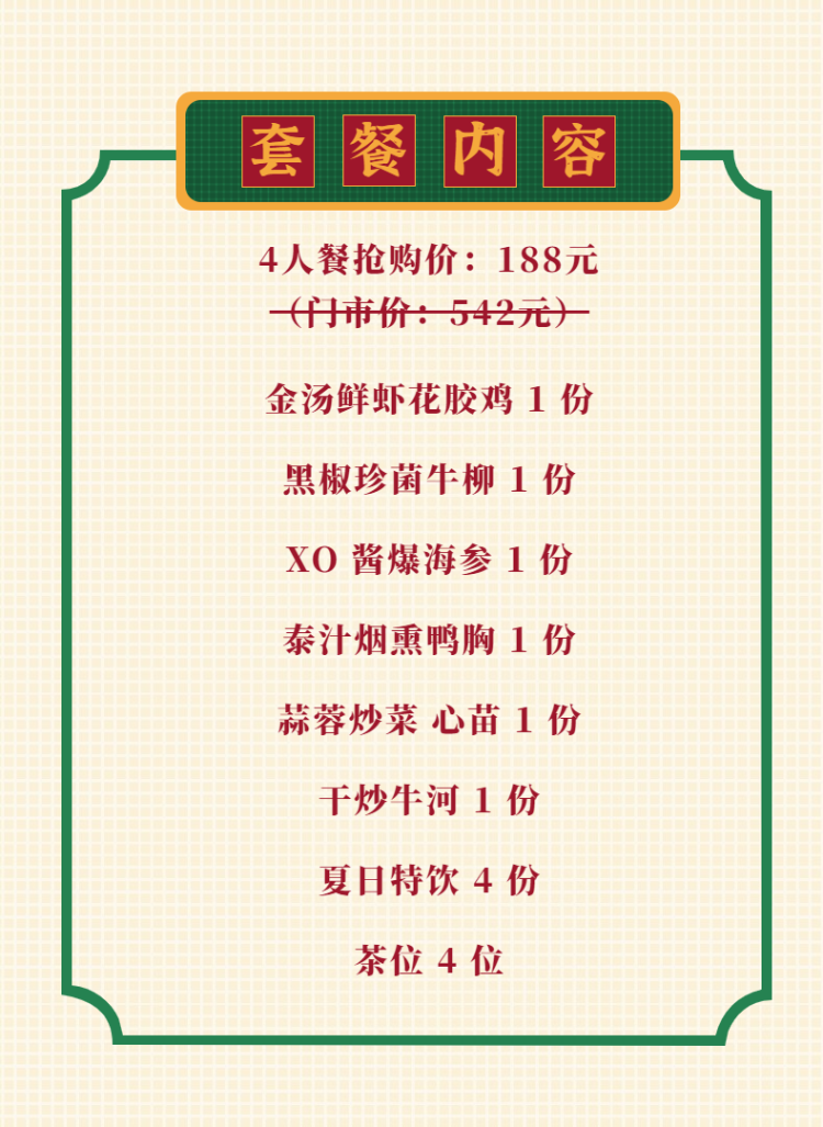 ◆ 套餐包含菜品需1次消费完毕,不可拆分不同日期享用,部分菜品若因时令或其他不可抗因素导致无法提供,将视实际情况以等价菜品替换