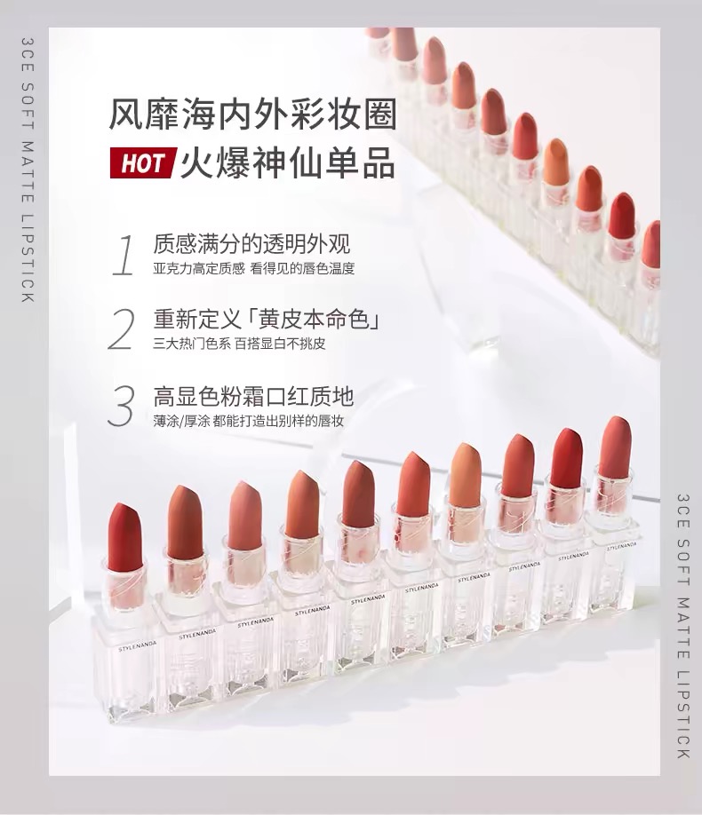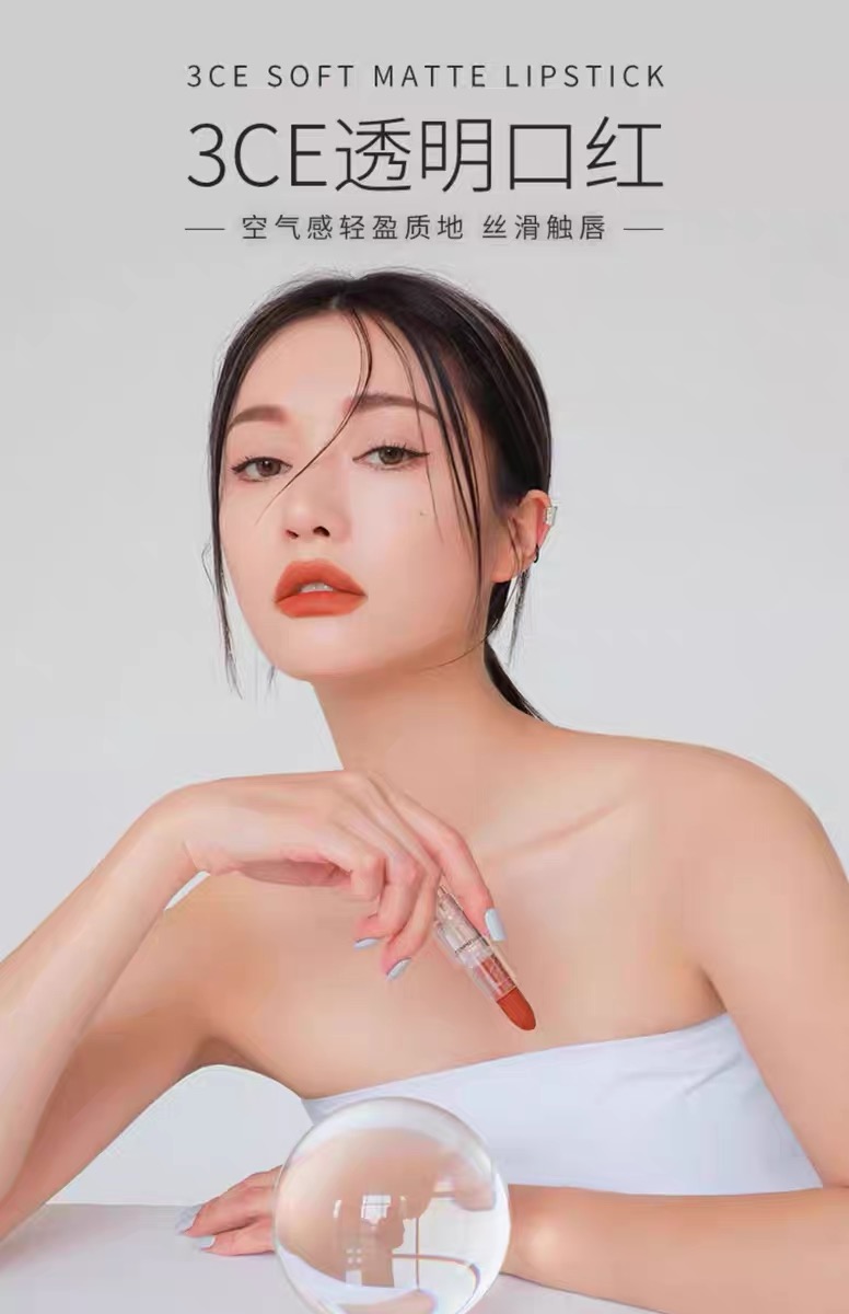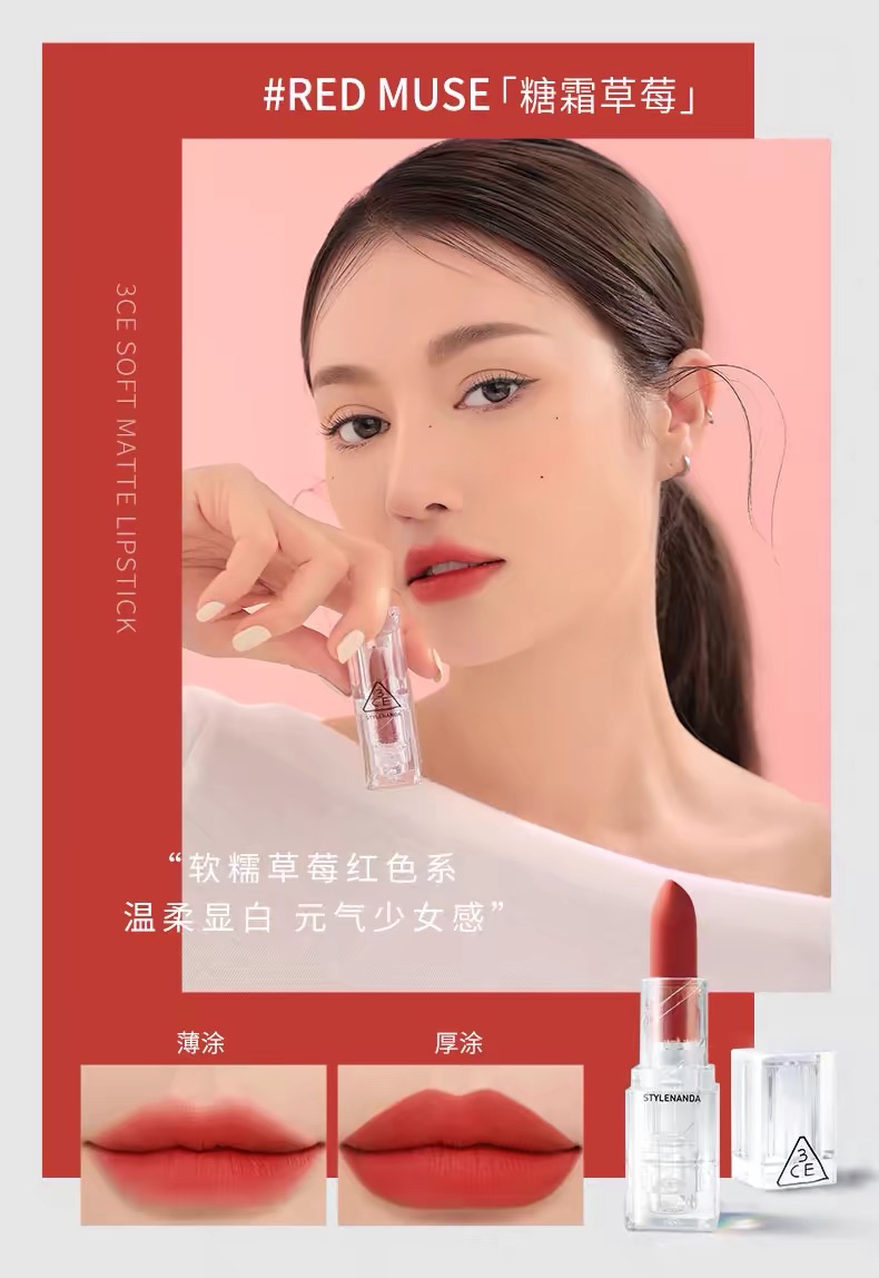 3CE透明壳口红柔雾哑光唇膏#RED MUSE糖霜草莓