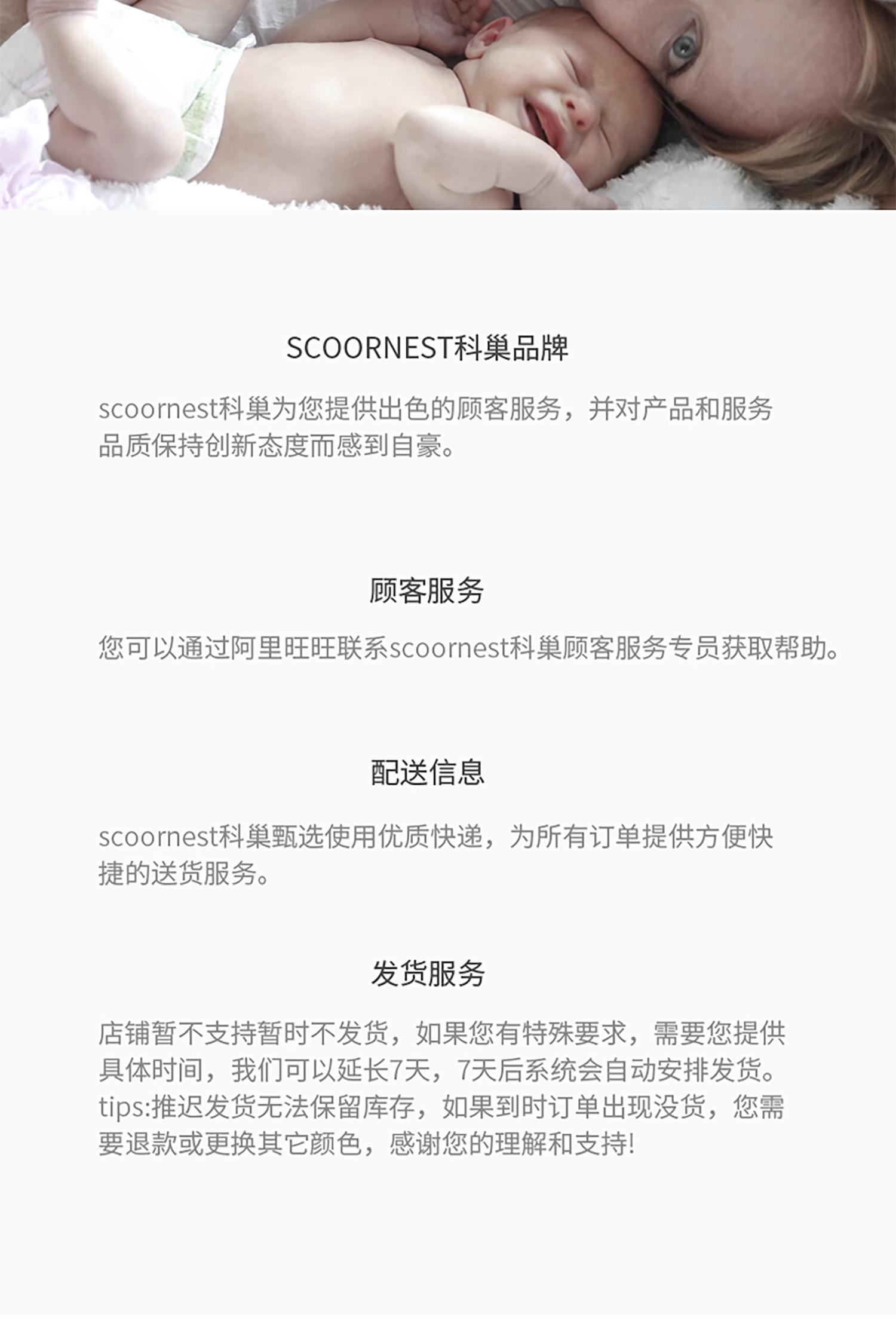 - Scoornest始终秉承给每一位宝宝送去科学的、关心的、创新的成长体验,通过提供商品和服务,使顾客形成守护、发展、巩固这种弥足珍贵的亲情的爱。